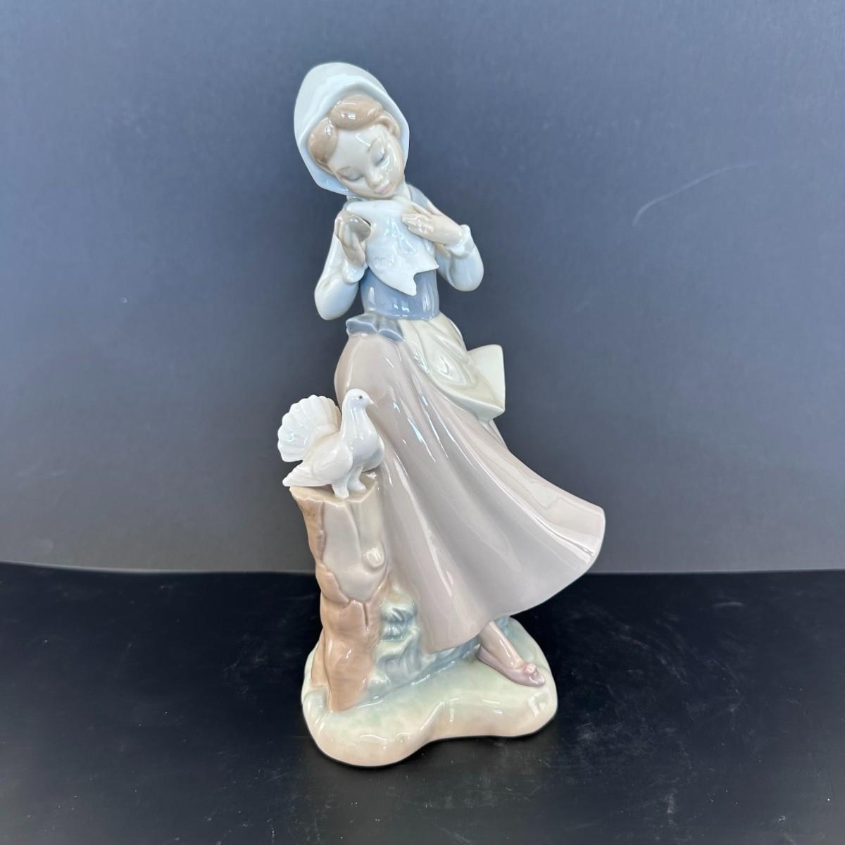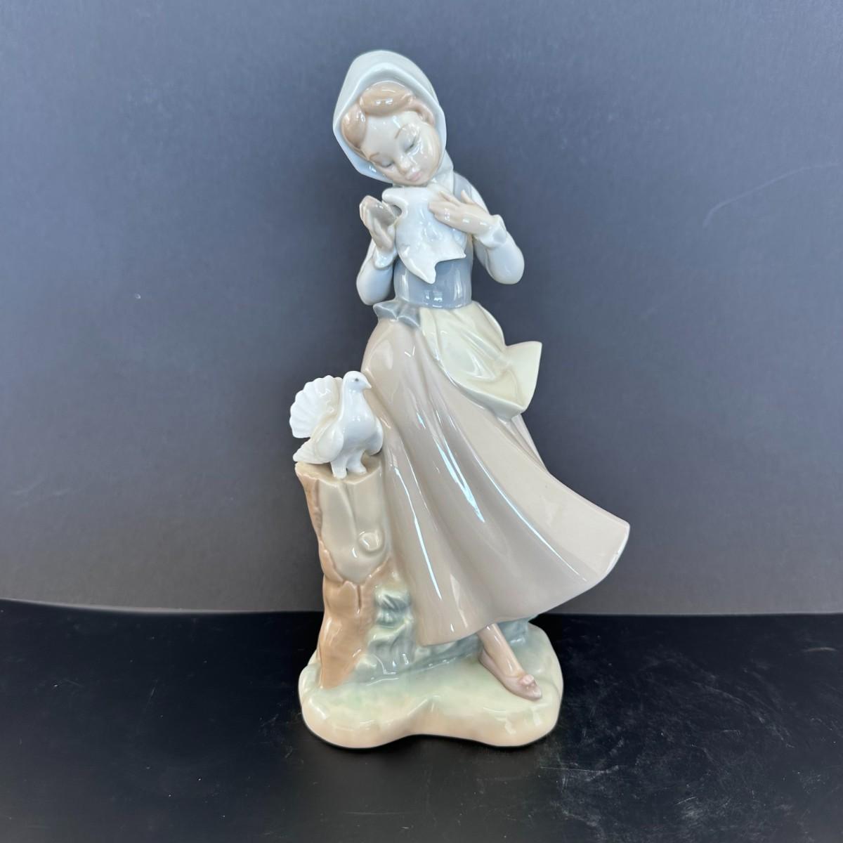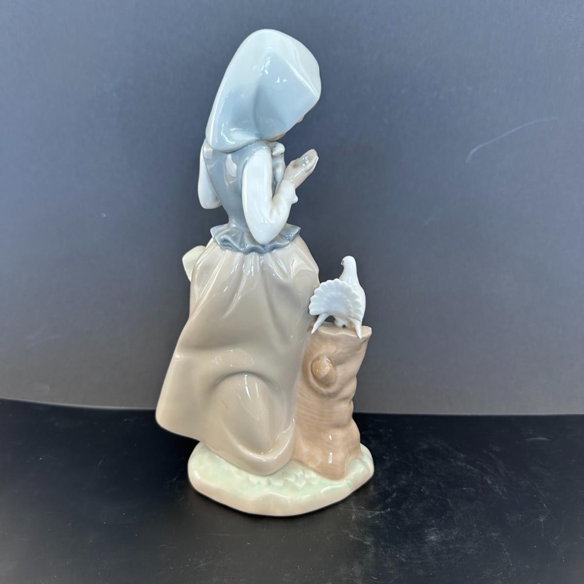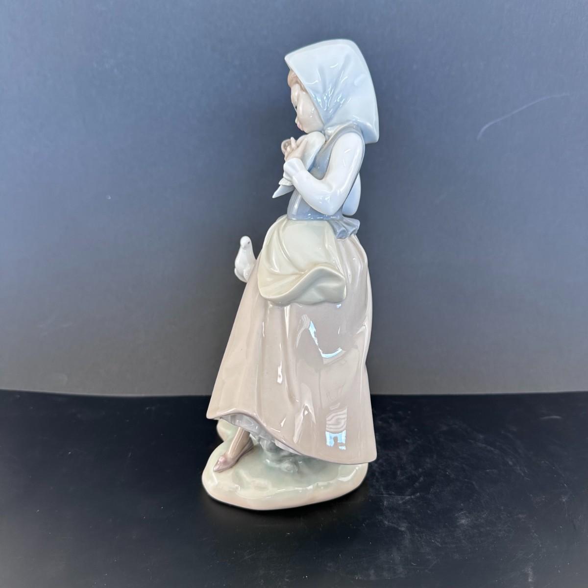 Description: Lladro figurine number 4915 is indeed titled "Girl with Pigeons" (sometimes referred to as "Niña con Palomas"). This charming figurine features a young girl tenderly holding or surrounded by pigeons. The girl is depicted in a thoughtful or gentle pose, interacting peacefully with the birds. The figurine has a soft, glazed finish that enhances the delicate details of the figures.