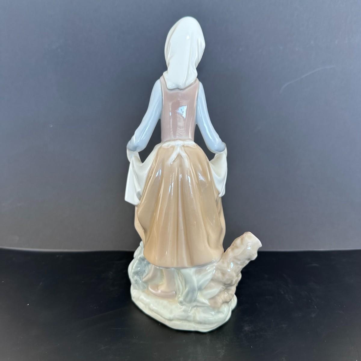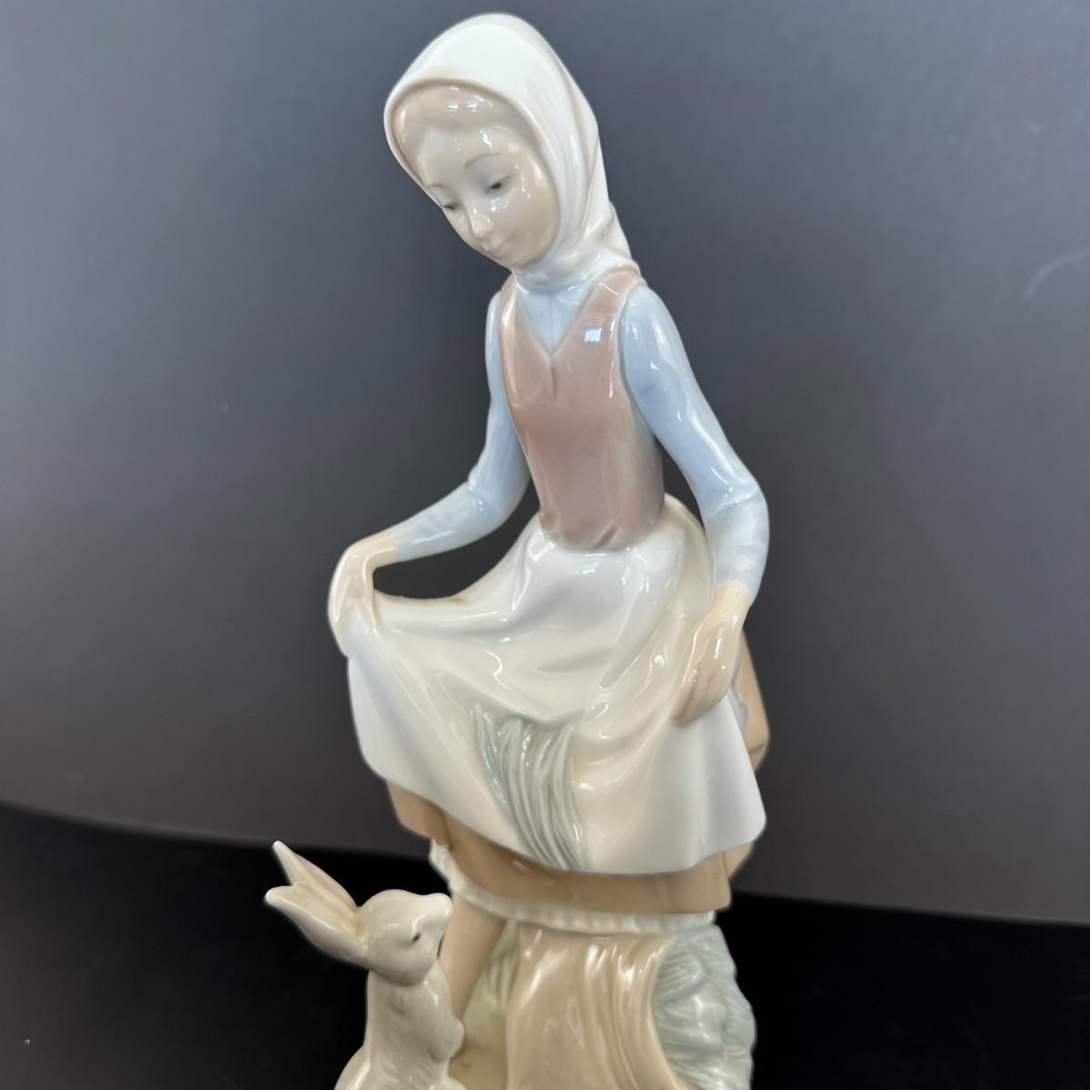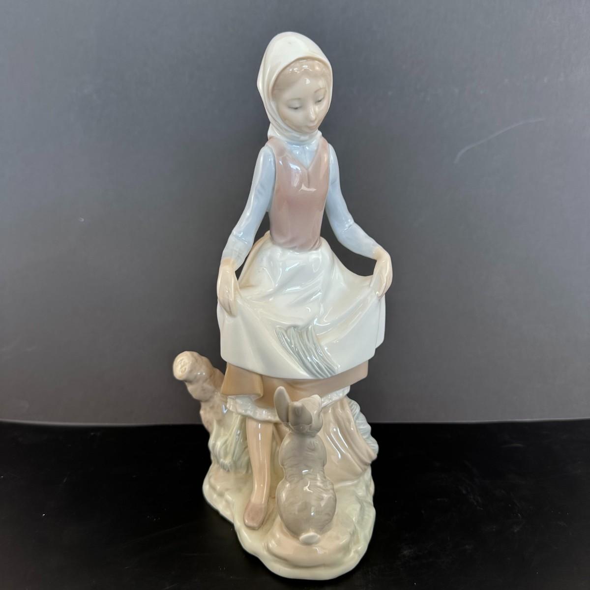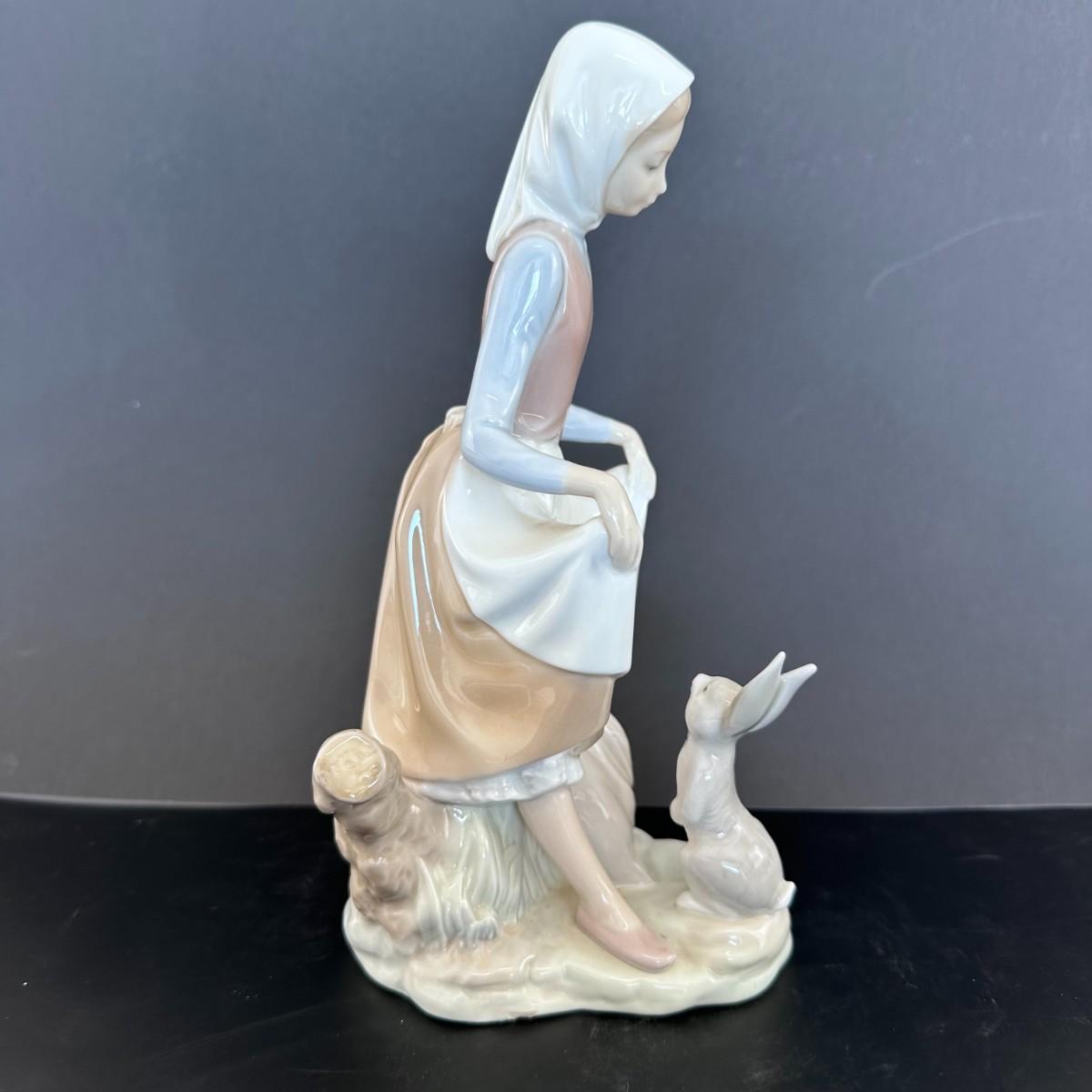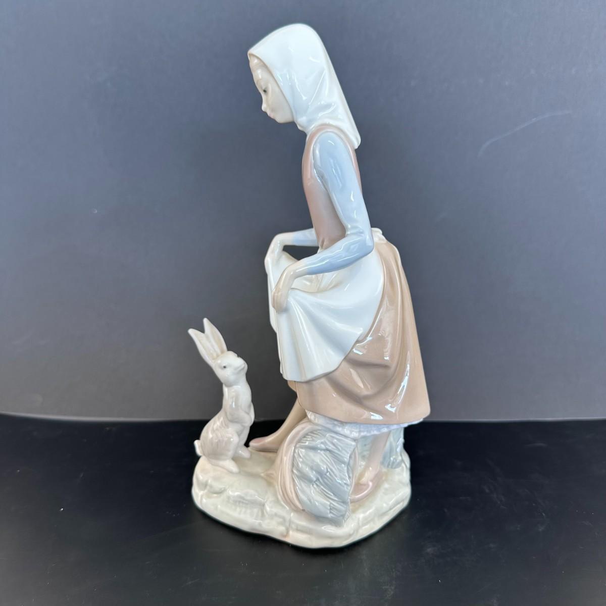 Description: Lladro figurine number 4826 is titled "Rabbit Food." This delightful figurine depicts a young girl, feeding a rabbit. It captures a sweet and gentle interaction between the child and the animals, emphasizing a moment of care and tenderness. The figurine has a glazed finish, highlighting the soft features of the child and the delicate details of the rabbit.