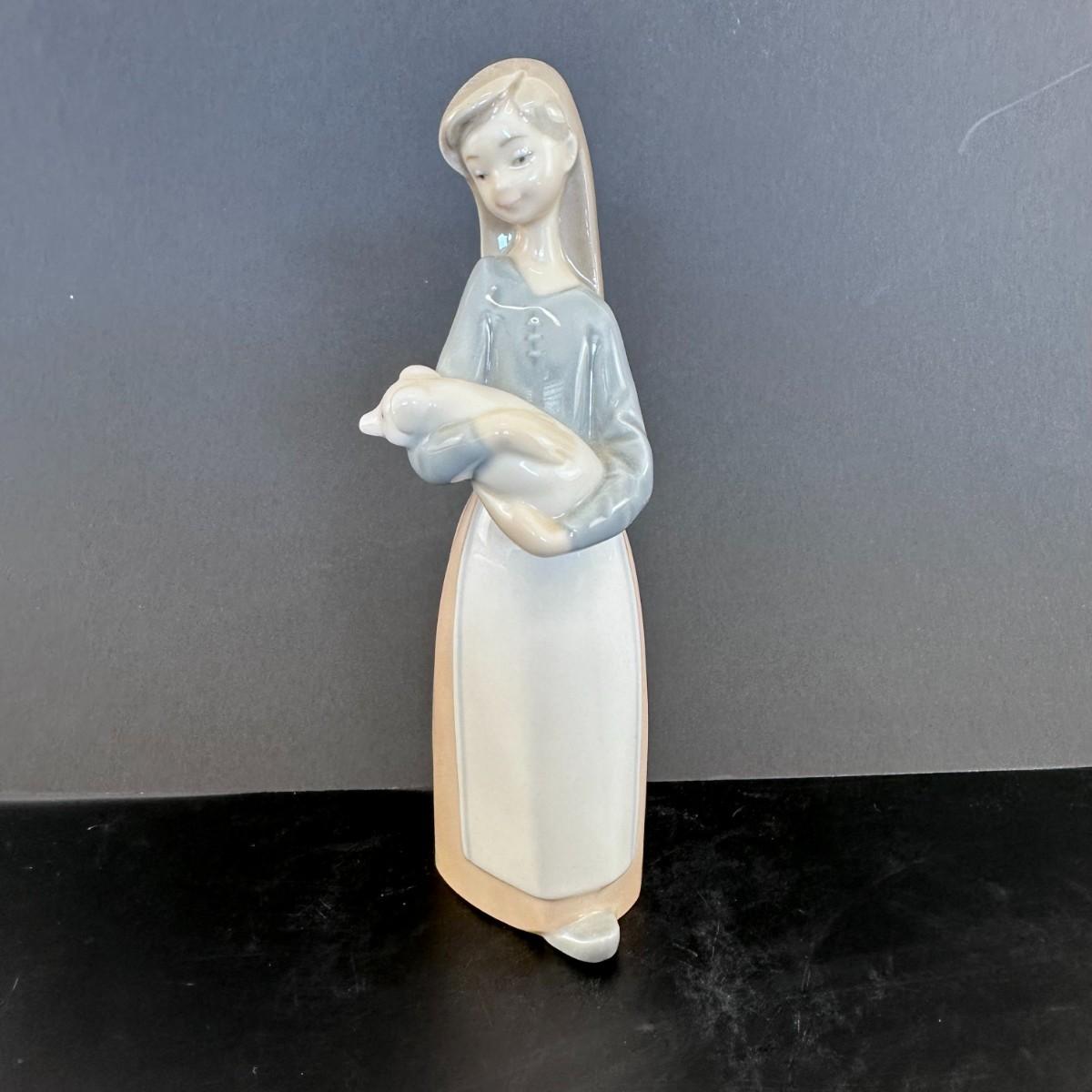 Description: Lladro figurine number 1011 is titled "Little Girl with Pig" (or sometimes "Girl with Piglet"). This endearing figurine depicts a young girl gently holding or interacting with a small pig or piglet. The scene often conveys a sense of innocent curiosity and affection between the child and the animal. The figurine typically has a glazed finish, highlighting the soft features of the girl and the charming details of the piglet.