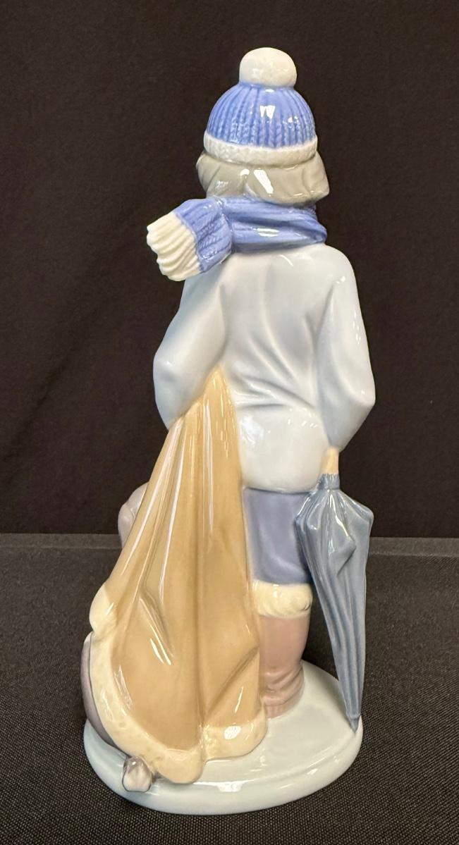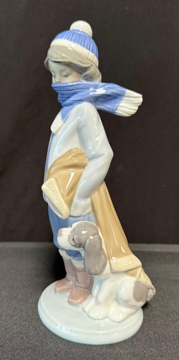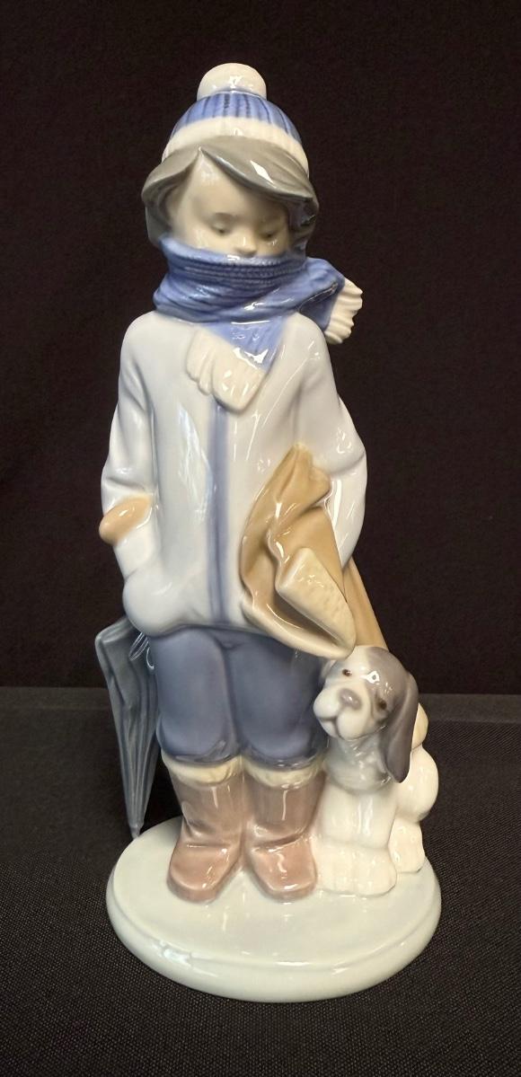 Lladro Four Seasons with no visible signs of damage- Winter figure. Boy with dog (Retired). Approximately 8" in height. [JH]