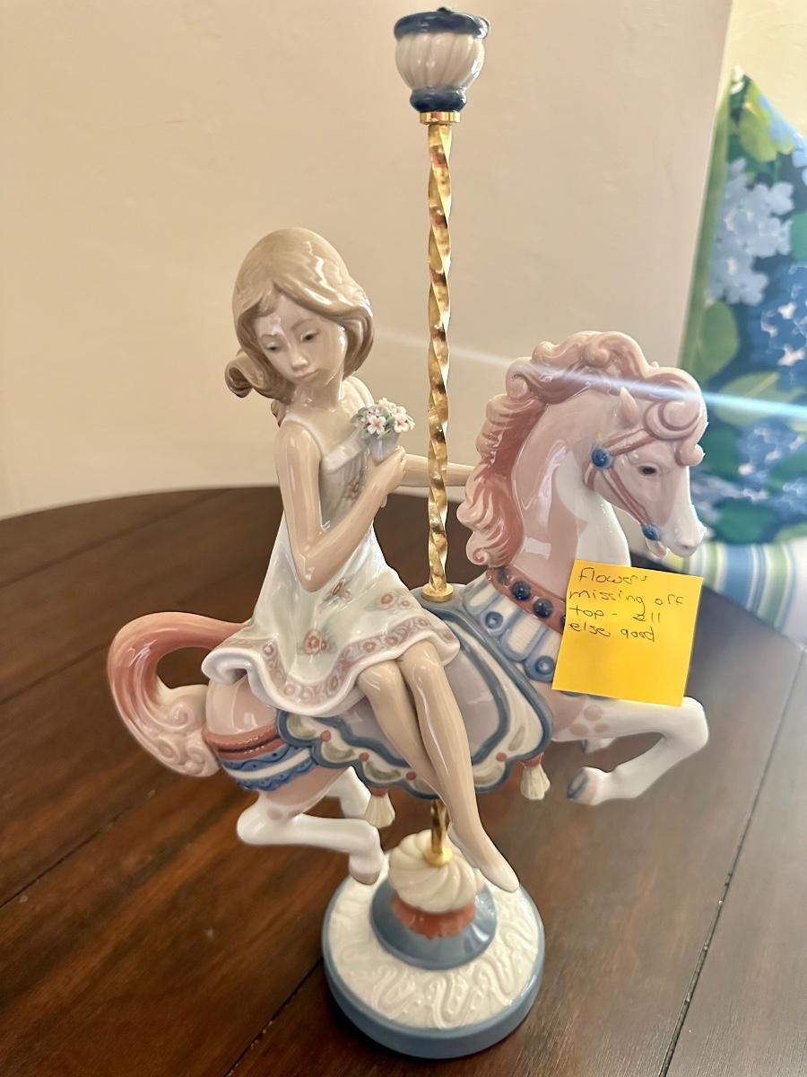 Lladro Girl #1469 Riding carousel Horse *flower missing off the very top.