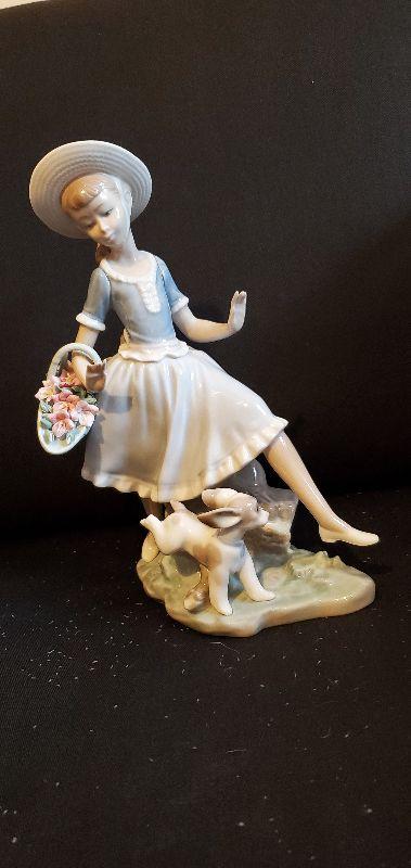 Lladro large porcelain figurine (#17) "MIRTH IN THE COUNTRY" GIRL RUNNING WITH DOG & FLOWER BASKET (4920) Made in Spain