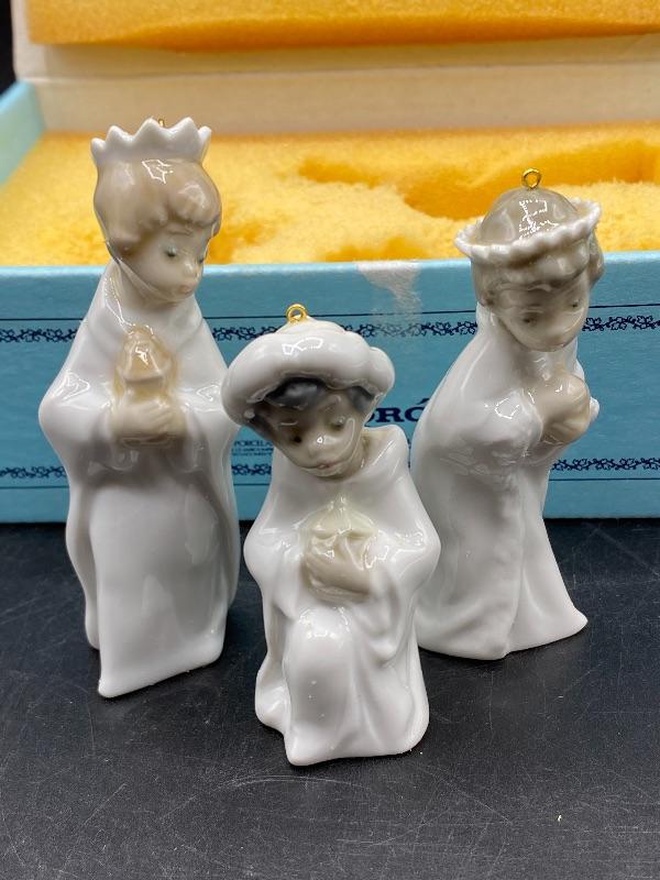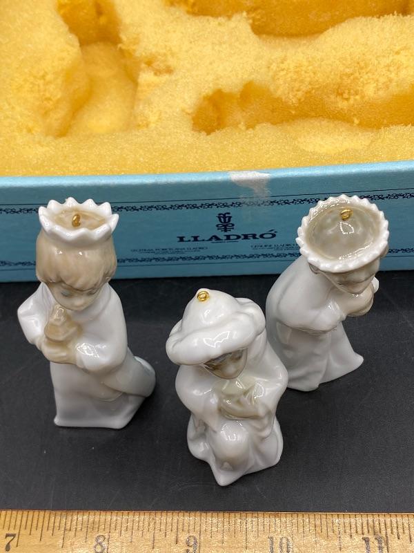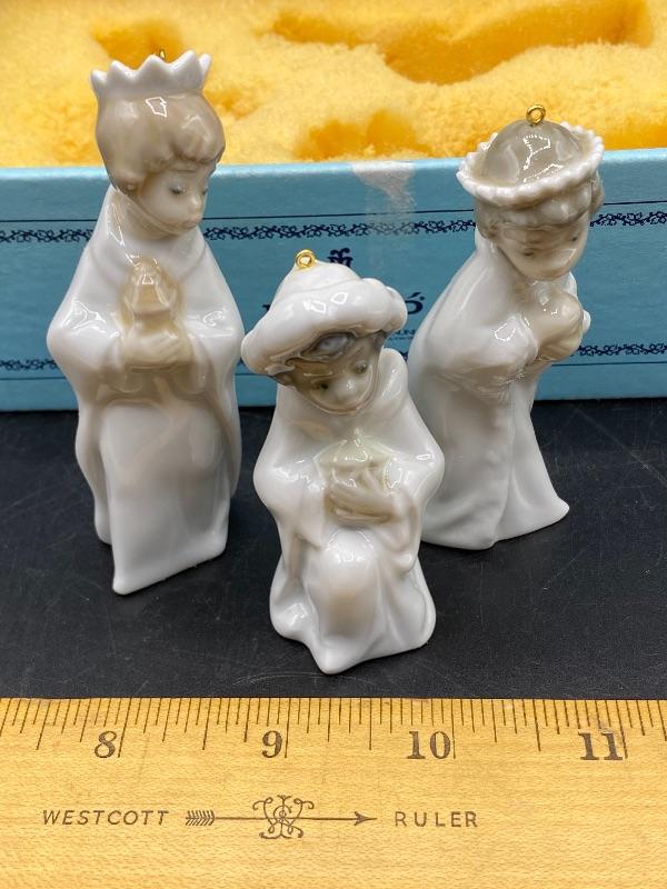 Lladro "MIni Reyes" Three kings Nativity Ornaments. Have the little loops on top for hanging. Display nicely, good condition. 4" size and smaller. Come in original box.