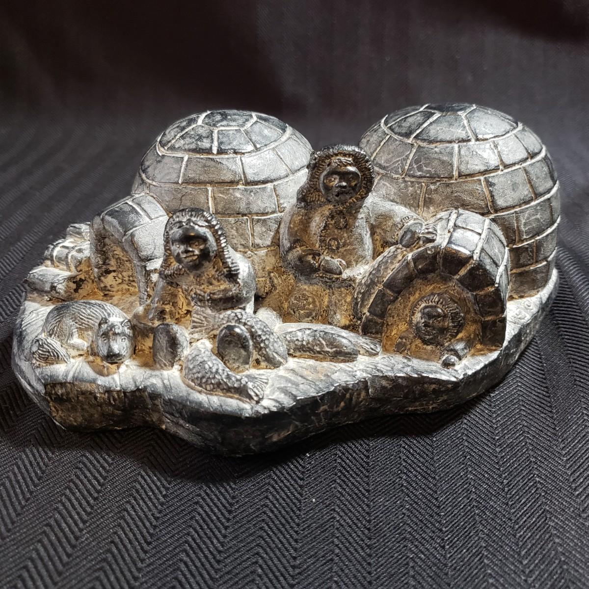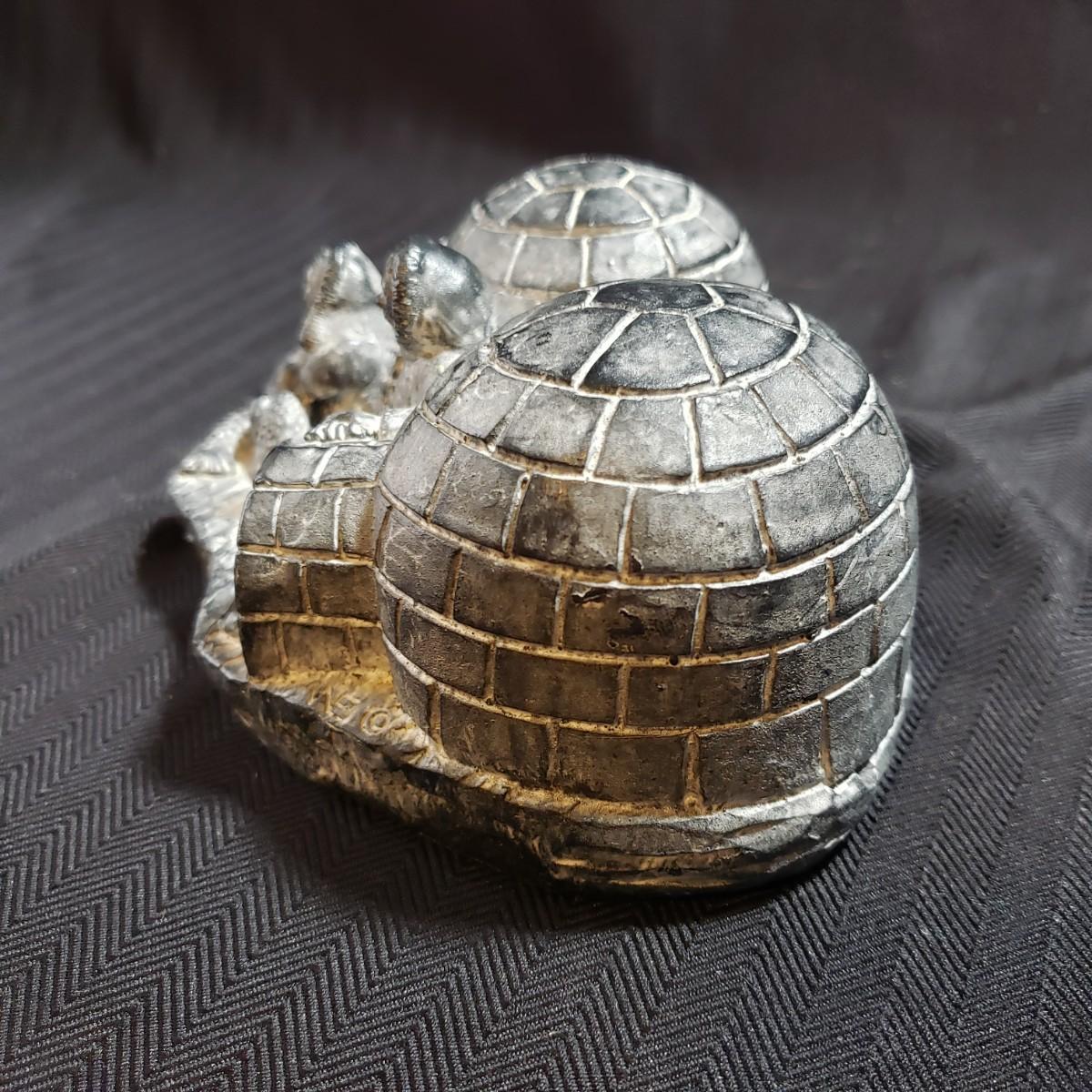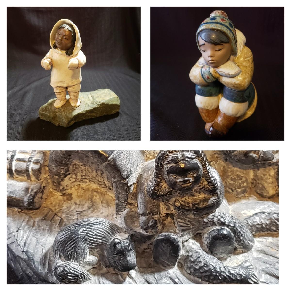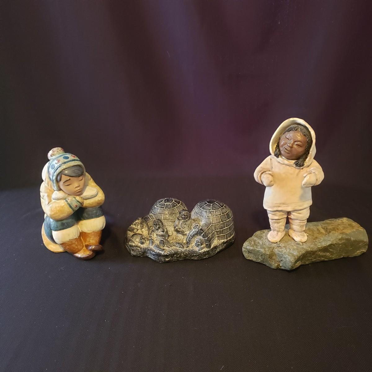This Eskimo themed lot features a Lladro ceramic figurine titled "Pensive Eskimo Boy". The next piece from Nuvuk Canada appears to be plaster, as it has a slight hollow sound when you knock on it. There are so many details on the front of this piece! This igloo scene piece measures 7" x 5" x 3"H. Lastly is another Eskimo figurine, which appears to be plaster mounted on a rock, and is heavy to the feel.