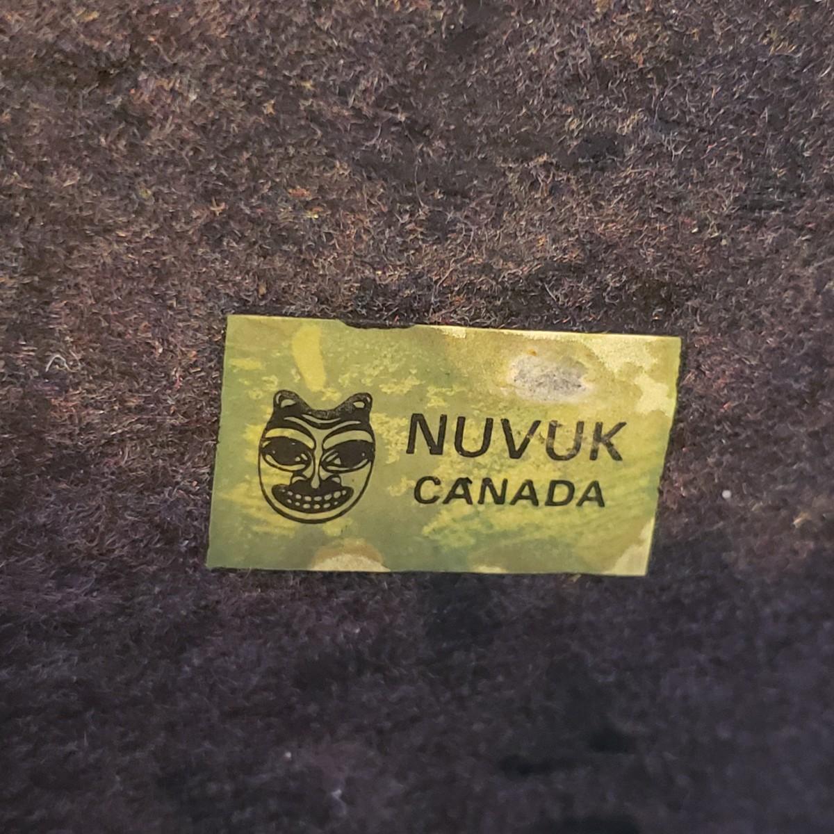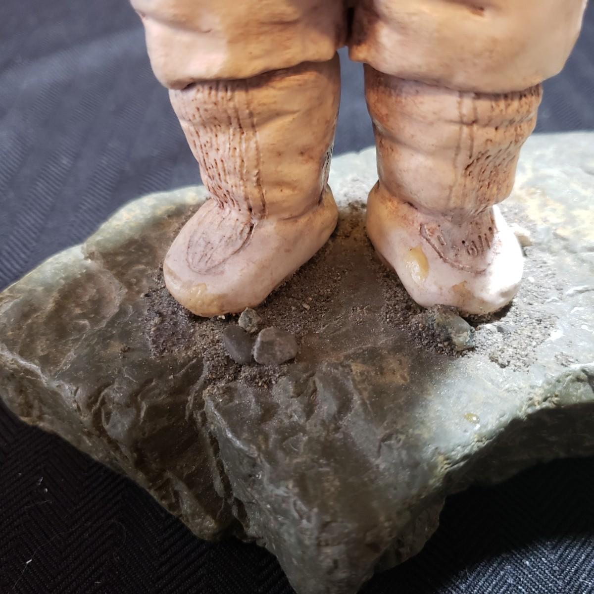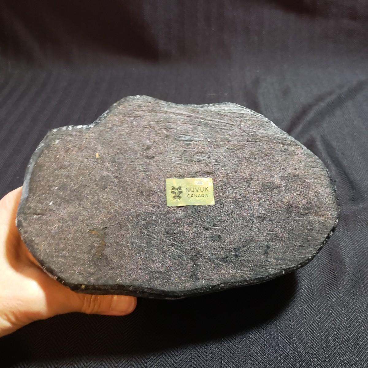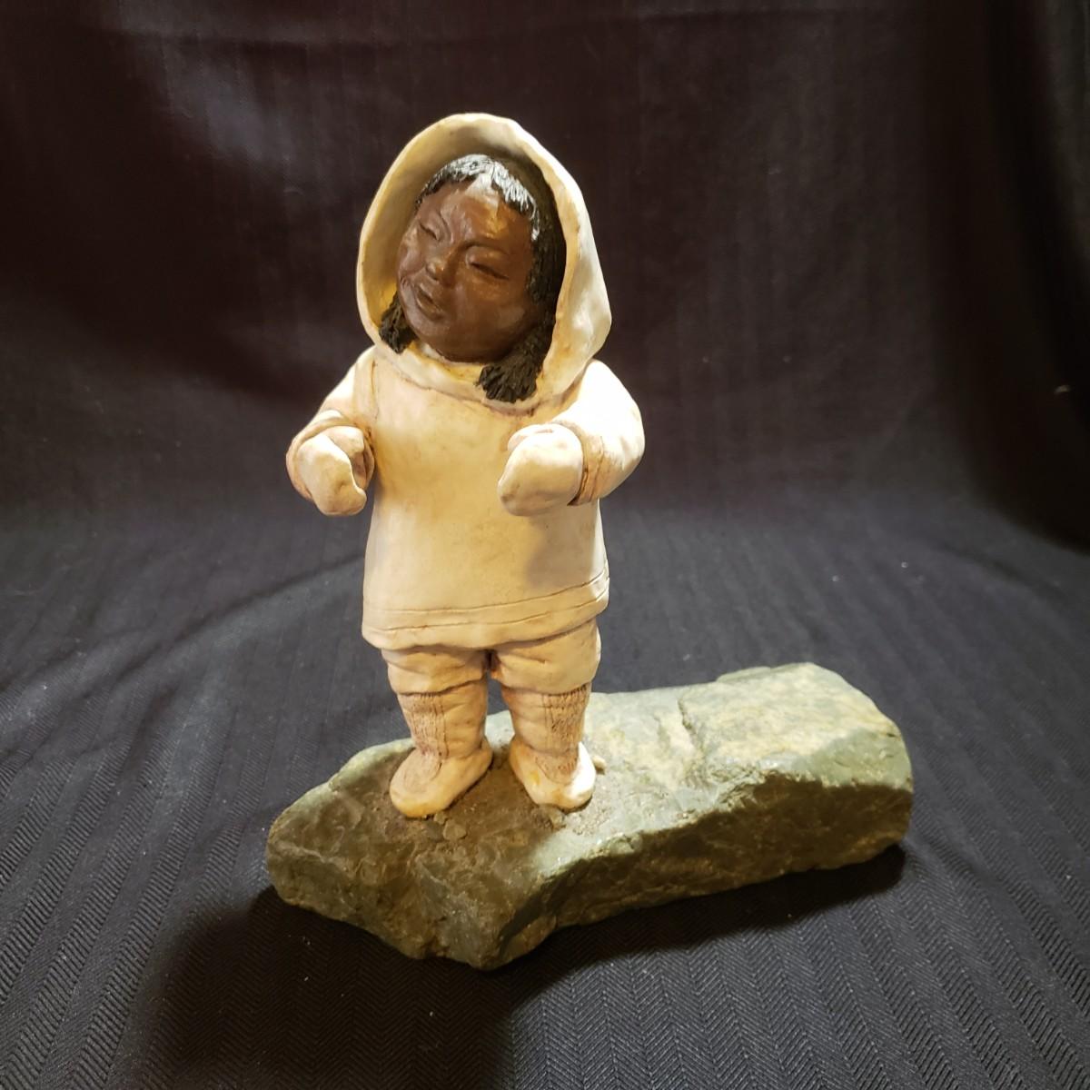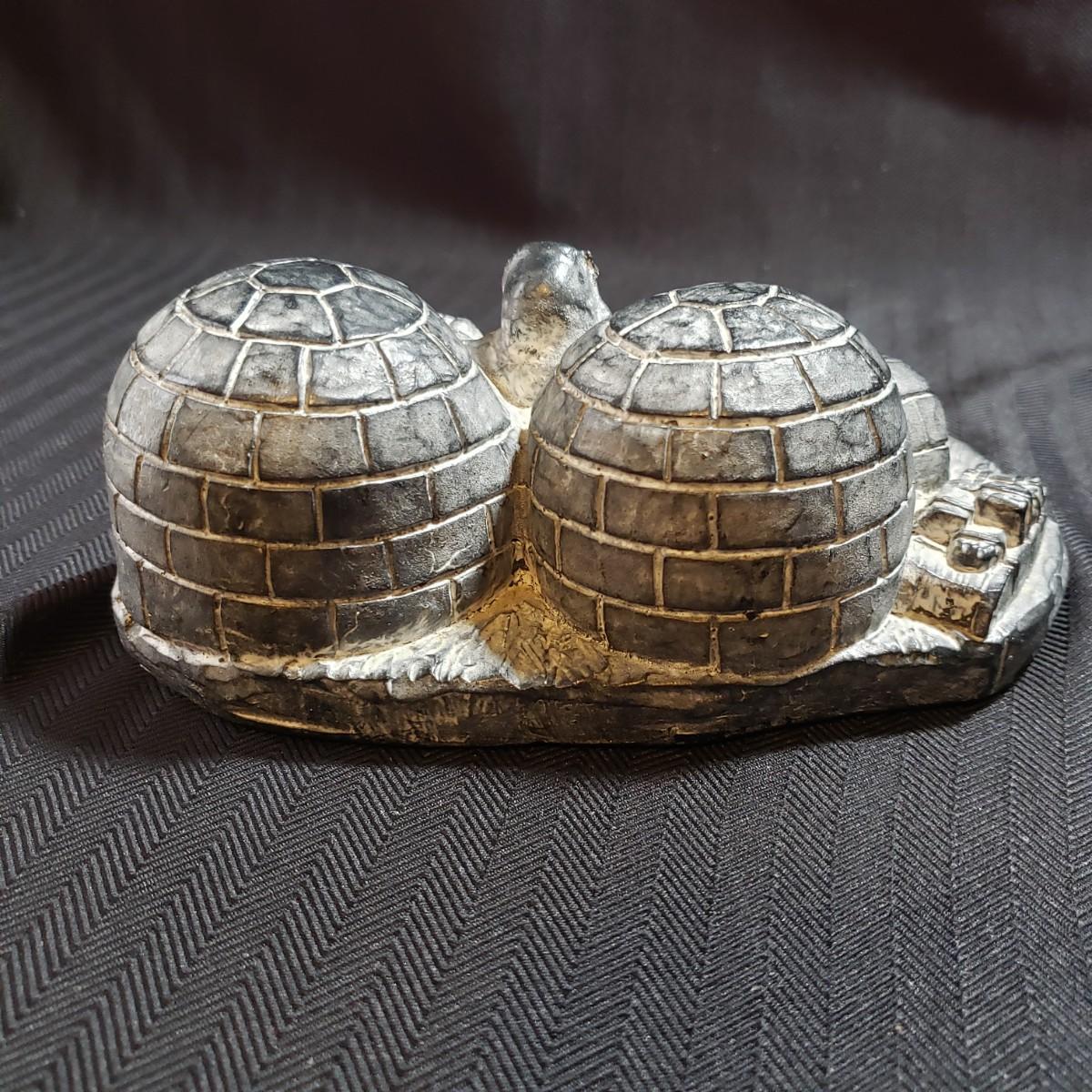 This Eskimo themed lot features a Lladro ceramic figurine titled "Pensive Eskimo Boy". The next piece from Nuvuk Canada appears to be plaster, as it has a slight hollow sound when you knock on it. There are so many details on the front of this piece! This igloo scene piece measures 7" x 5" x 3"H. Lastly is another Eskimo figurine, which appears to be plaster mounted on a rock, and is heavy to the feel.