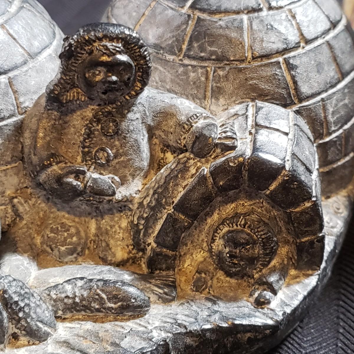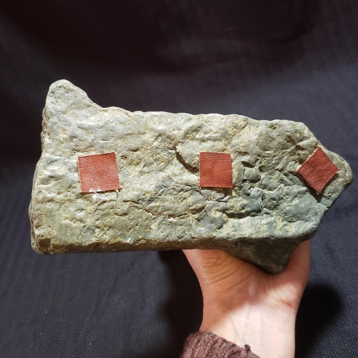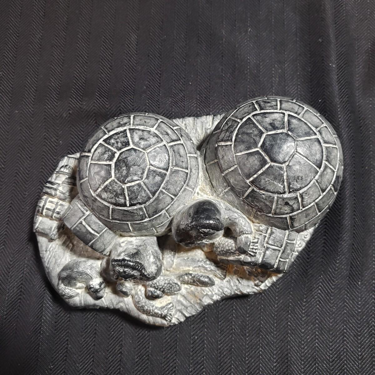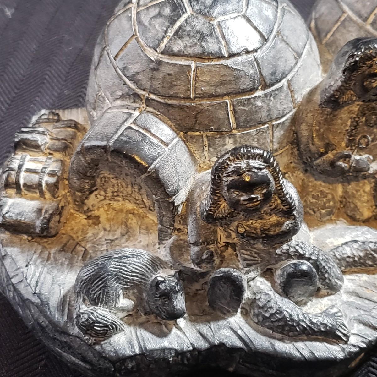 This Eskimo themed lot features a Lladro ceramic figurine titled "Pensive Eskimo Boy". The next piece from Nuvuk Canada appears to be plaster, as it has a slight hollow sound when you knock on it. There are so many details on the front of this piece! This igloo scene piece measures 7" x 5" x 3"H. Lastly is another Eskimo figurine, which appears to be plaster mounted on a rock, and is heavy to the feel.