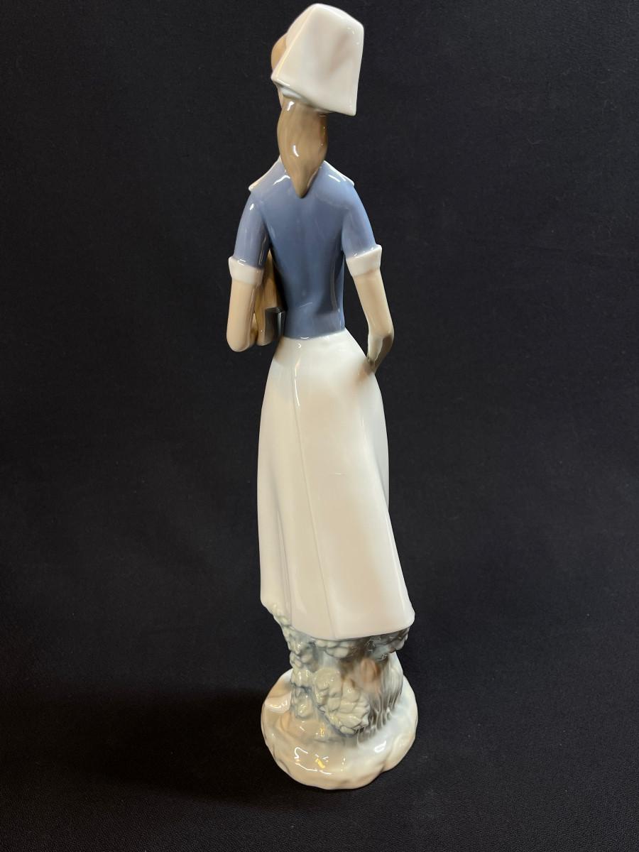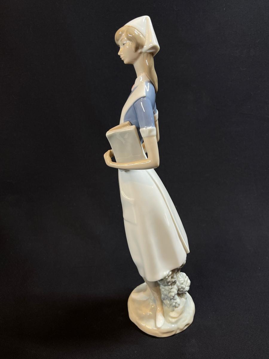 Lladro Nurse. A porcelain figure design #4603. This lovely elongated figure was designed by Salvador Furio 1971, depicting a nurse wearing a white cap and pinafore and carrying books, charts or some clean white sheets tucked under her arm. Maker marked,