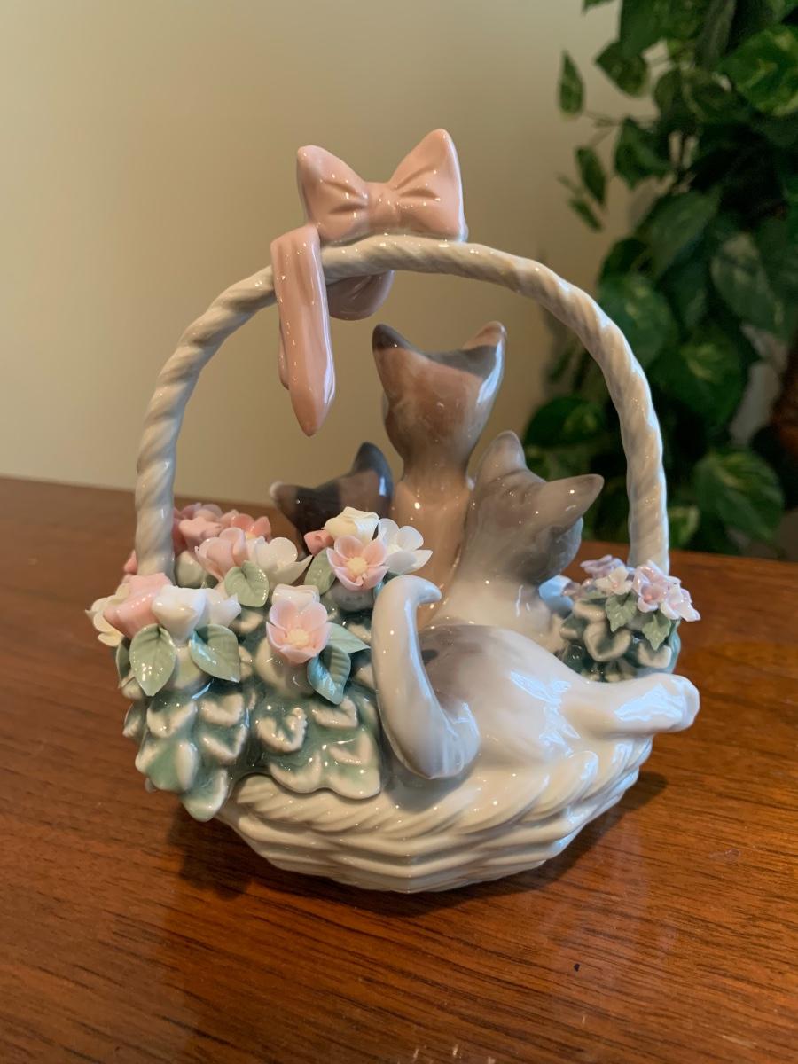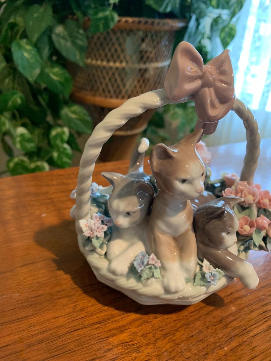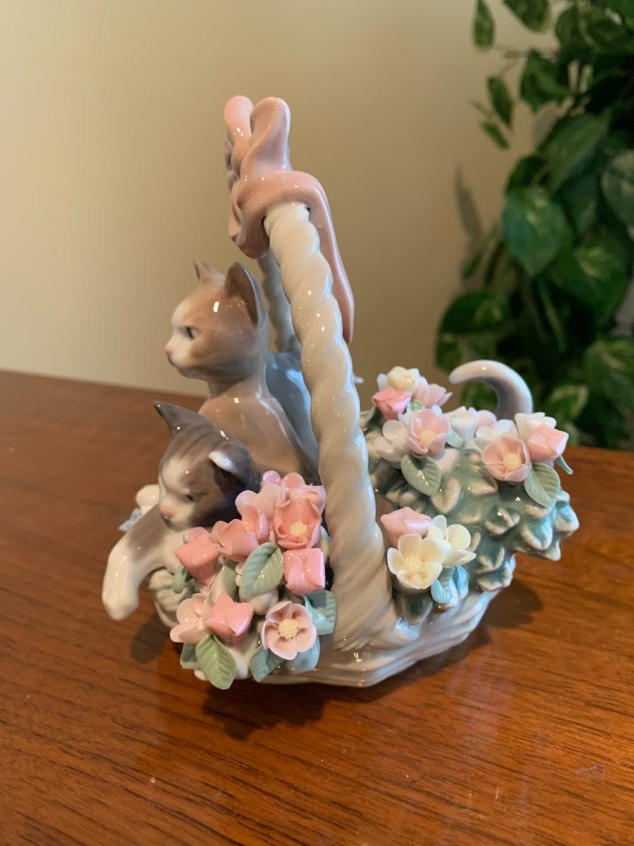 This Lladro figurine, titled "Purr-Fect Kittens Cats in Flower Basket" (item #1444), is a beautiful piece that would make a wonderful addition to any collection. The piece features three adorable cats nestled in a flower basket, with intricate details and a glossy finish.