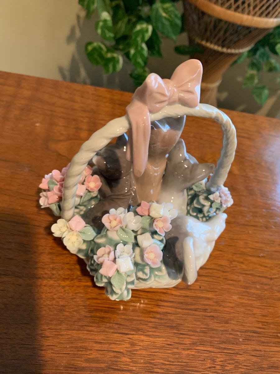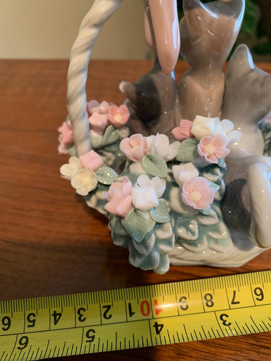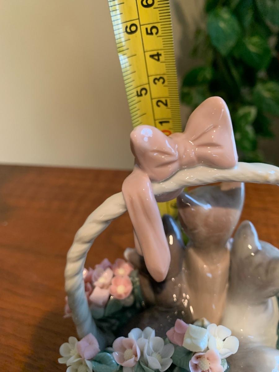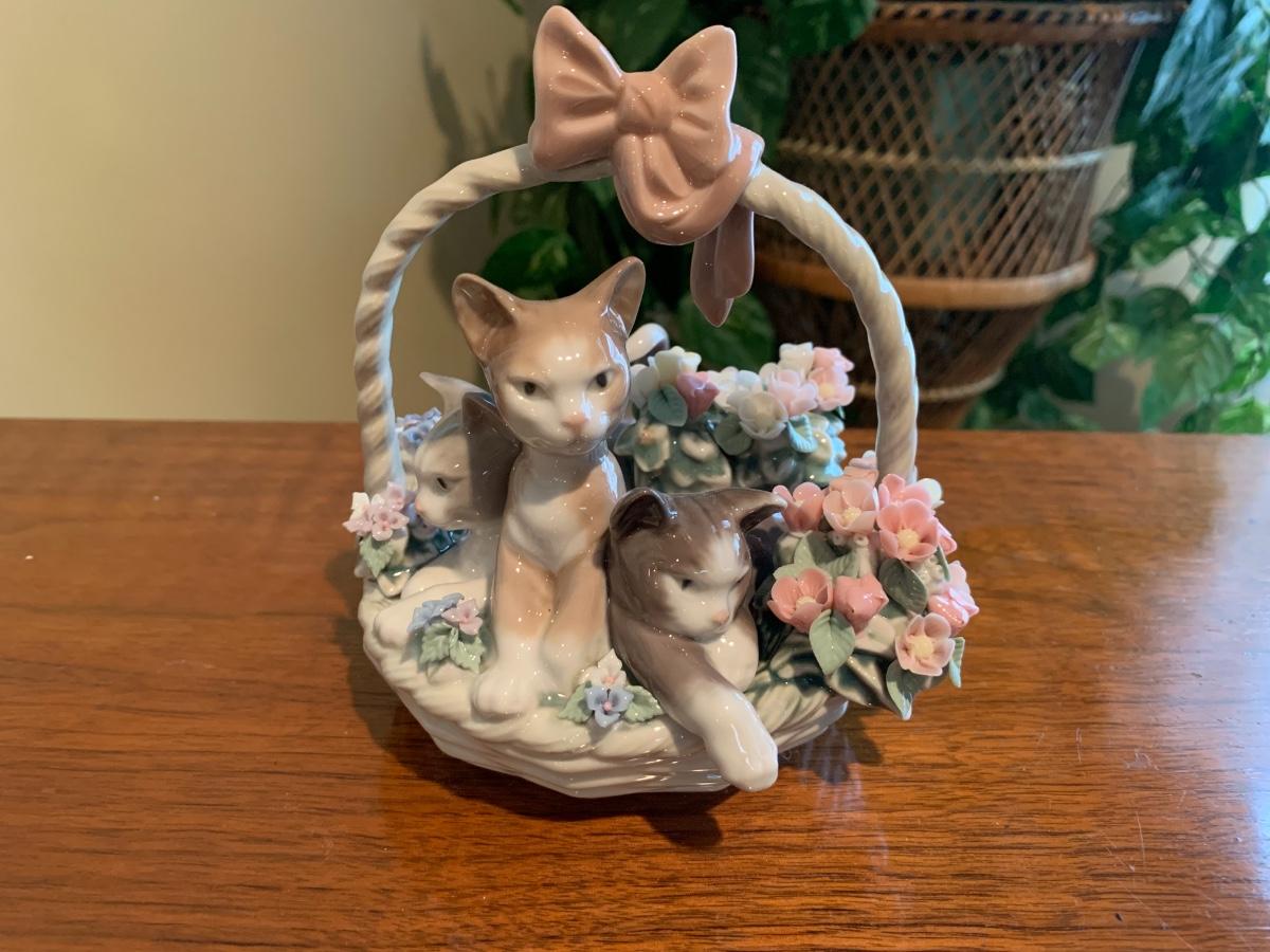 This Lladro figurine, titled "Purr-Fect Kittens Cats in Flower Basket" (item #1444), is a beautiful piece that would make a wonderful addition to any collection. The piece features three adorable cats nestled in a flower basket, with intricate details and a glossy finish.