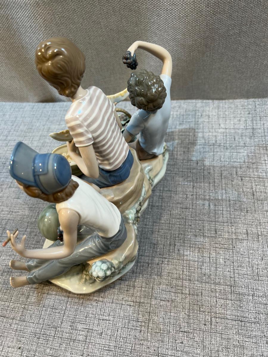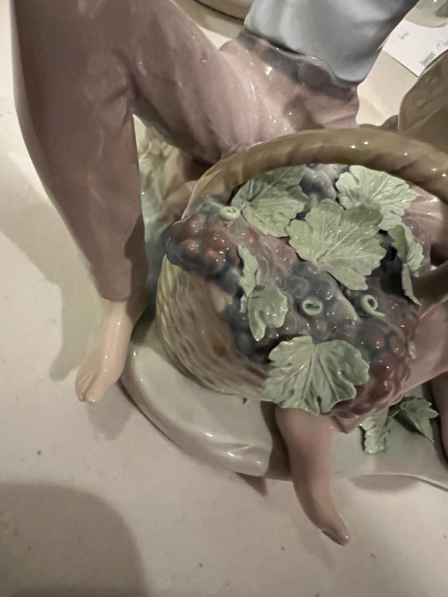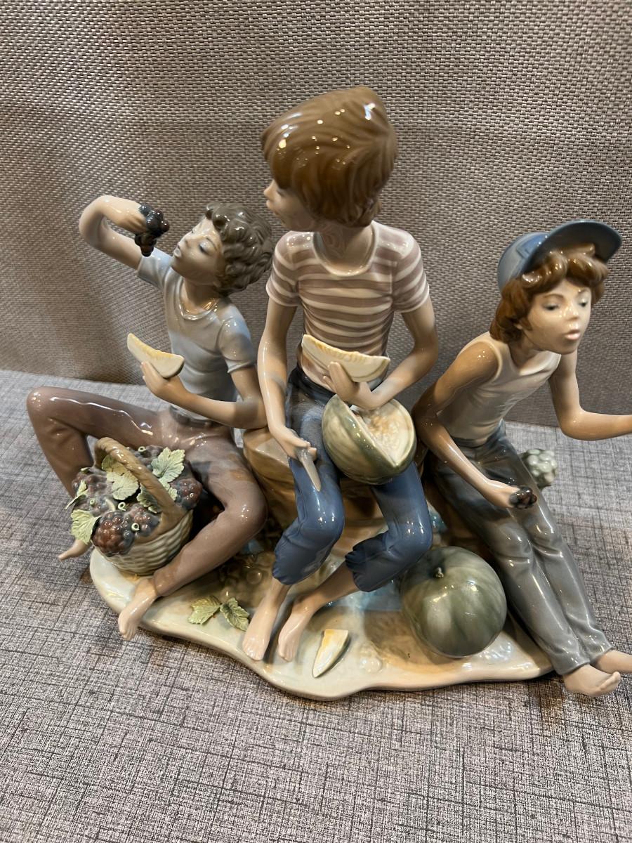 Vase is in good condition appears one of the grape leaves has some chipping loss. Sold as is, boxing fee applies if shipped. 9" tall 10.5" wide. Got to love the boy having a smoke! Priced low due to minor chipping.