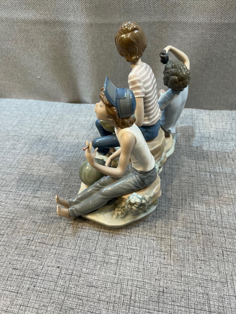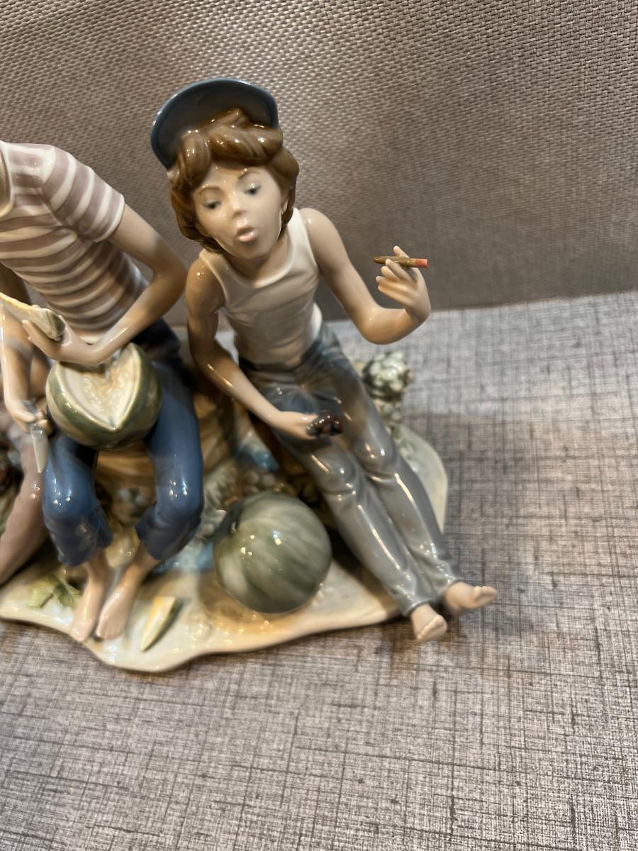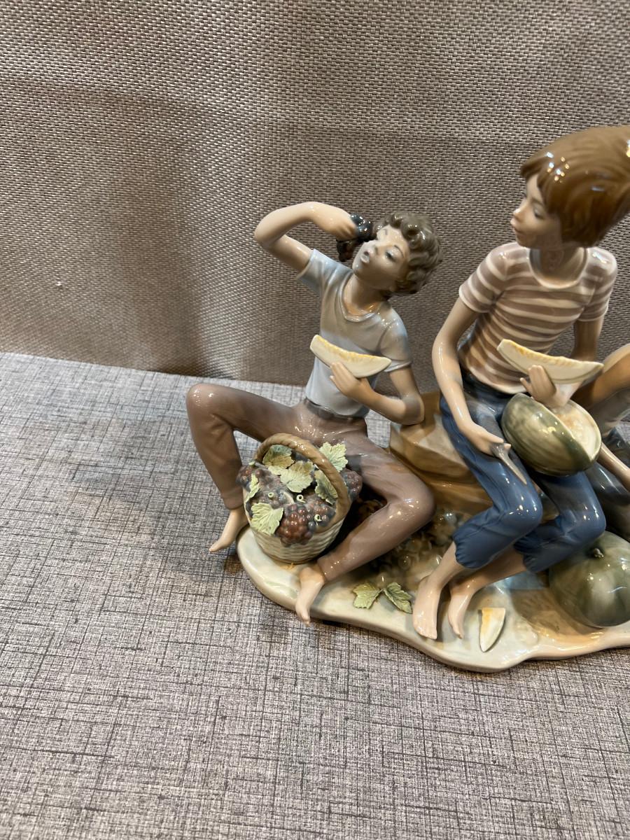 Vase is in good condition appears one of the grape leaves has some chipping loss. Sold as is, boxing fee applies if shipped. 9" tall 10.5" wide. Got to love the boy having a smoke! Priced low due to minor chipping.