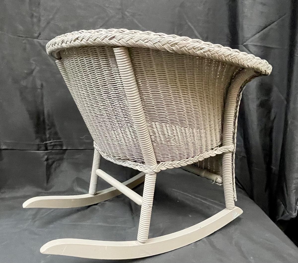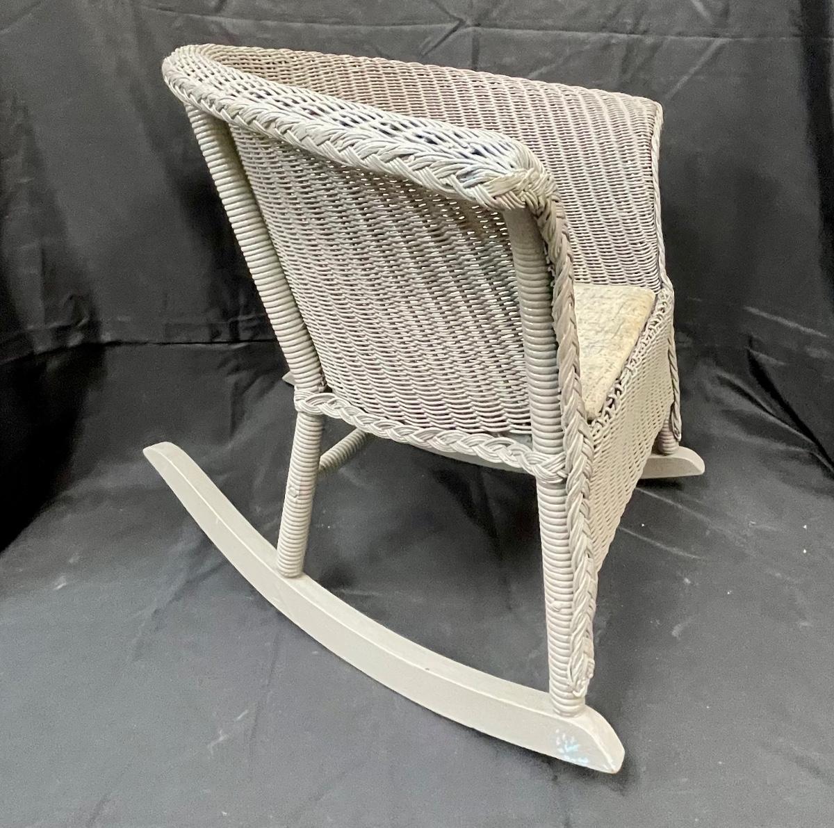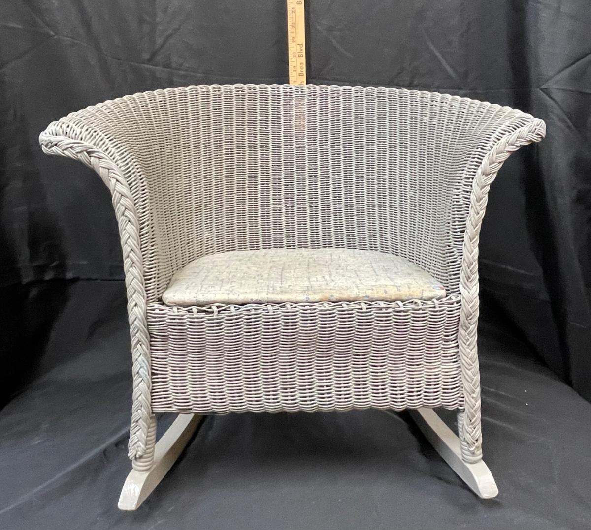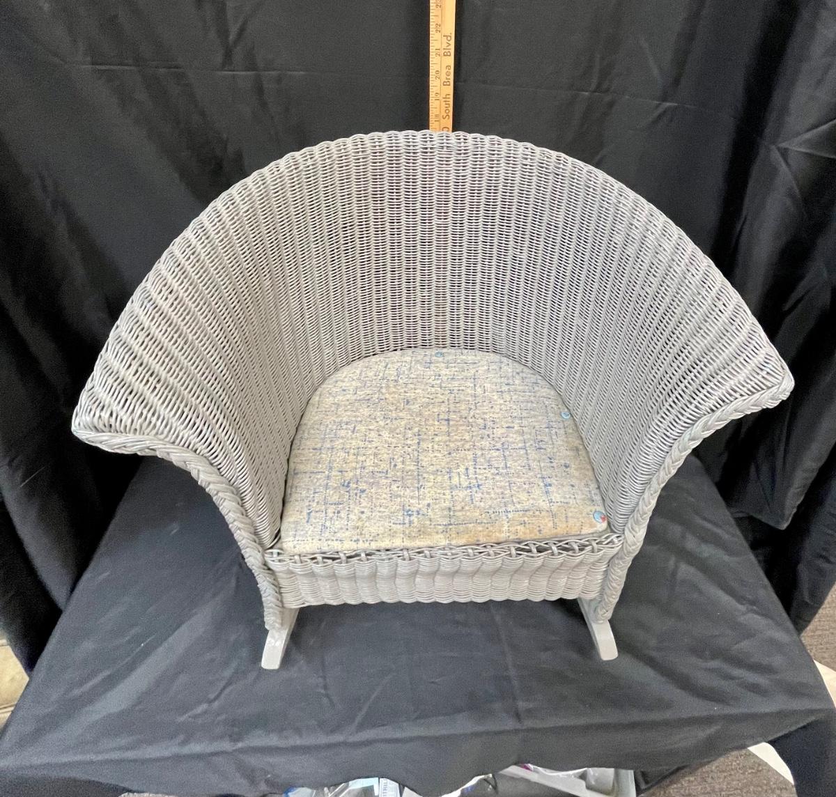 Vintage Retro Grey Whicker Flared Back Child's Rocking Chair. In good, aged condition. About 17" at top of back. The grey is a little darker than the photos show.