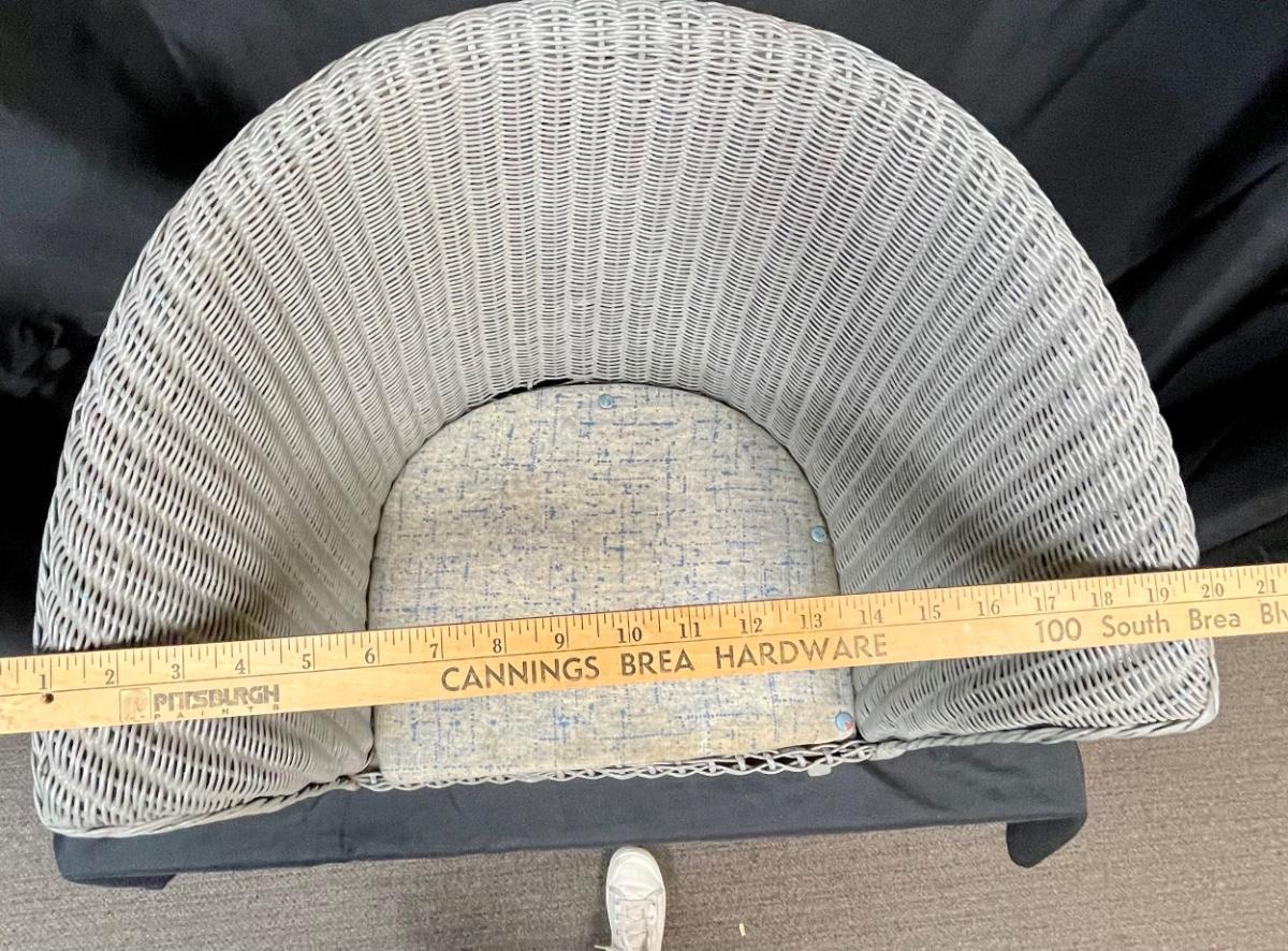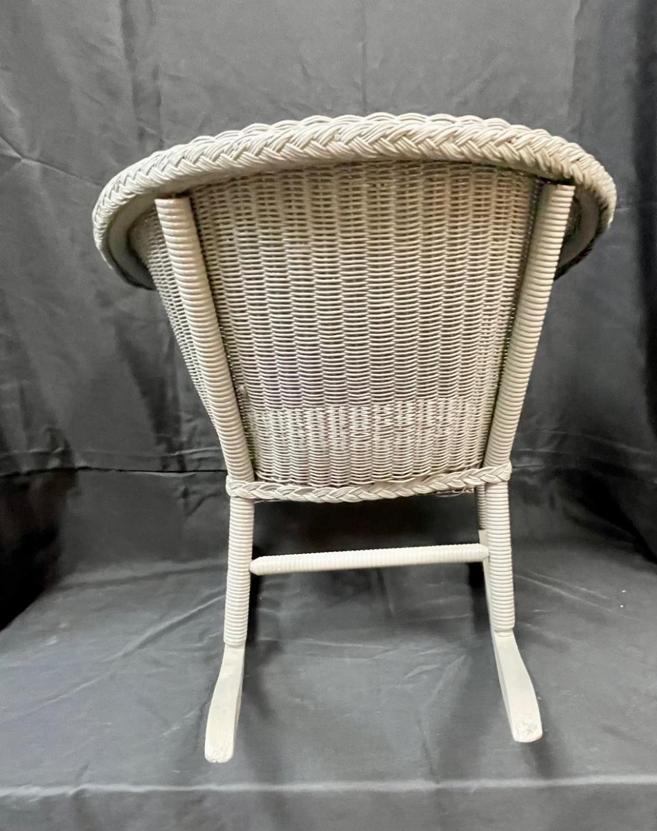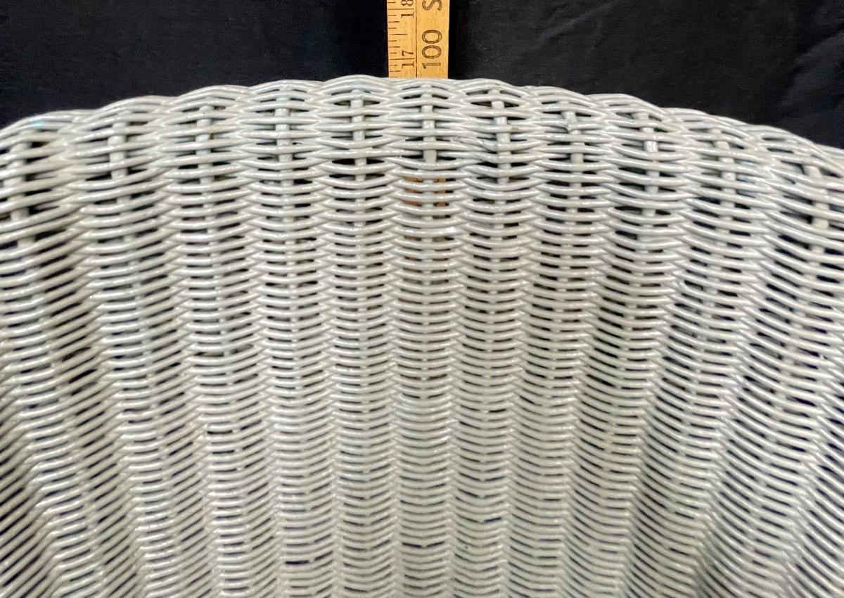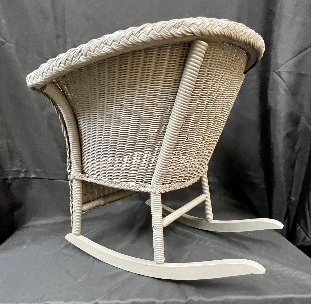 Vintage Retro Grey Whicker Flared Back Child's Rocking Chair. In good, aged condition. About 17" at top of back. The grey is a little darker than the photos show.