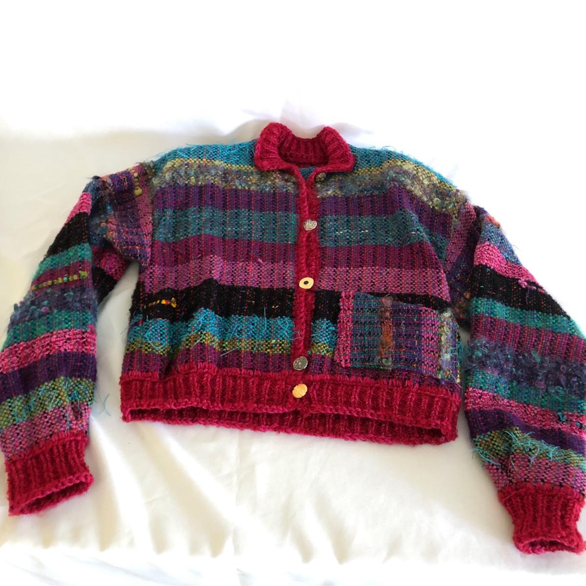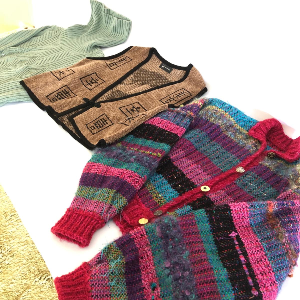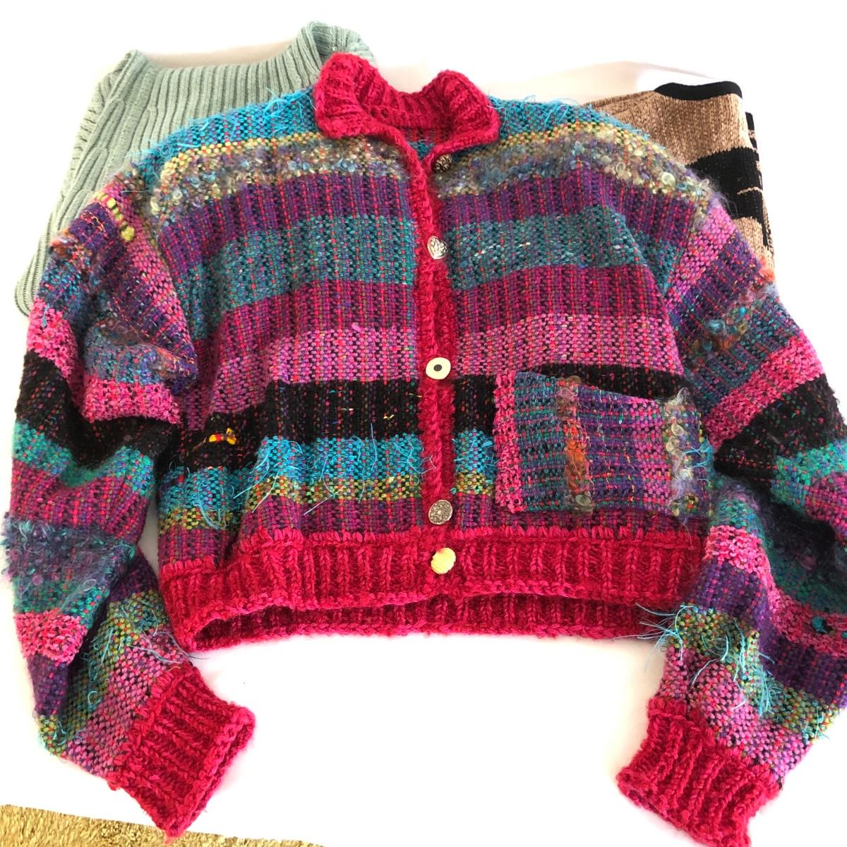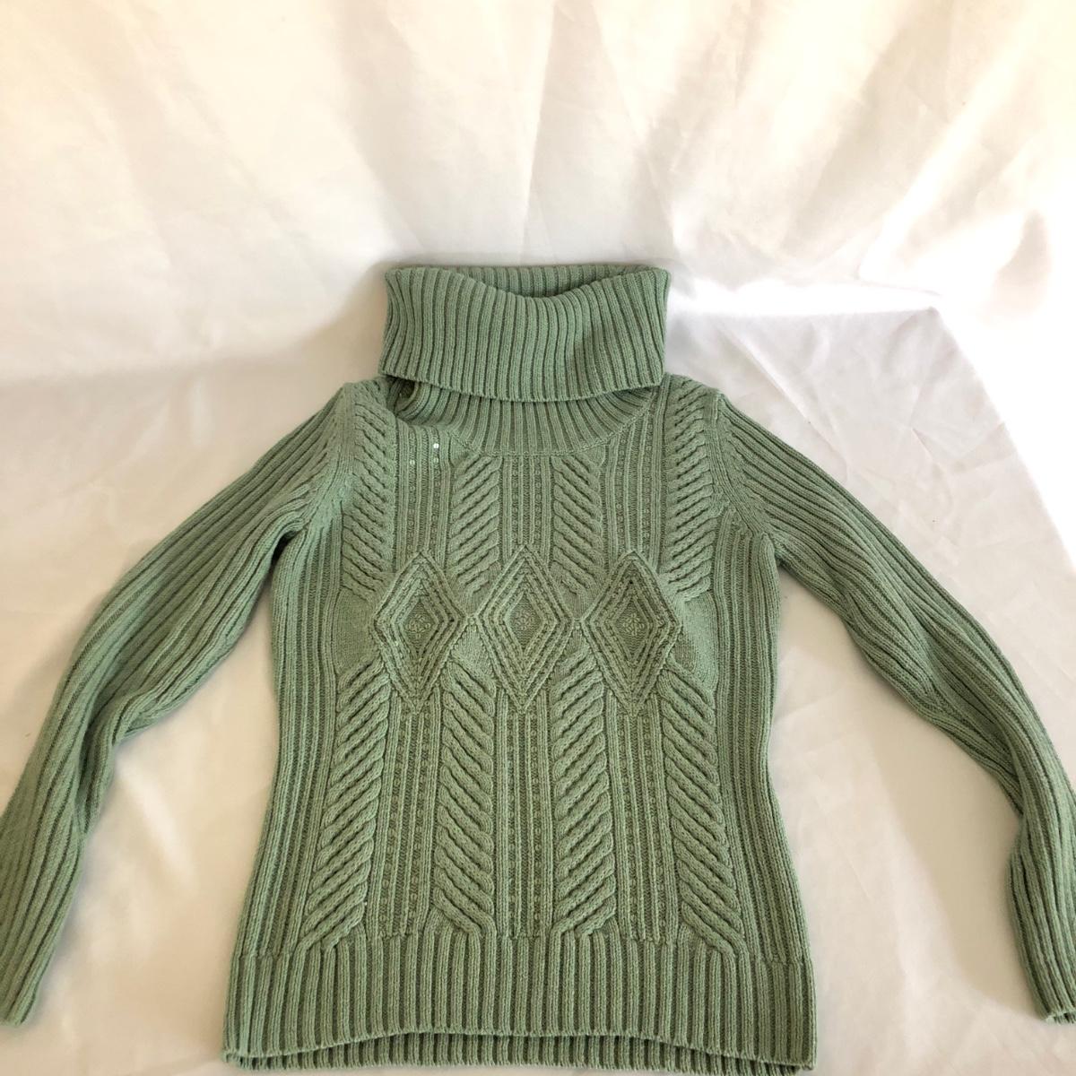 This set of three women’s outerwear items includes a sweater jacket, turtleneck sweater, and sweater vest. These appear to be size large but are not marked. Shipping available.