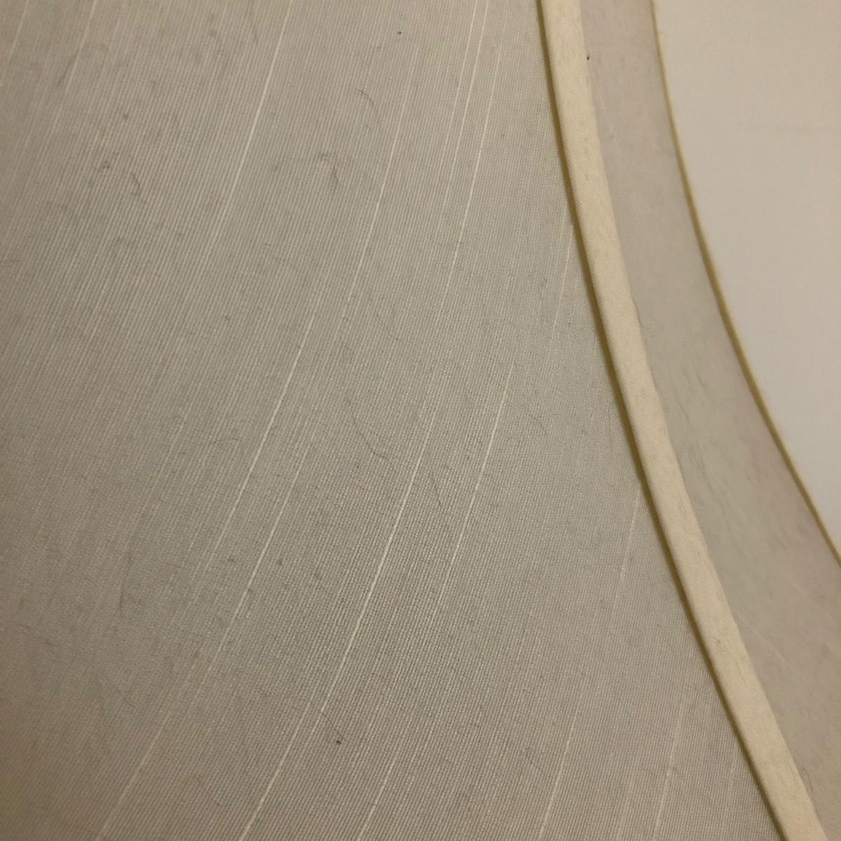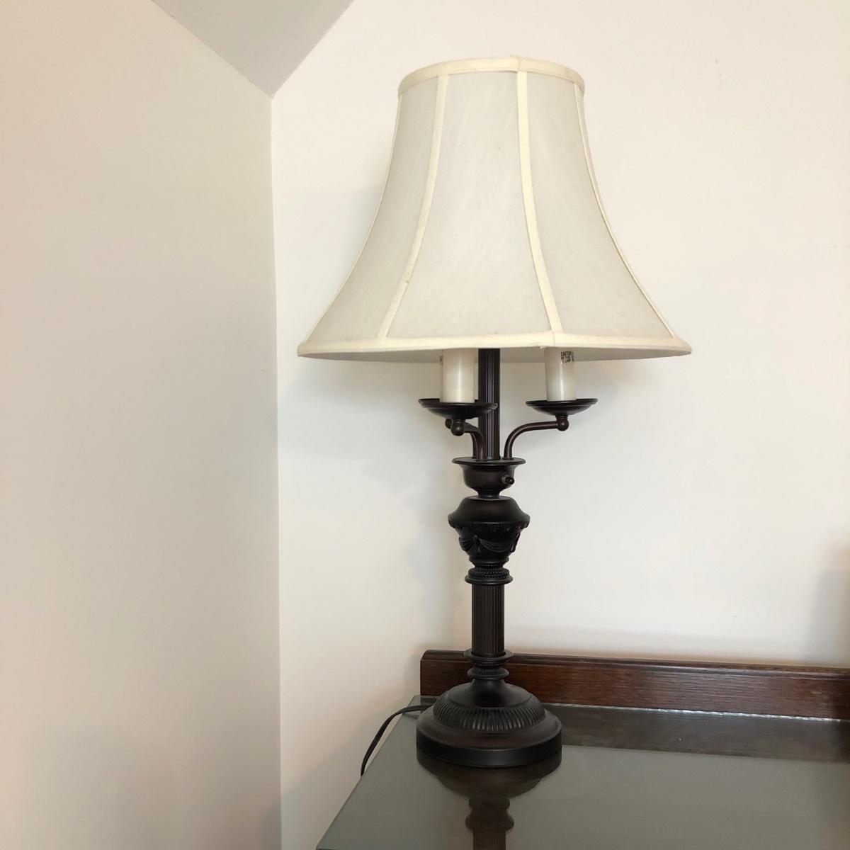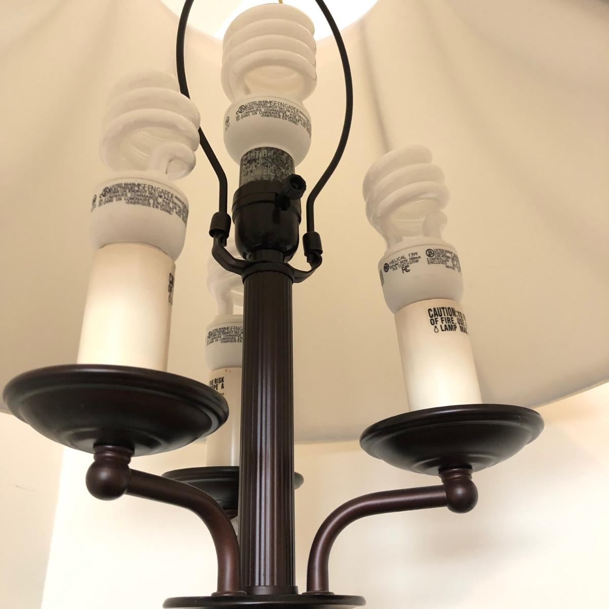 This table lamp separates into 3 separate candle stems for 3 standard size light bulbs and has 1 center light as well. The twist switch gives 3 light settings from dim to bright and there is also the option to have only the center light bulb on. The base is a matte glistening dark red-brown and the cream shade is intact. The lamp shade measures 17” in diameter with a base of 7” and a height of 30”. It turned on when plugged in. The lamp shade does show some pet fur and dust but does not have a noticeable smell. Local pickup only.