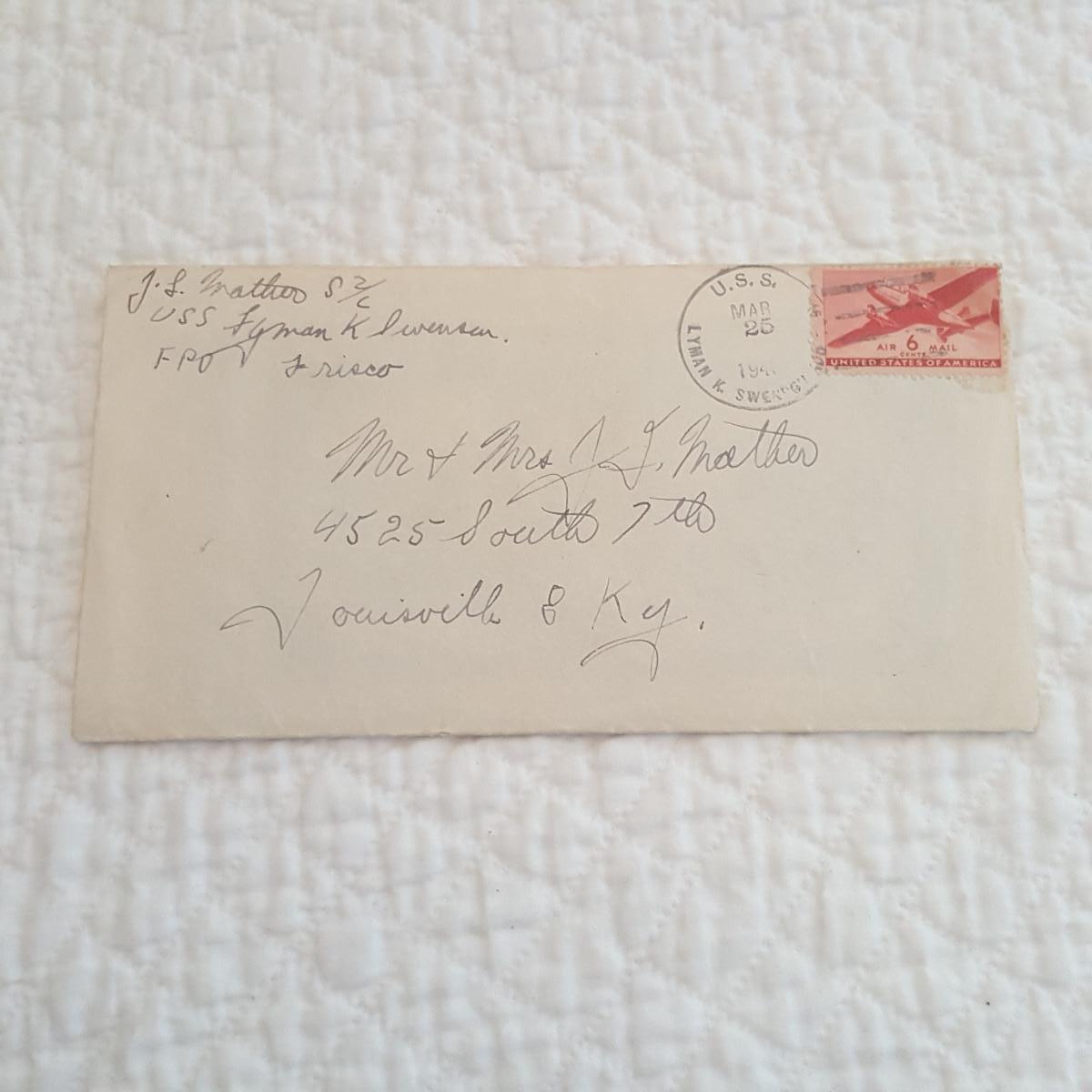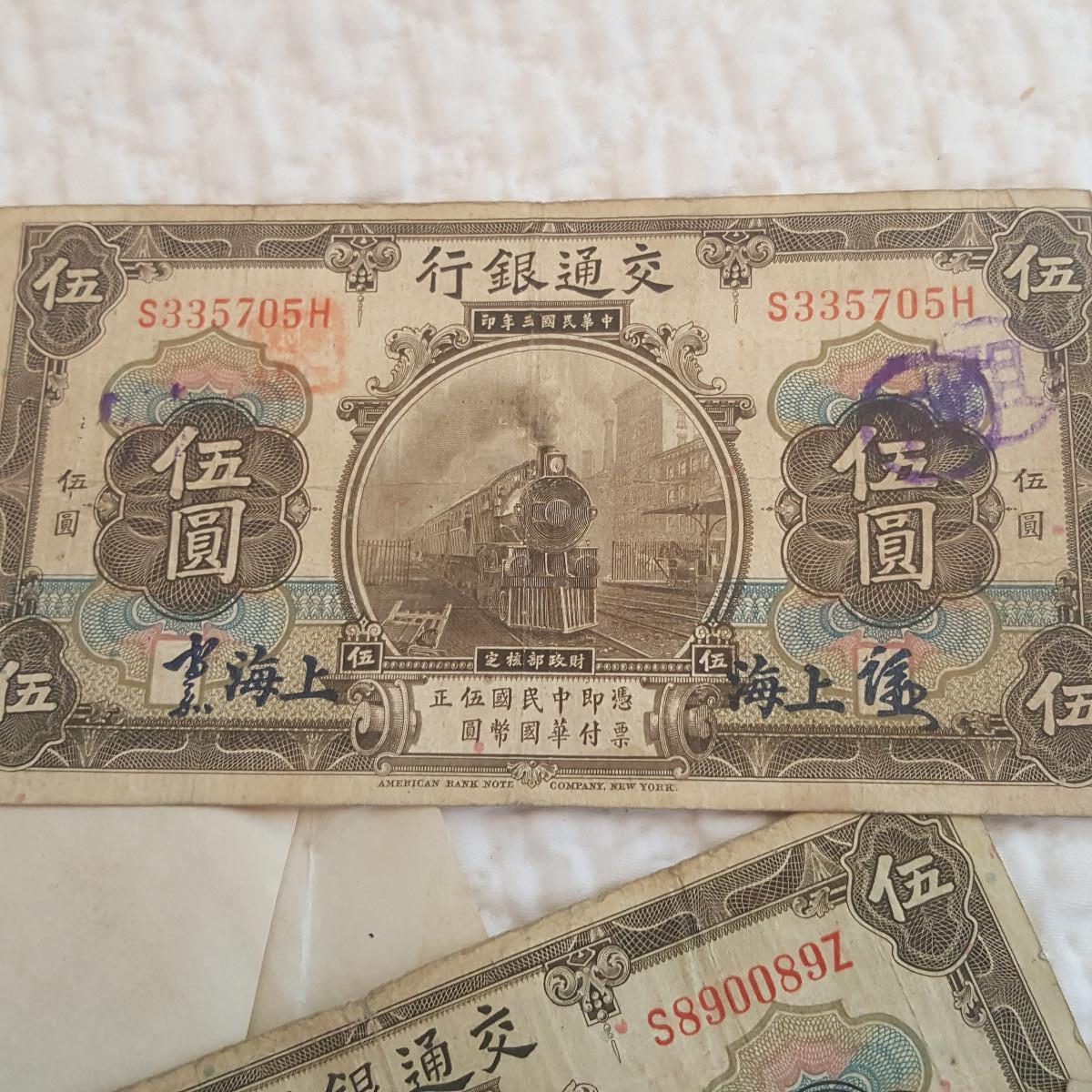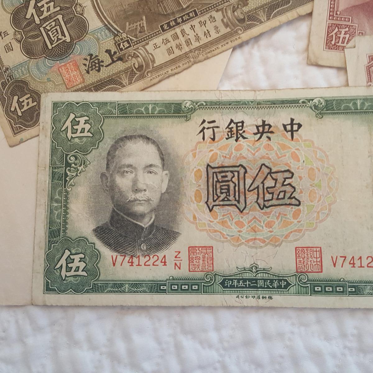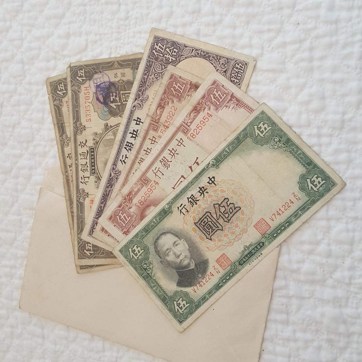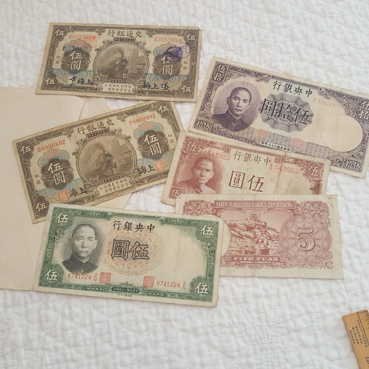 This Forgotten Envelope of Foreign Money was found in a big, fat encyclopedia in an estate we are liquidating for a friend. The bills are in nice condition. One is a Fifty Yuan on the Central Bank of China - 1944, two are Five Yuan notes from the Bank of Communication in Shanghai - each has different original authorizing signatures both dated 1914, there are three Five Yuan notes from the Central Bank of China, one dated 1938 and two dated 1941. They come in an envelope that is postmarked from the USS Lyman K. Swenson, a WW2 Destroyer that was stationed off Okinawa at the time of the postmark which is March 25, 194-something. Rare find.
