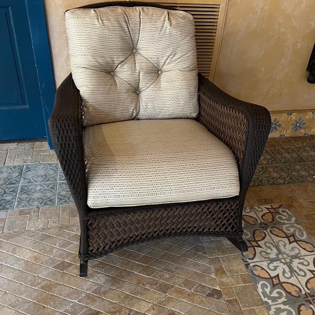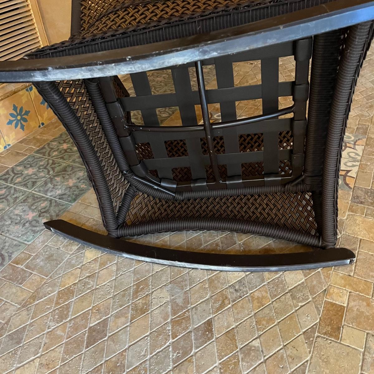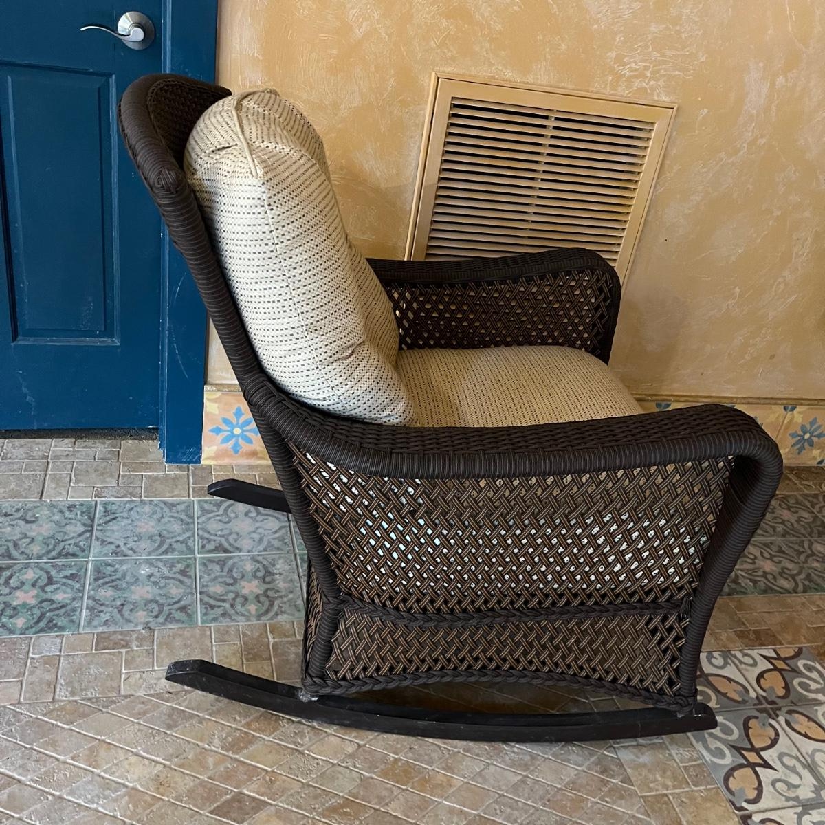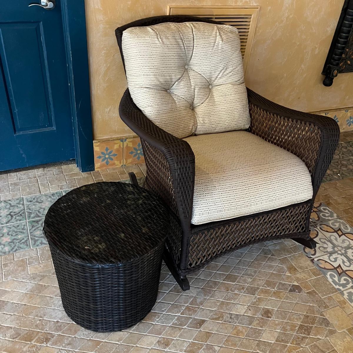 Lot includes a Lloyd Flanders synthetic wicker rocking chair with upholstered cushions. Also includes round side table that appears to be man made wicker. These items have been kept in an indoor pool room. Table measures 17.5”D x 16.5”H. Chair measures 32” x 36” x 36”H with a seat height of 21”.