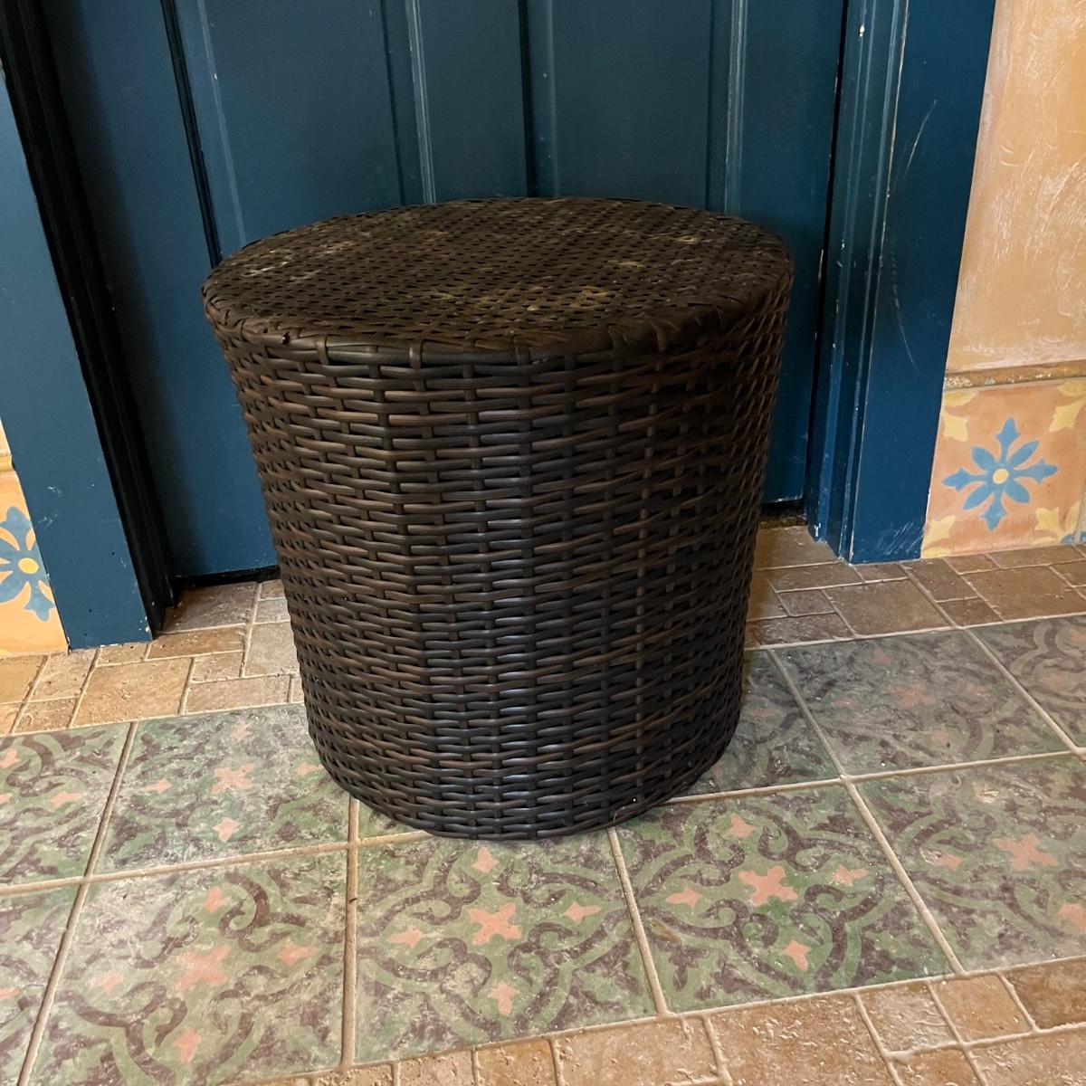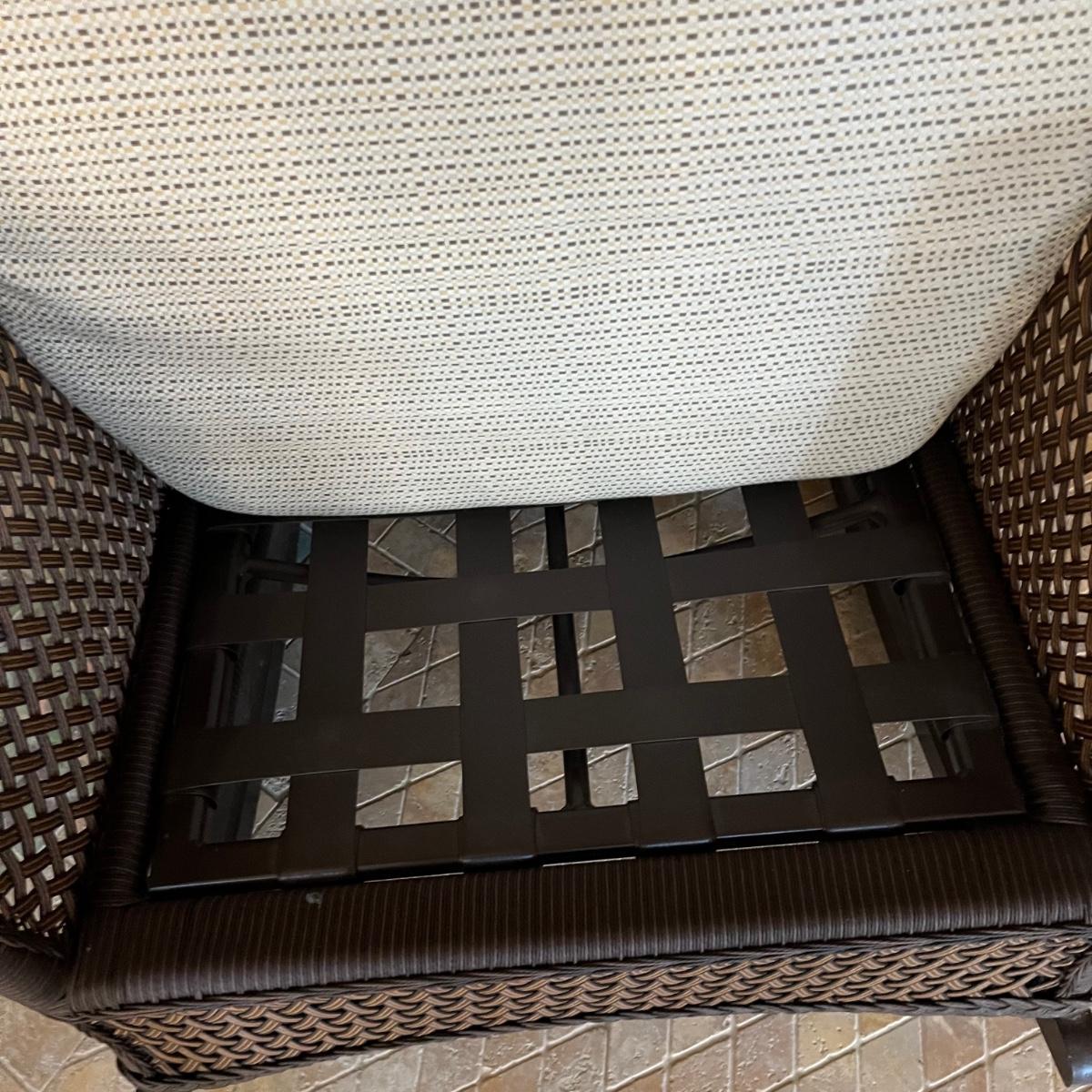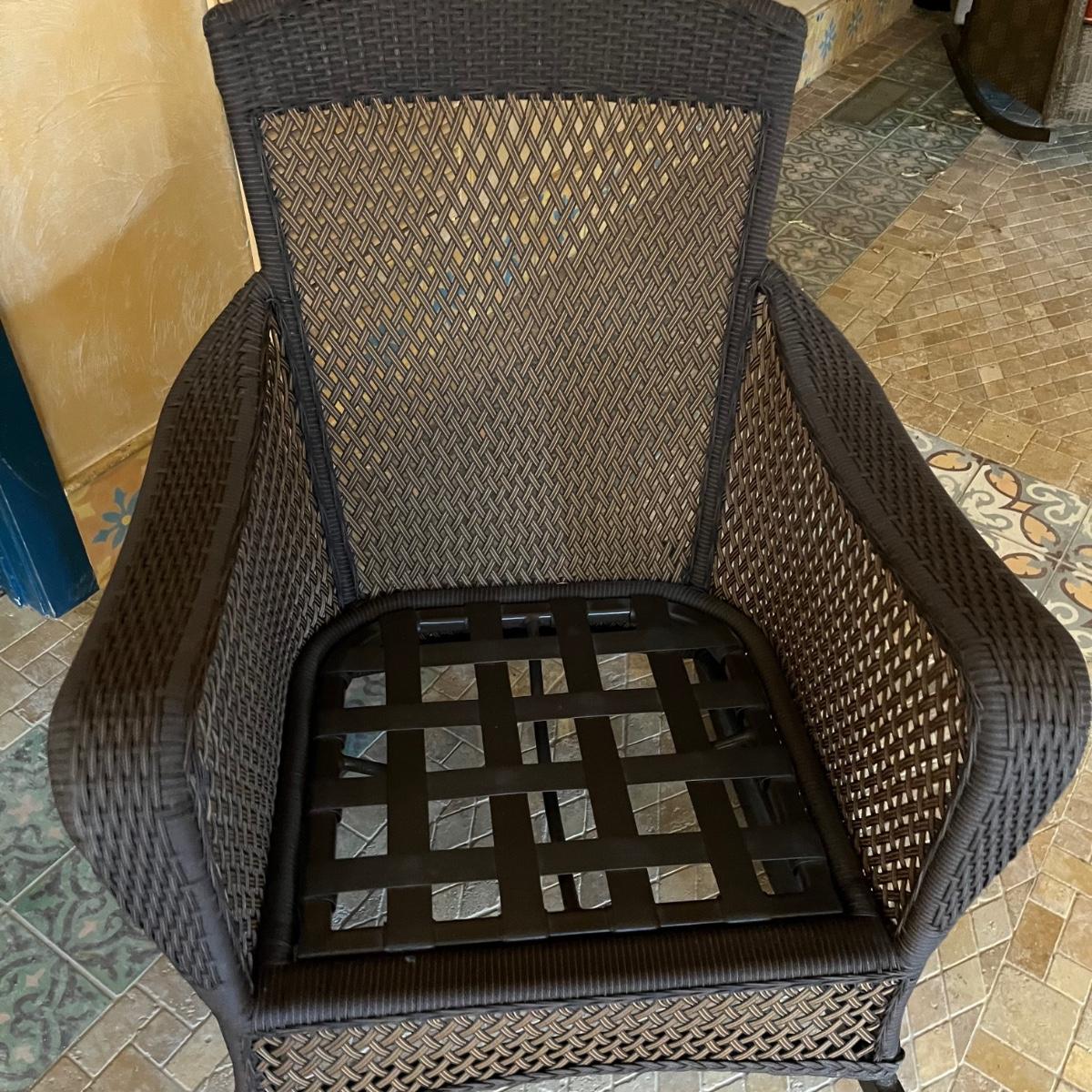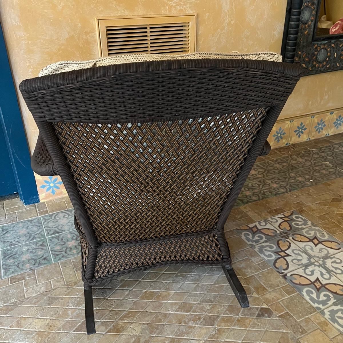 Lot includes a Lloyd Flanders synthetic wicker rocking chair with upholstered cushions. Also includes round side table that appears to be man made wicker. These items have been kept in an indoor pool room. Table measures 17.5”D x 16.5”H. Chair measures 32” x 36” x 36”H with a seat height of 21”.