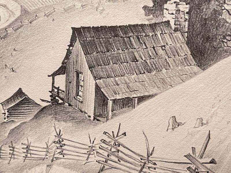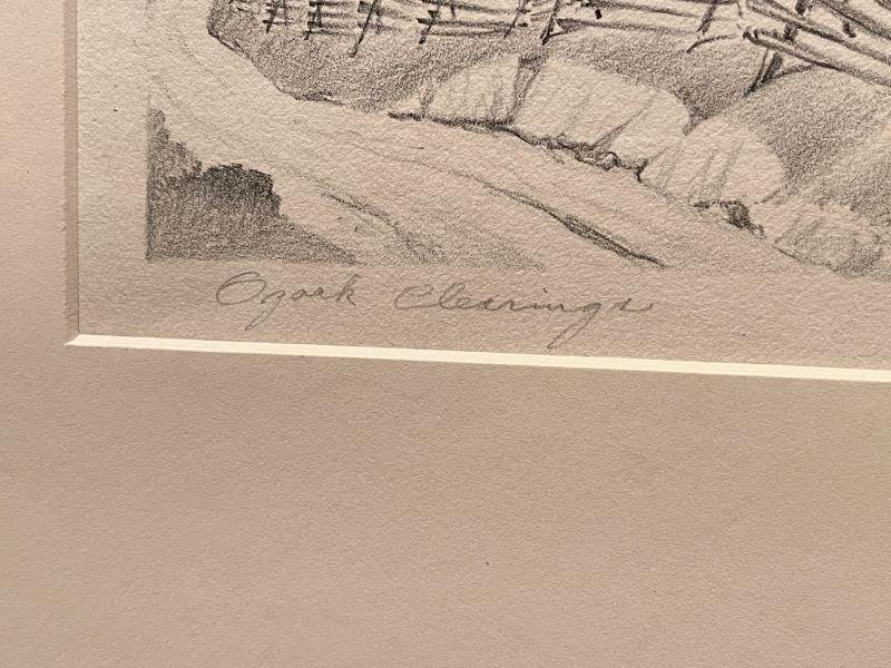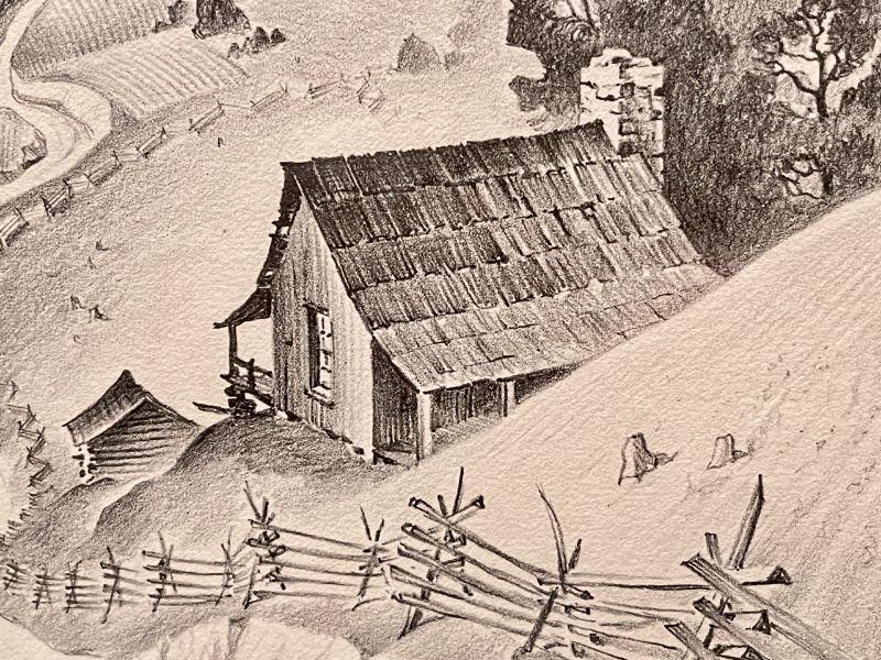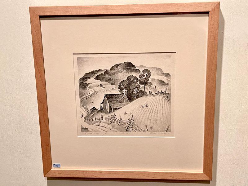 This is an original signed etching by founding Prairie Printmaker Lloyd Foltz who has rendered the rolling hills of the Ozark countryside featuring a romantically rustic cabin nestled into a hillside bordered by a split rail fence.
