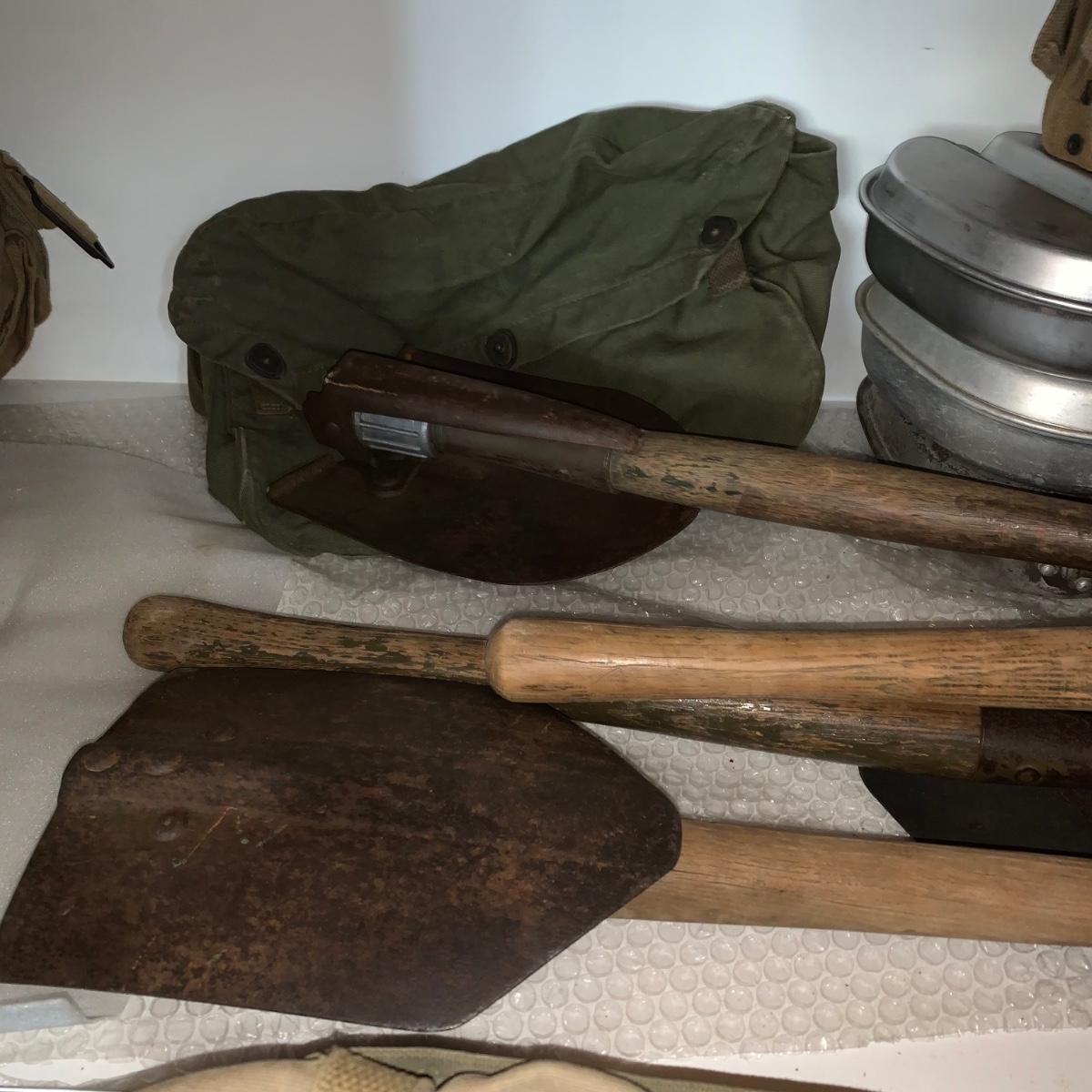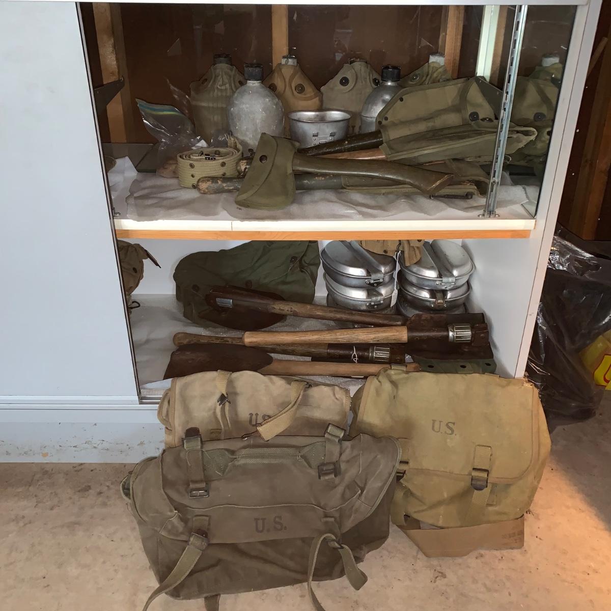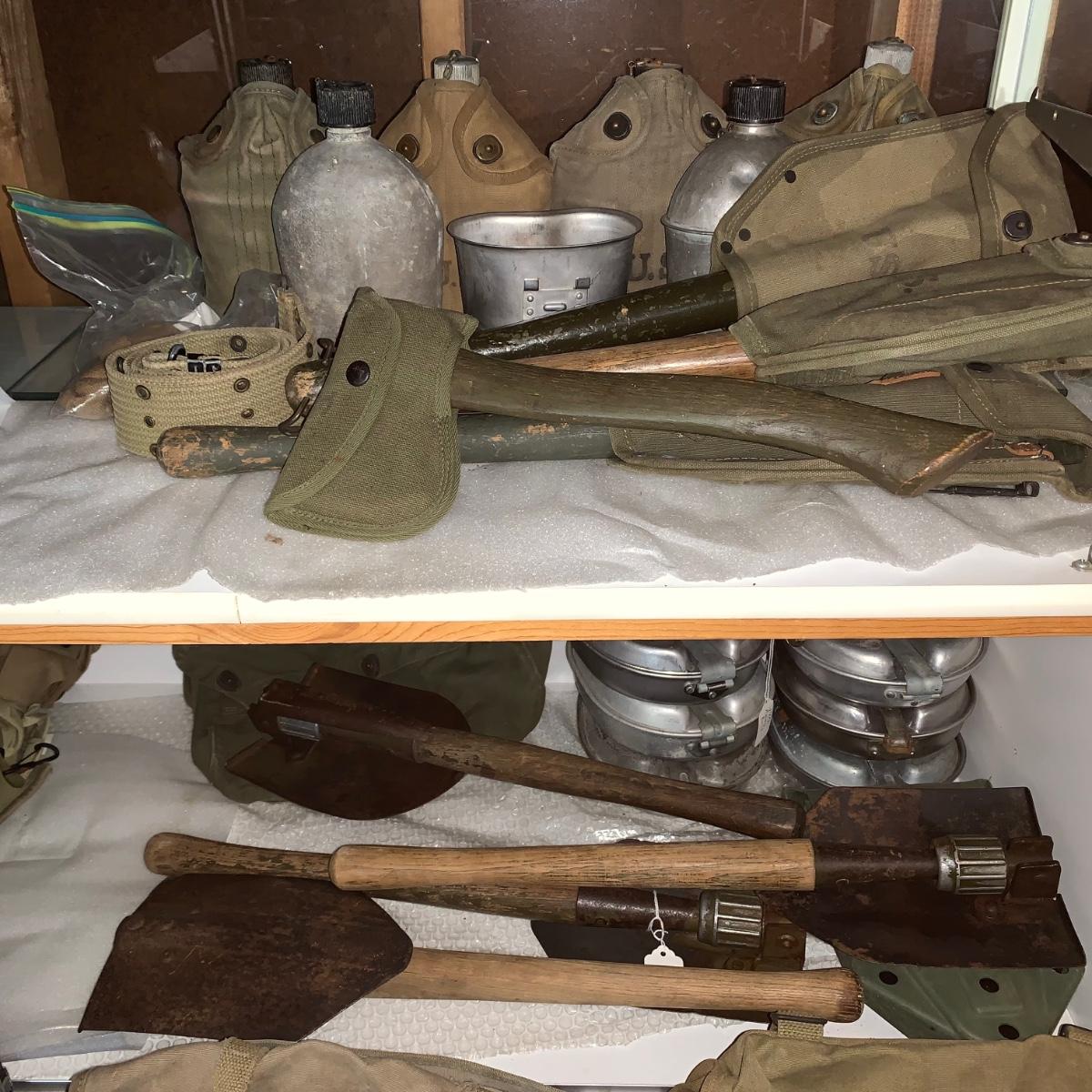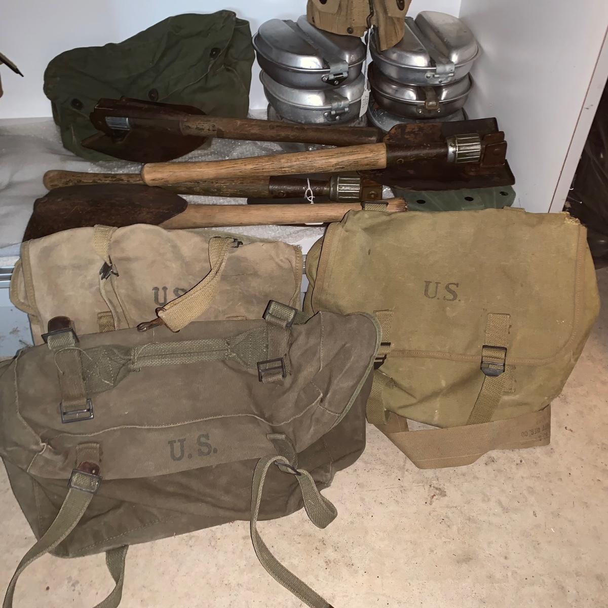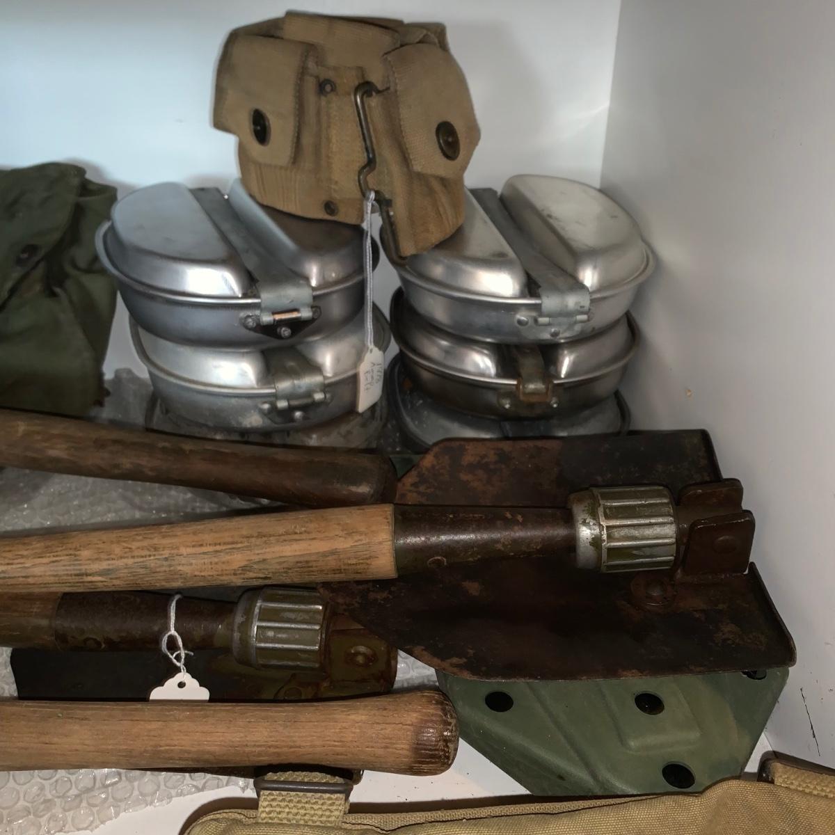 Lot 168R: Vintage Lot of Military Issued Shovels, Canteens, Mess Kits, Gear Bags
