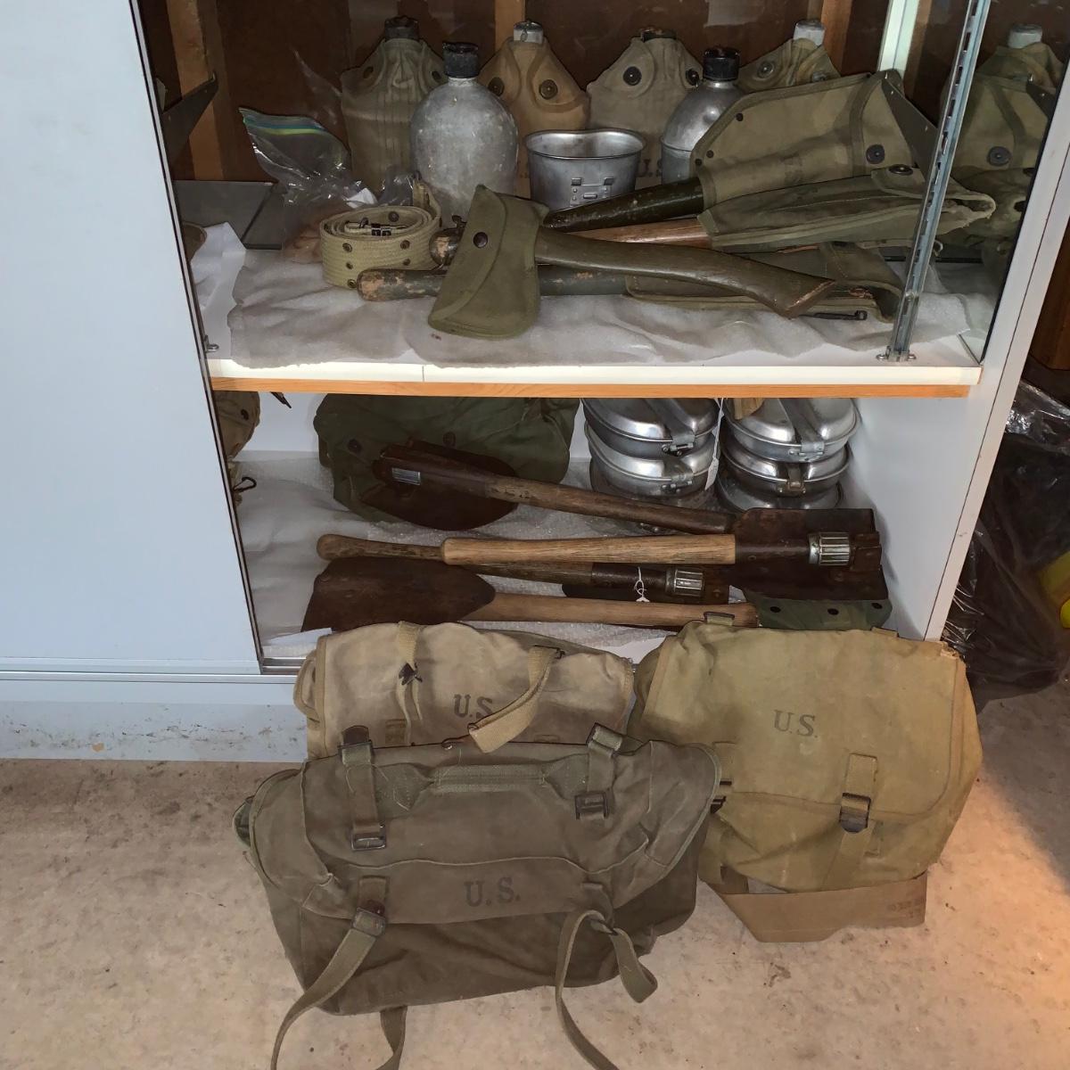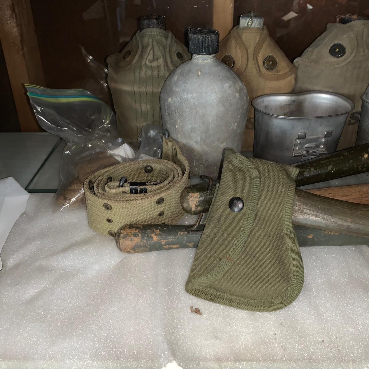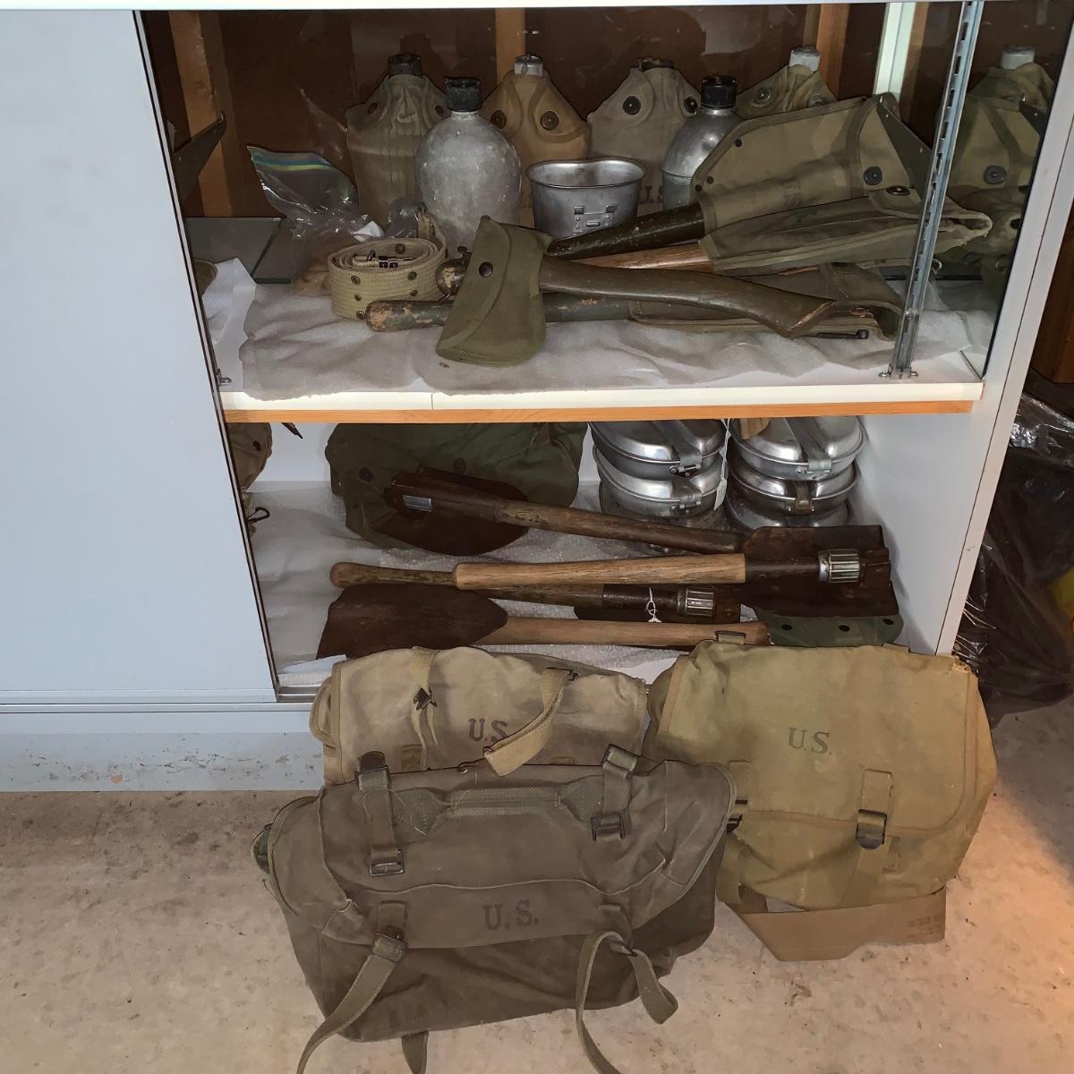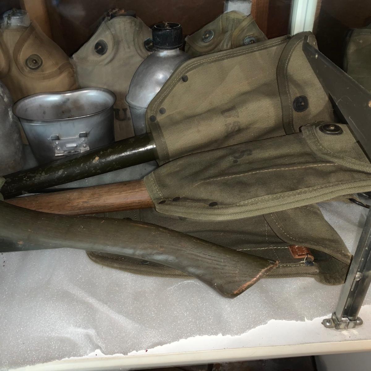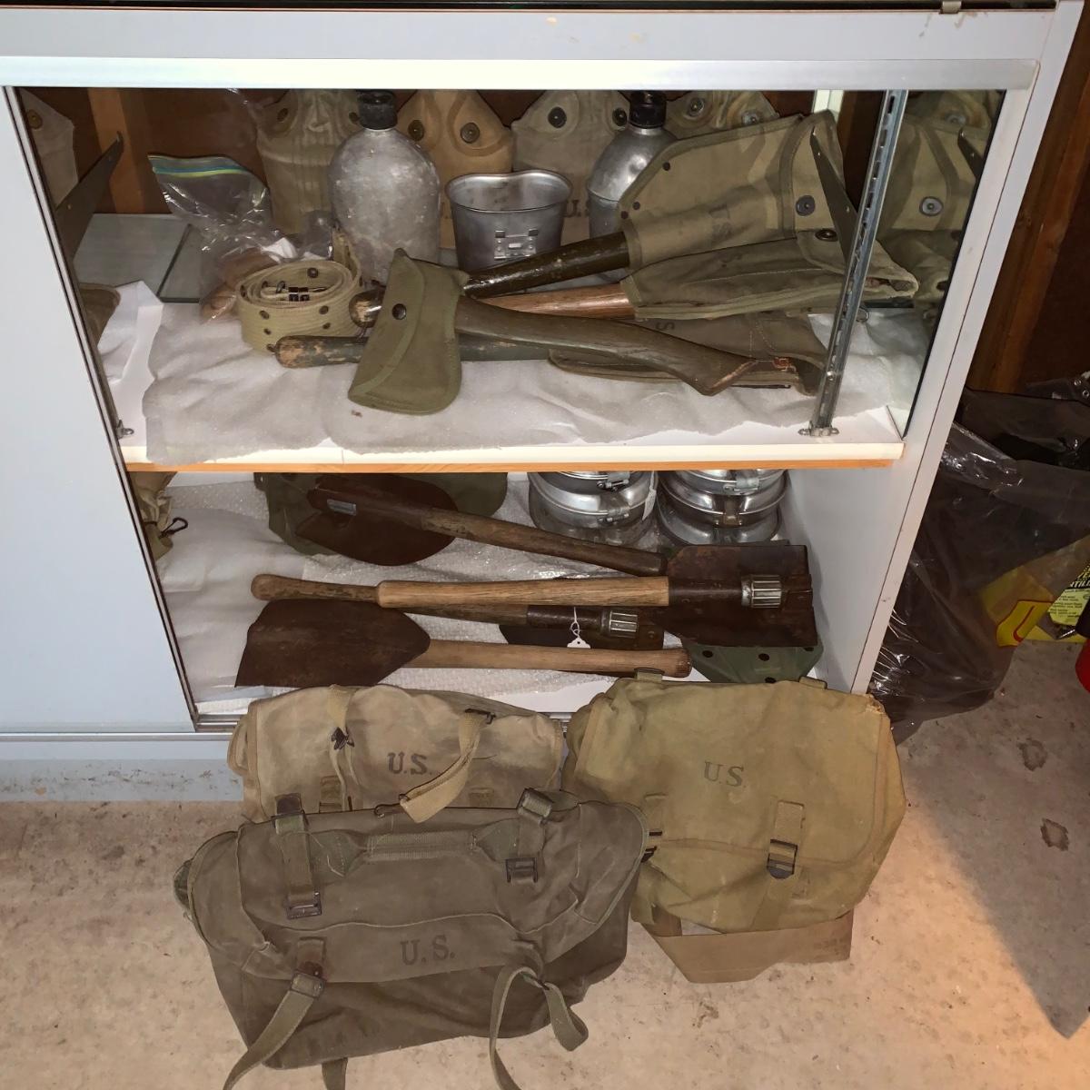 Lot 168R: Vintage Lot of Military Issued Shovels, Canteens, Mess Kits, Gear Bags