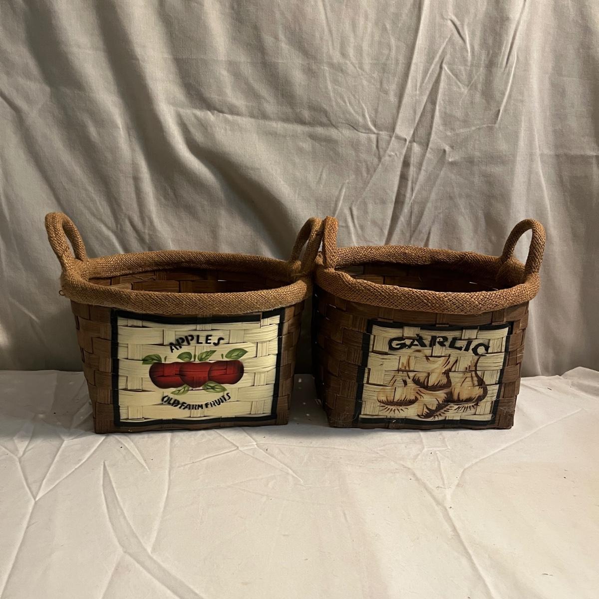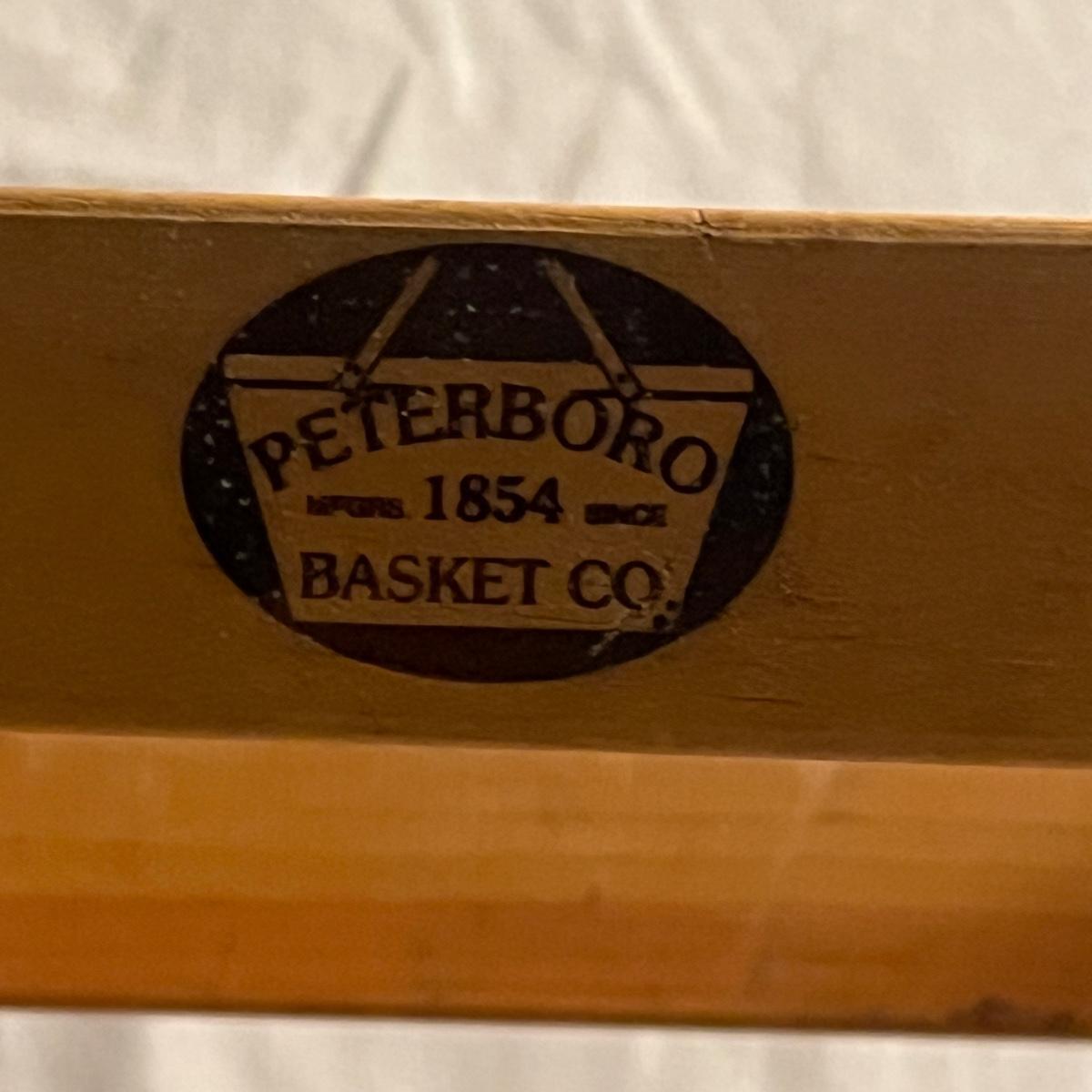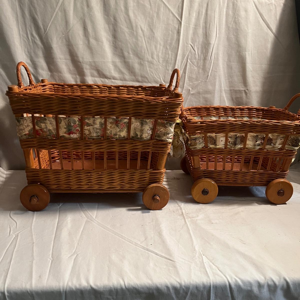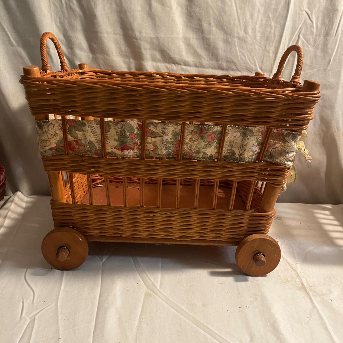 Lot contains a large selection, including two rolling baskets, Peterboro wood basket rack, four lined baskets and more basket in a variety of styles and sizes. Largest wheeled basket measures 15.5” x 18” x 16..5”H.