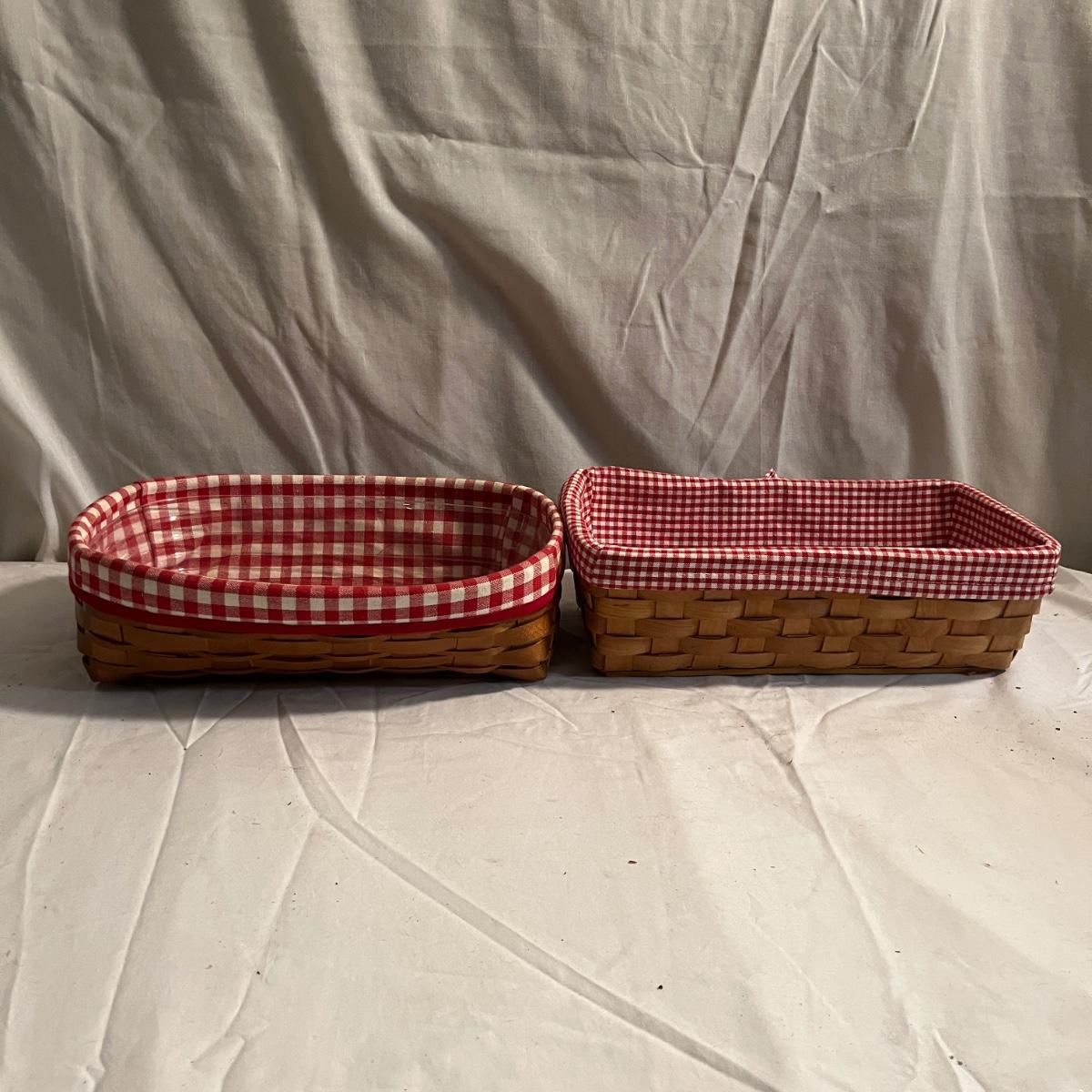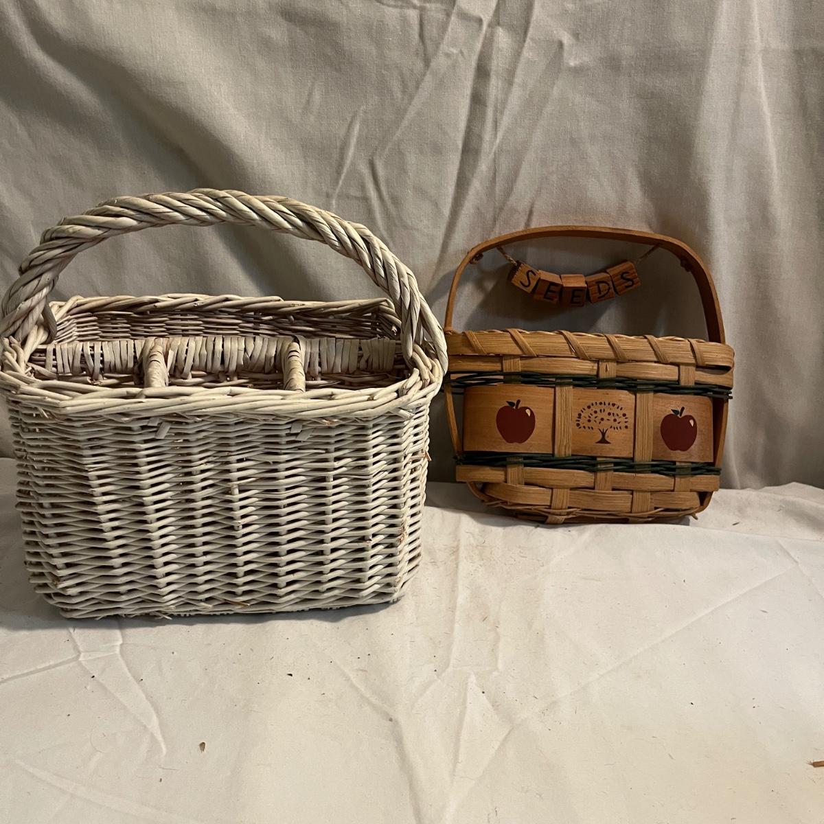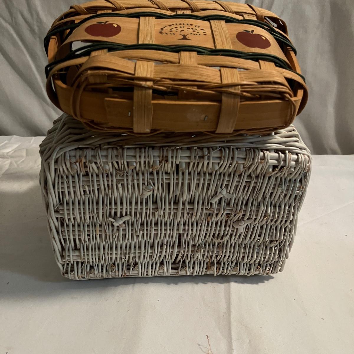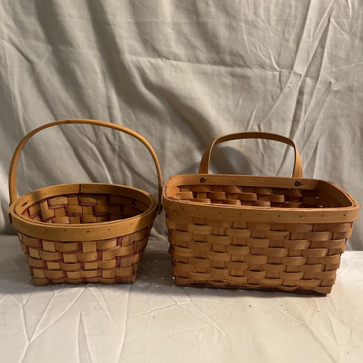 Lot contains a large selection, including two rolling baskets, Peterboro wood basket rack, four lined baskets and more basket in a variety of styles and sizes. Largest wheeled basket measures 15.5” x 18” x 16..5”H.