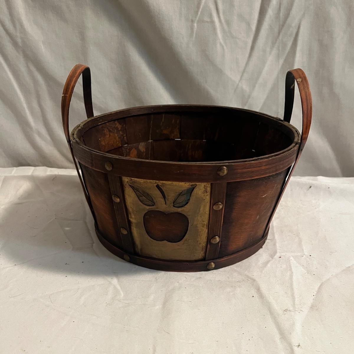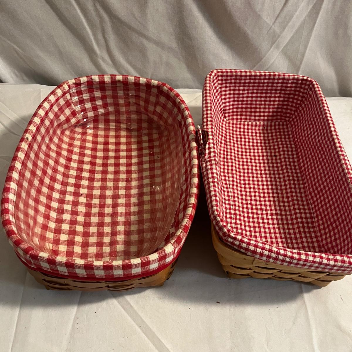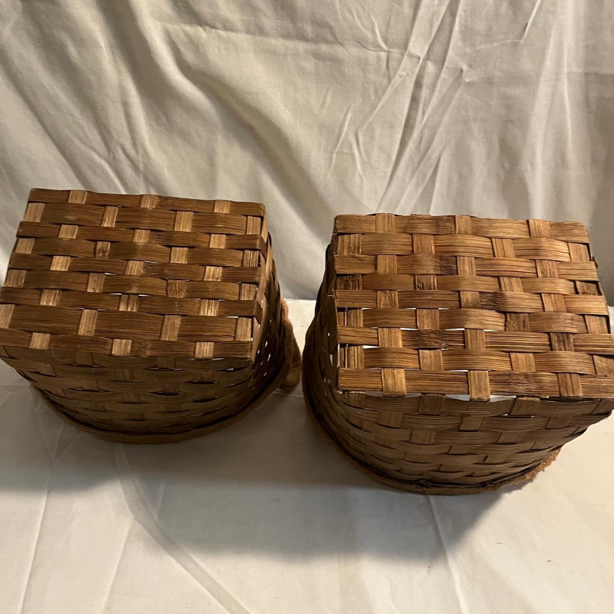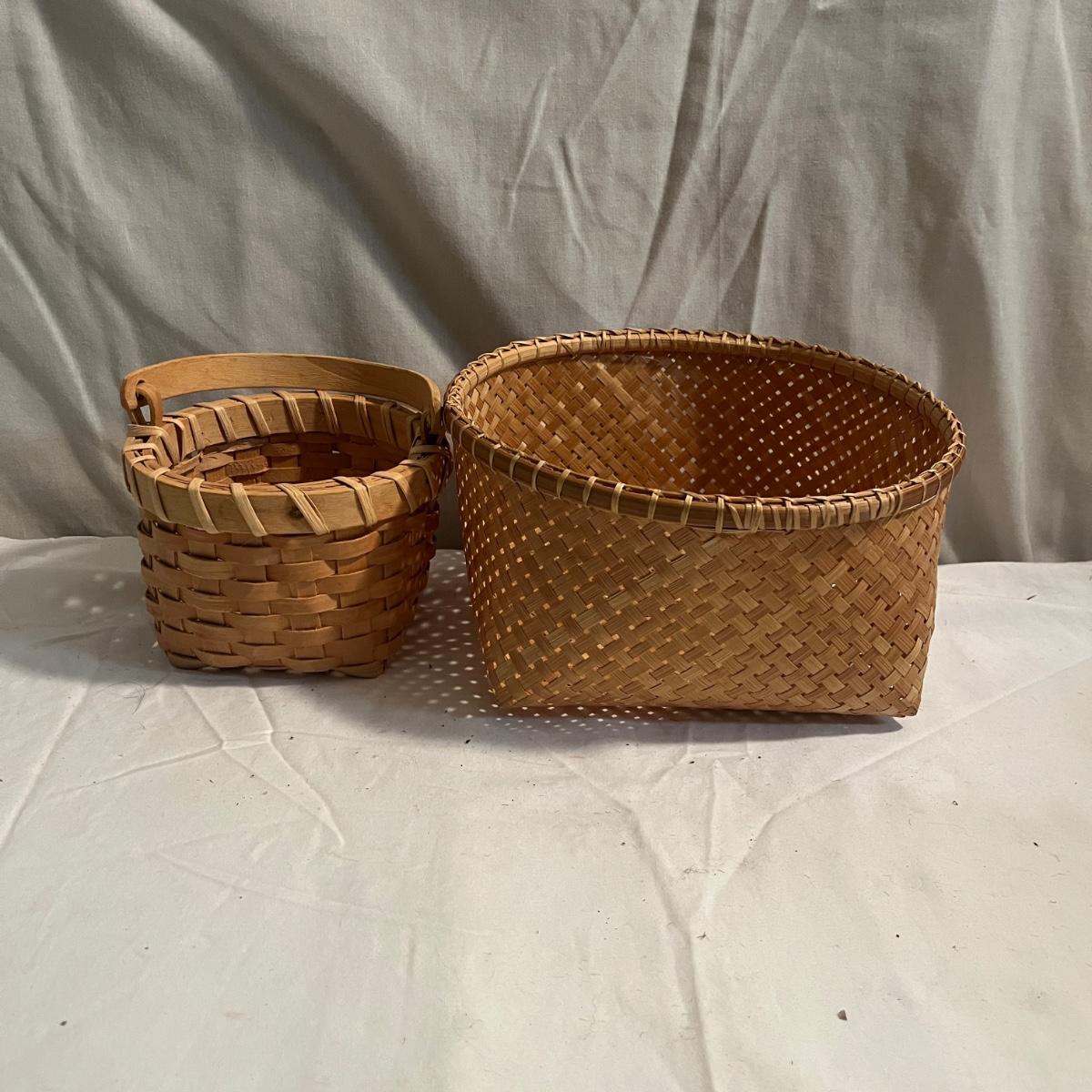 Lot contains a large selection, including two rolling baskets, Peterboro wood basket rack, four lined baskets and more basket in a variety of styles and sizes. Largest wheeled basket measures 15.5” x 18” x 16..5”H.