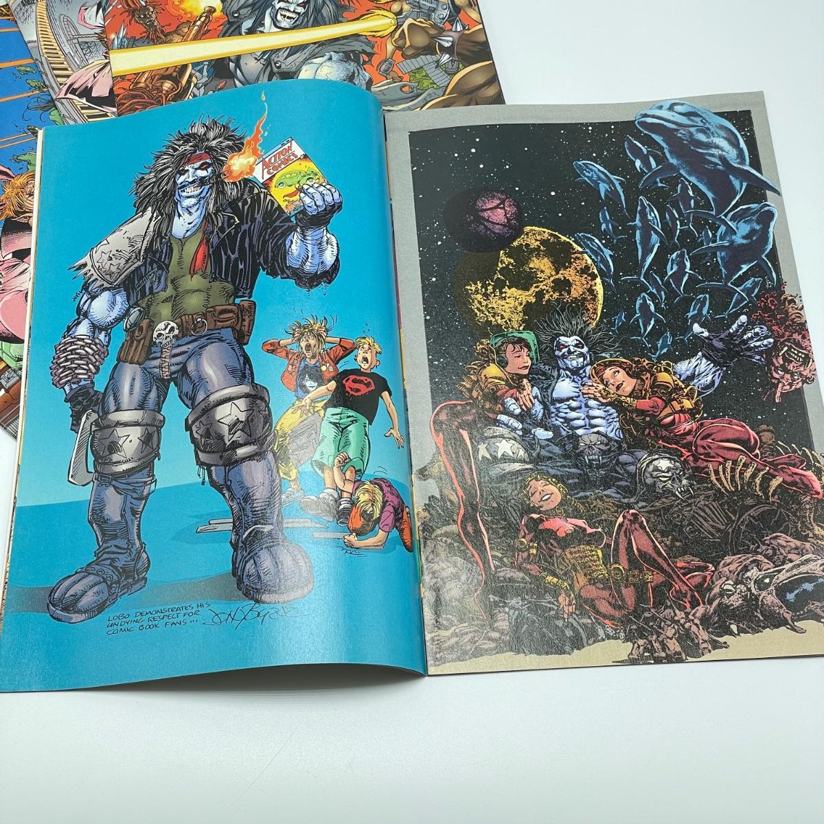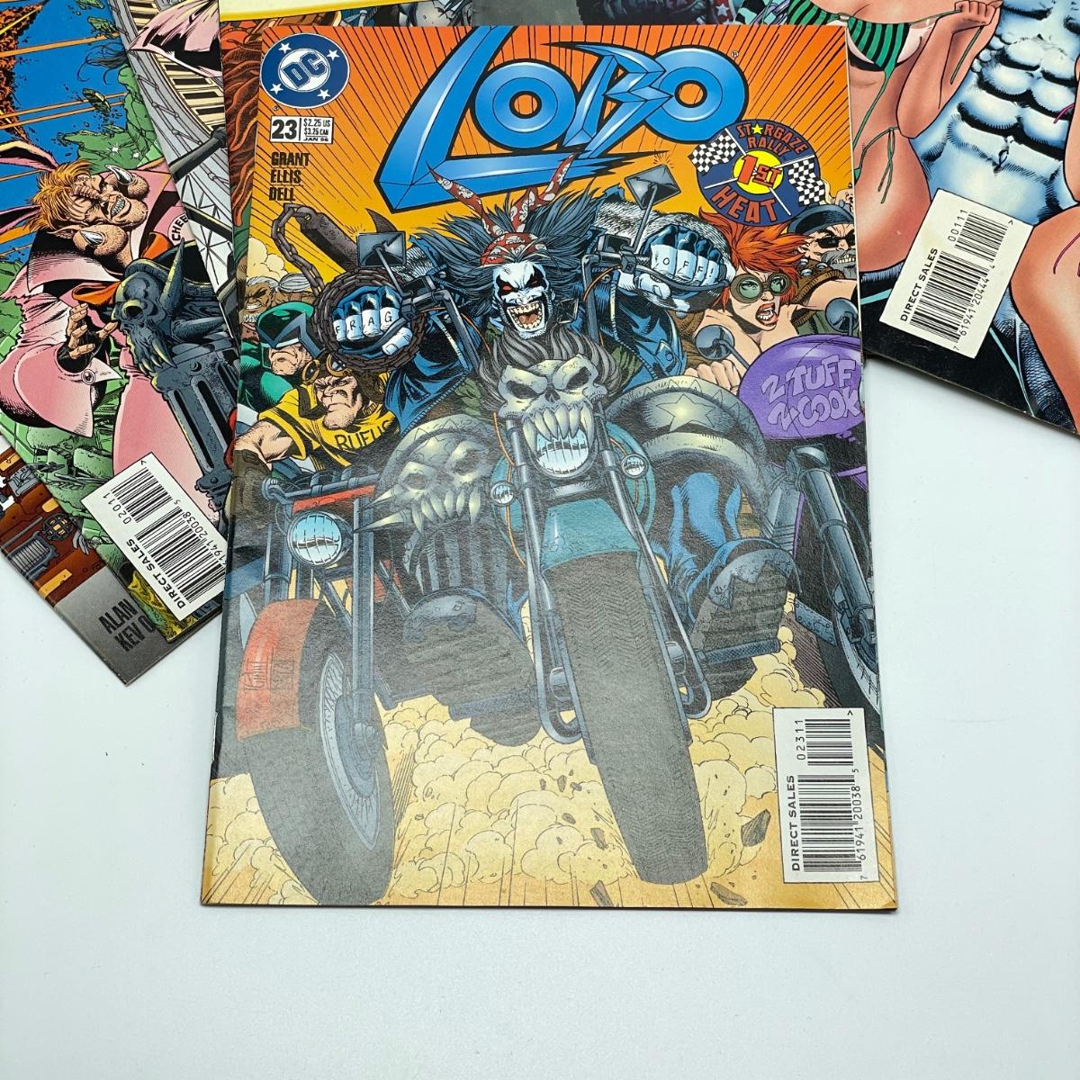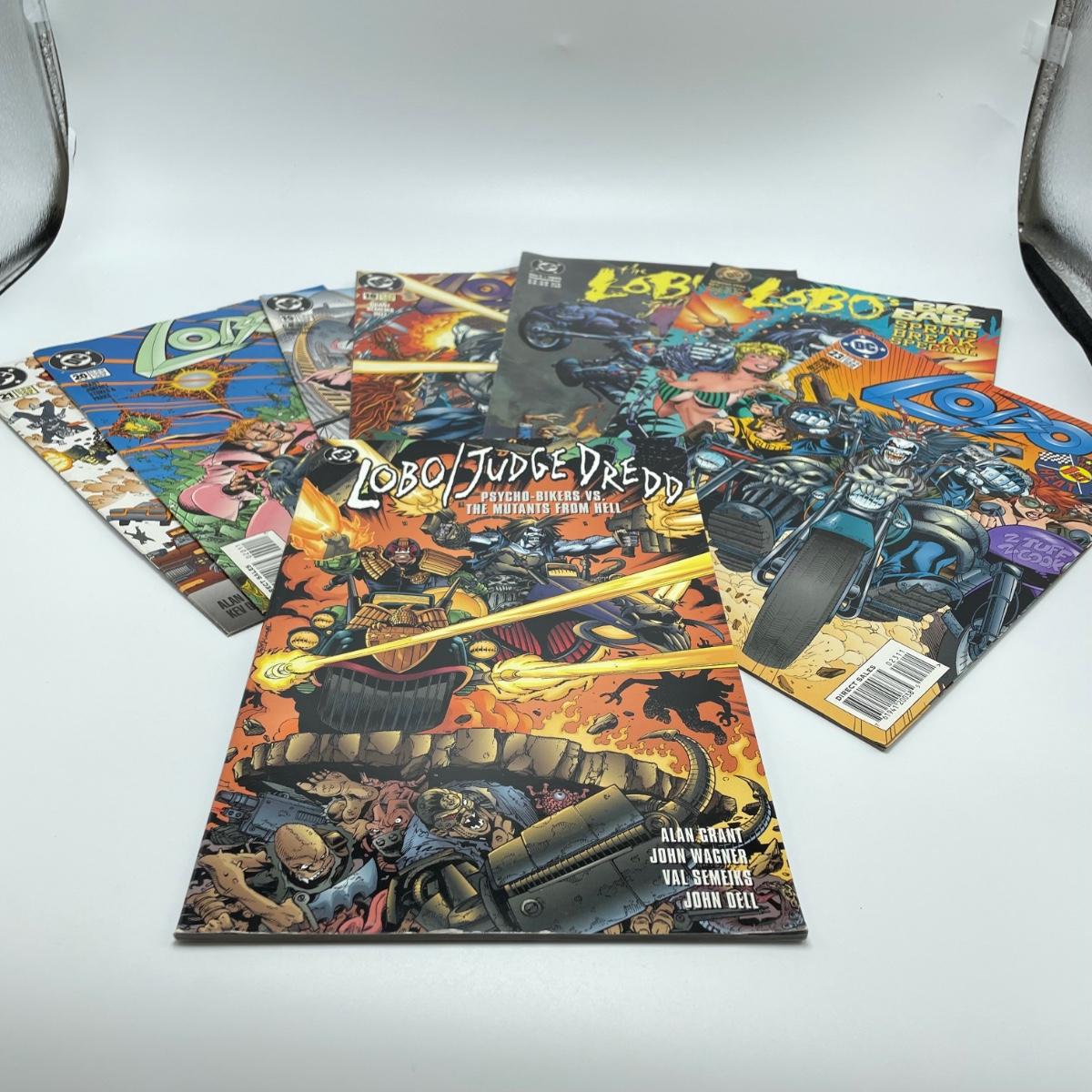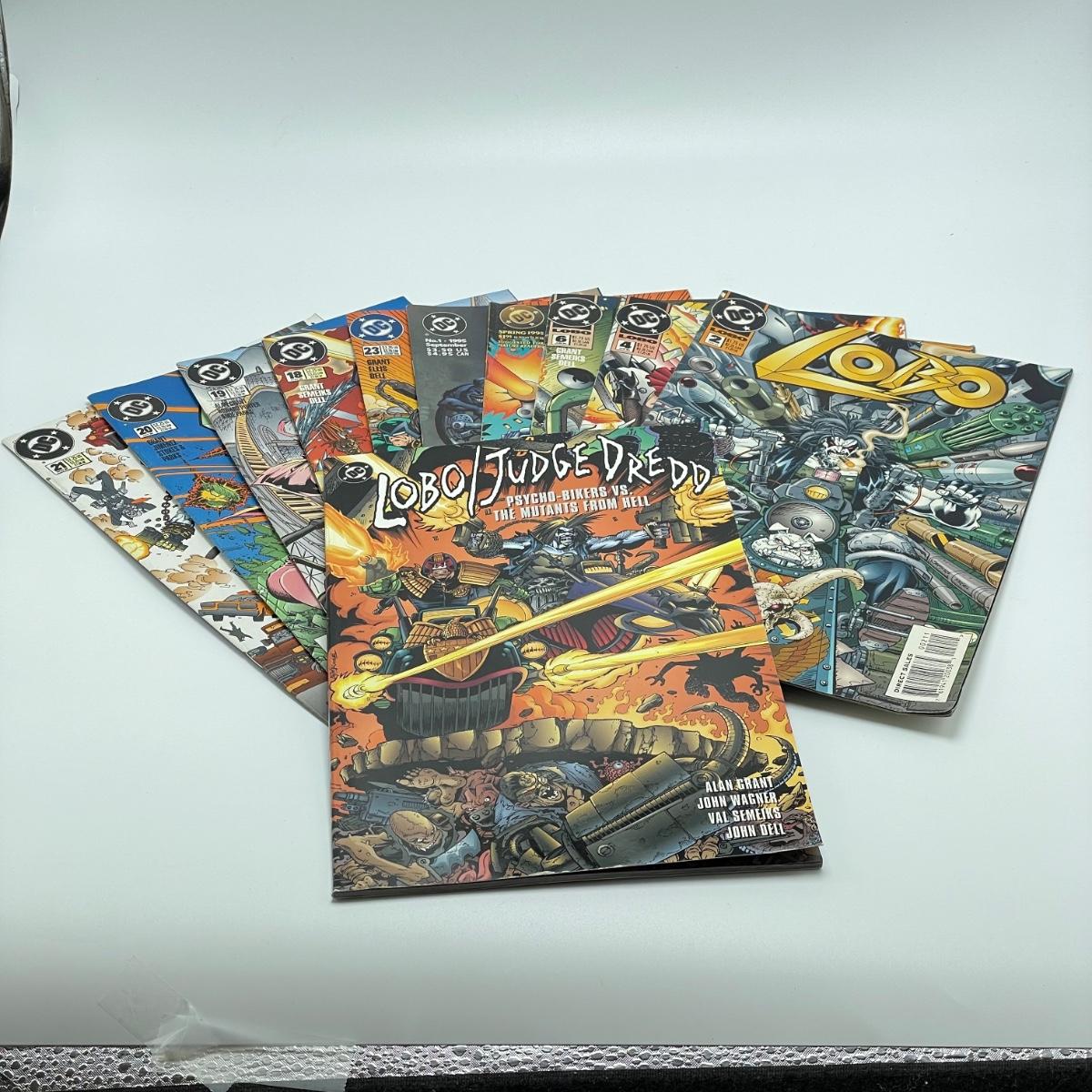 1995 book Lobo/Judge Dredd Psycho-Biker vs. The Mutant From Hell. Issues 18-21 from 1995 and issue 23 from 1996. Lot also includes 1994’s #2, #4, #6, Lobo’s Big Babe Spring Break Special and The Lobo Gallery, Portraits of a Bastich. See images. Items are sold as-is. No returns or refunds. Please bid accordingly.
