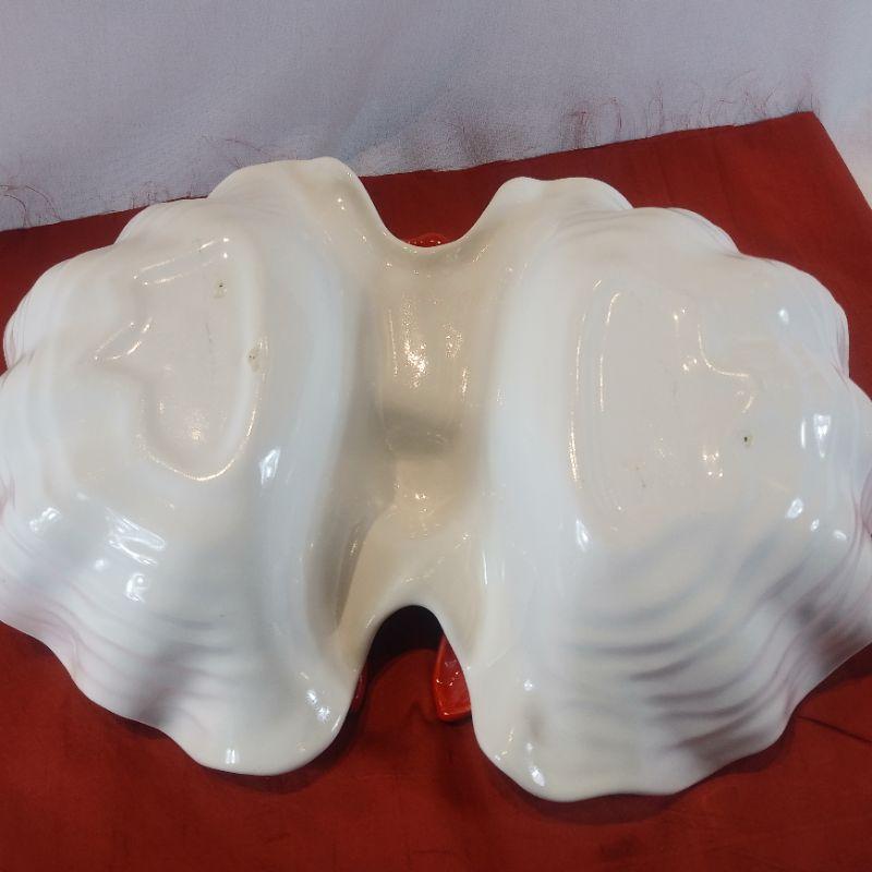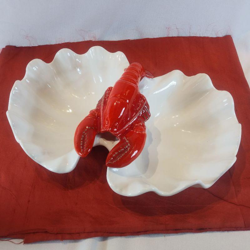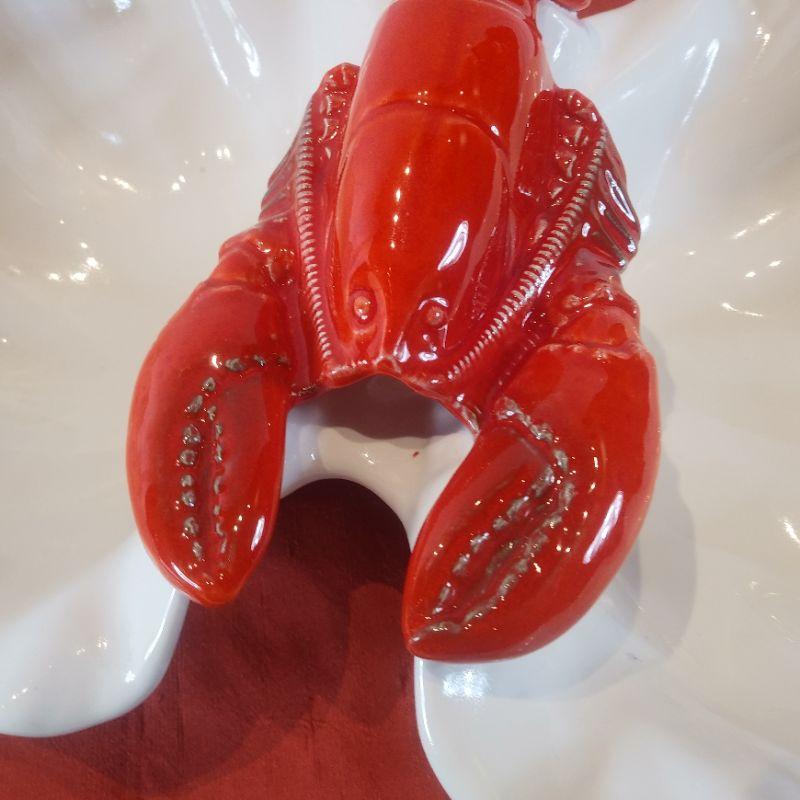 This lot is for a delightful serving bowl. A bright red & white Vitreous China Lobster Bowl just perfect for offering your guests seafood nibbles and bites. The bowl is 14-inches wide X 10-inches long X 5-inches high. Beautiful display piece. Give this lobster a nice home and he won't pinch you.