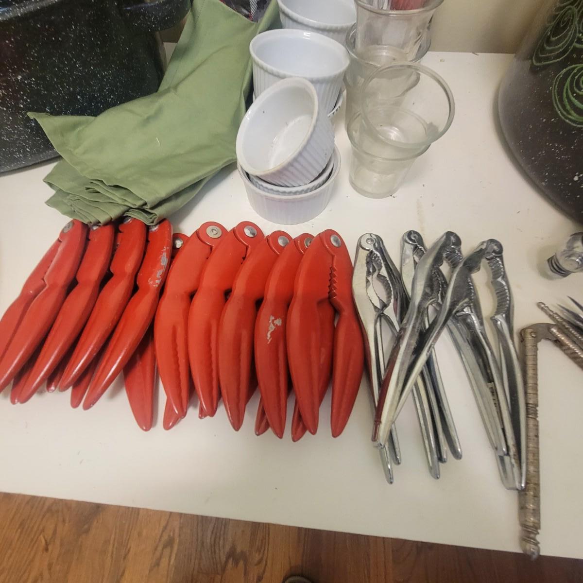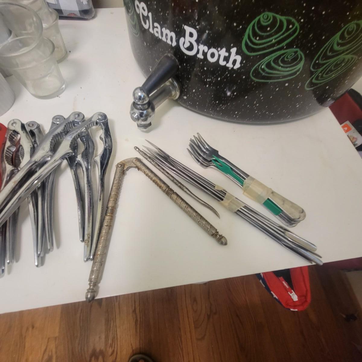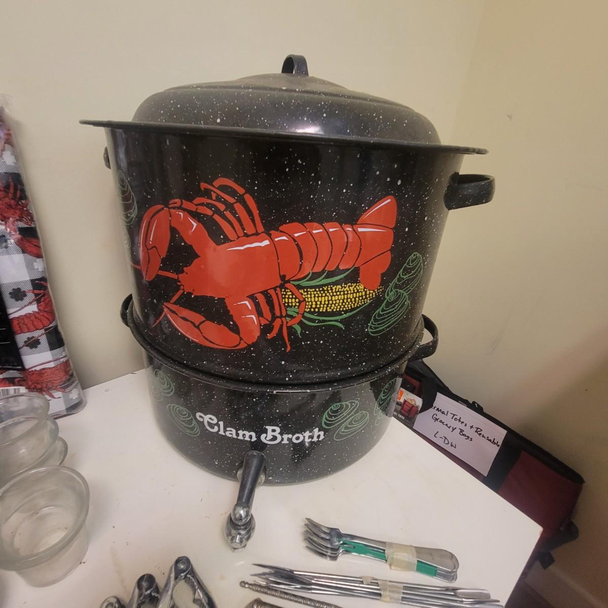 Large lobster steamer, lower pot with valve for broth. An assortment of crackers, tiny forks and picks. Includes multiple butter cups, a tablecloth, napkins, clam serving dish and a large roasting pan. Steam pot measures approximately 16" x 15". Local pickup only