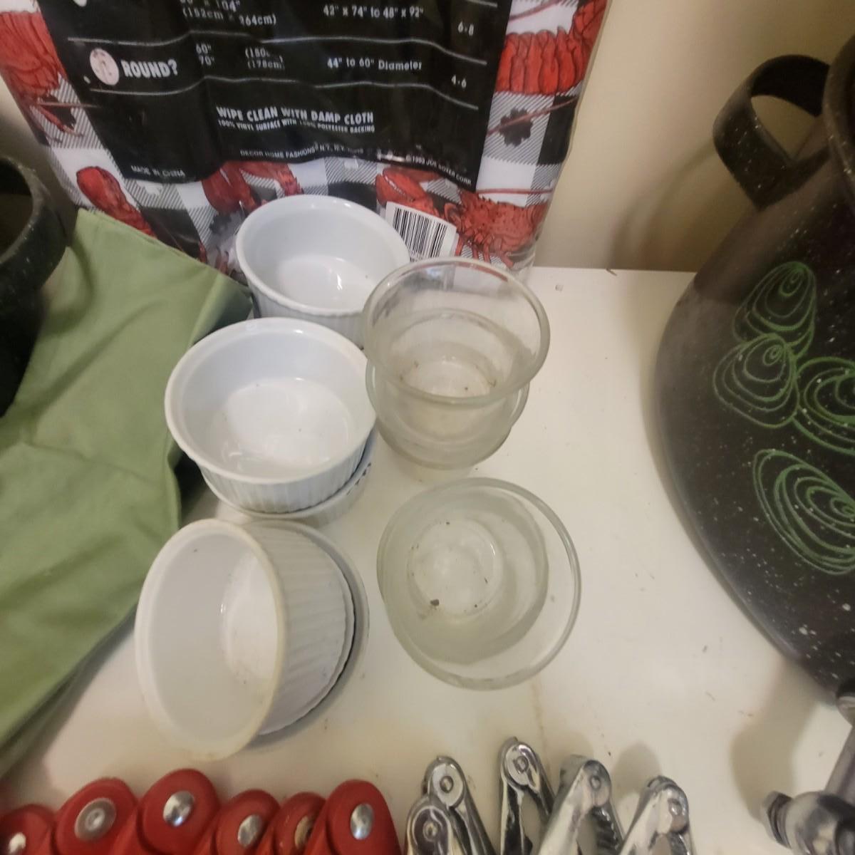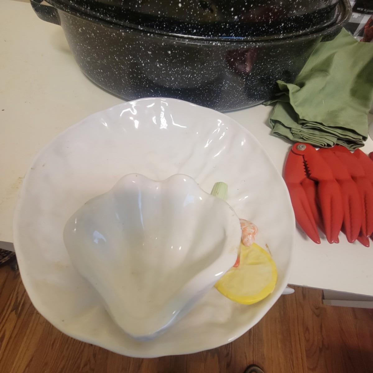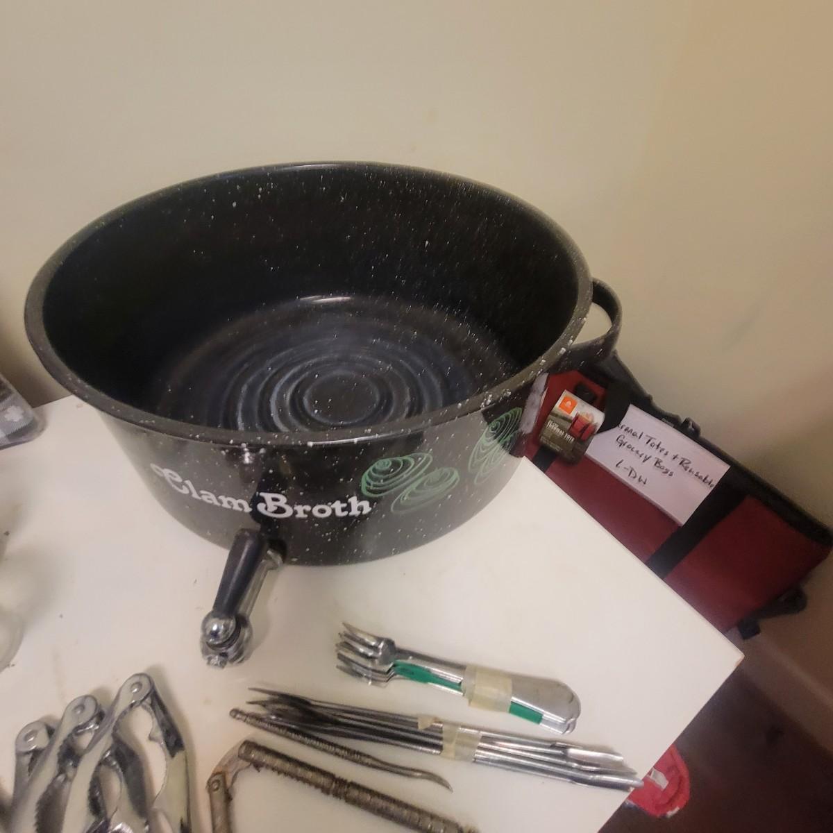 Large lobster steamer, lower pot with valve for broth. An assortment of crackers, tiny forks and picks. Includes multiple butter cups, a tablecloth, napkins, clam serving dish and a large roasting pan. Steam pot measures approximately 16" x 15". Local pickup only