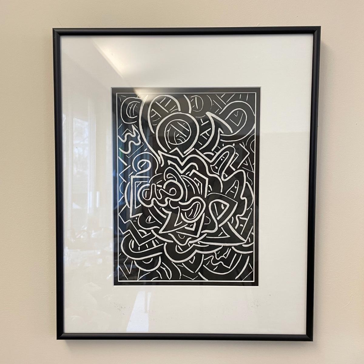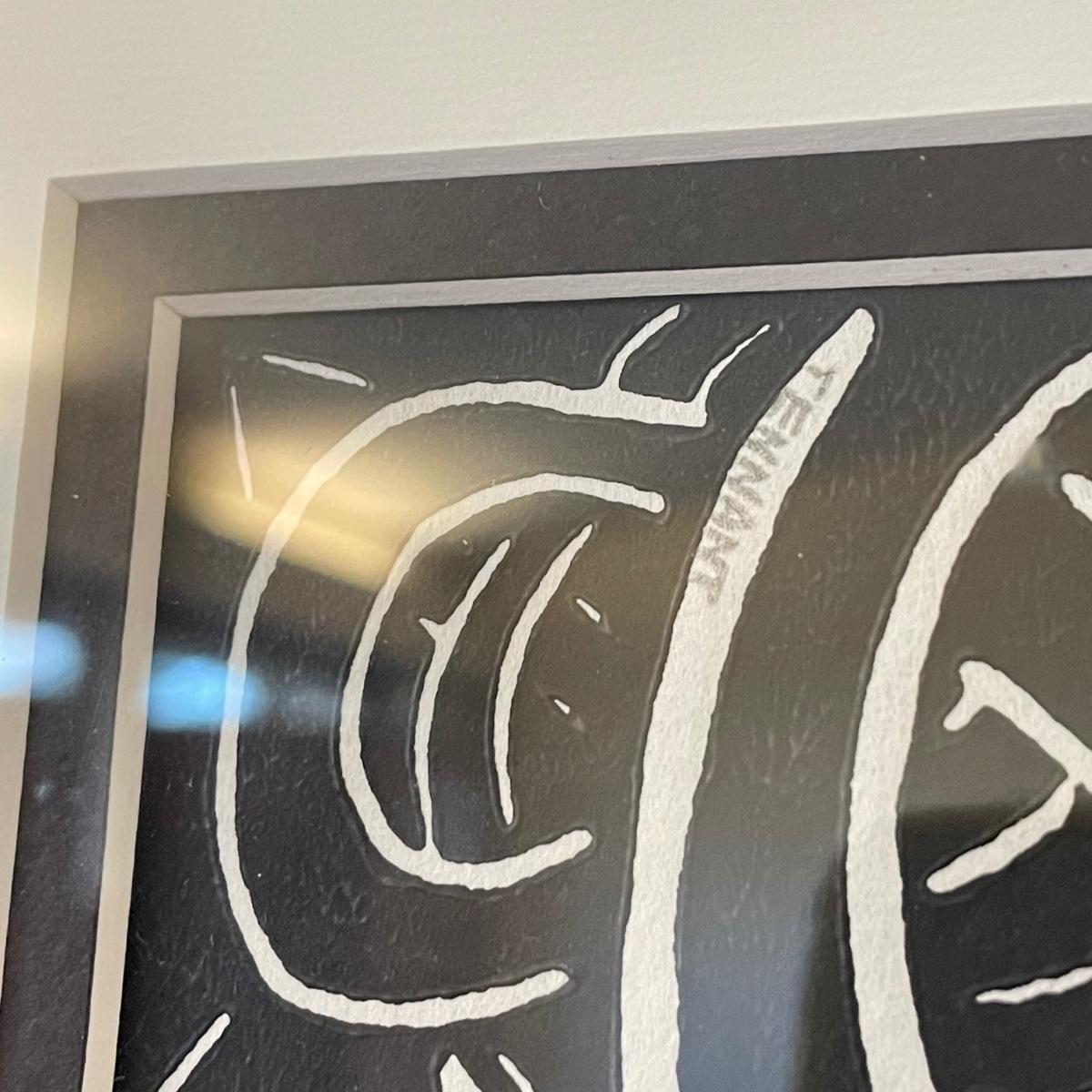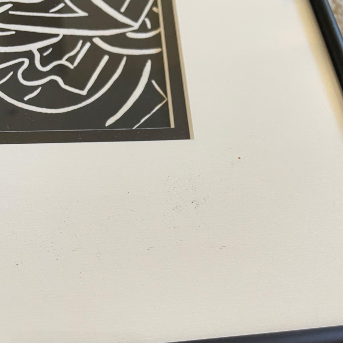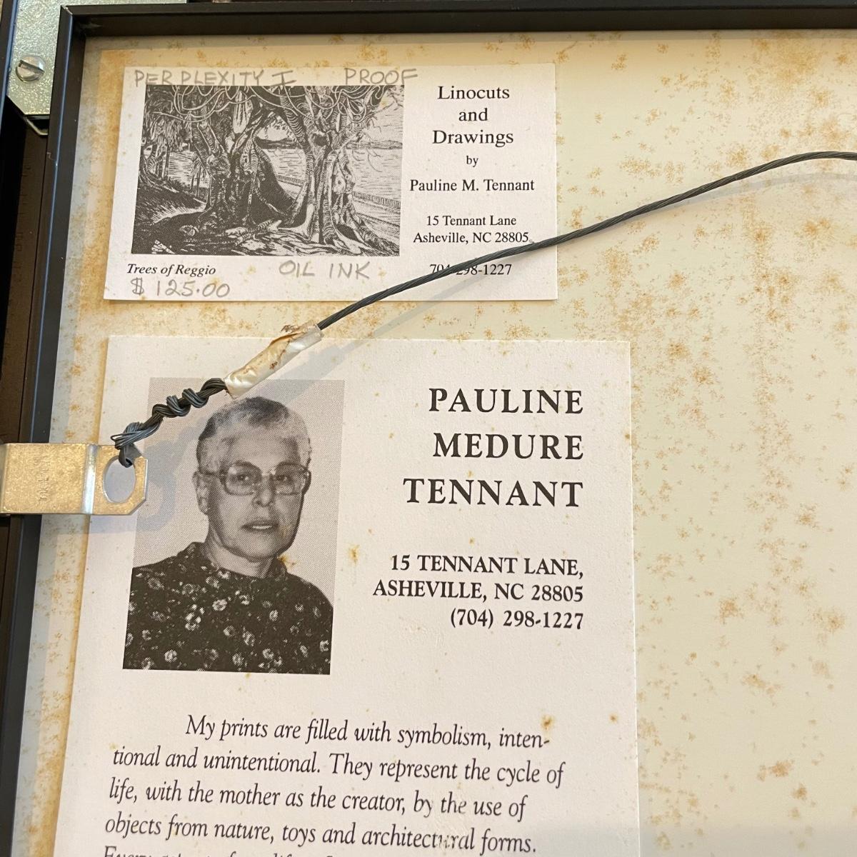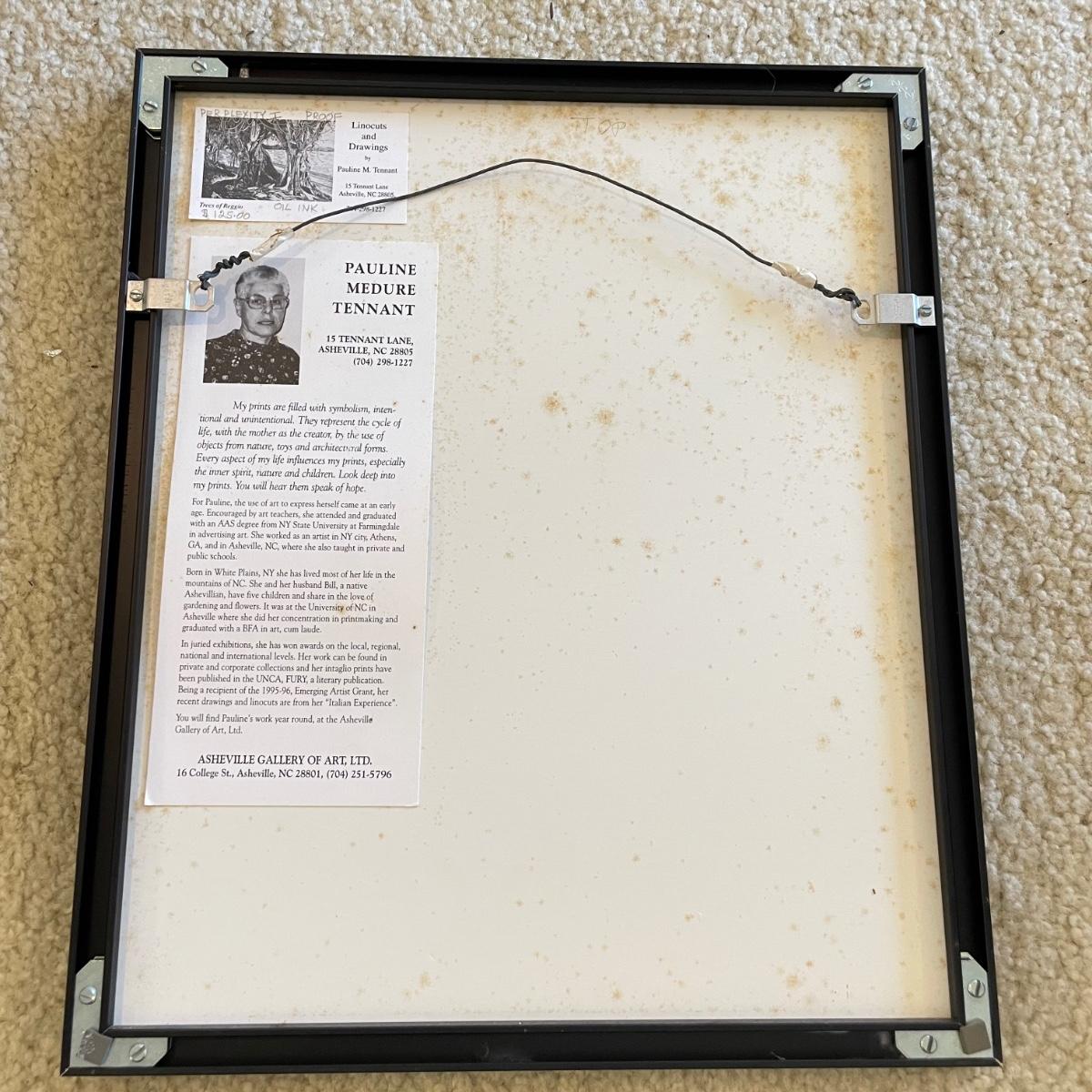 Signed and matted art by Pauline M Tennant. Art appears to have been pencil signed, card on the back also has “Perplexity I Proof”, “Oil Ink” and more hand written on a business card. Art sits behind glass, there is some spotting on the white matting, see images. Frame measures 15.75” x 13”H and is aluminum. Shipping available. Shipping can be costly. We suggest contacting our preferred local shipping provider, Postage Express, with dimensions and getting an estimate before bidding: (828) 670-5501 or shipping@postageexpressnc.com