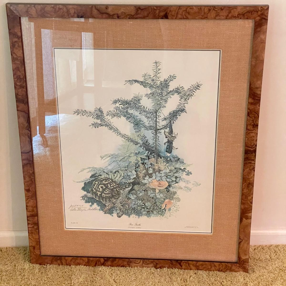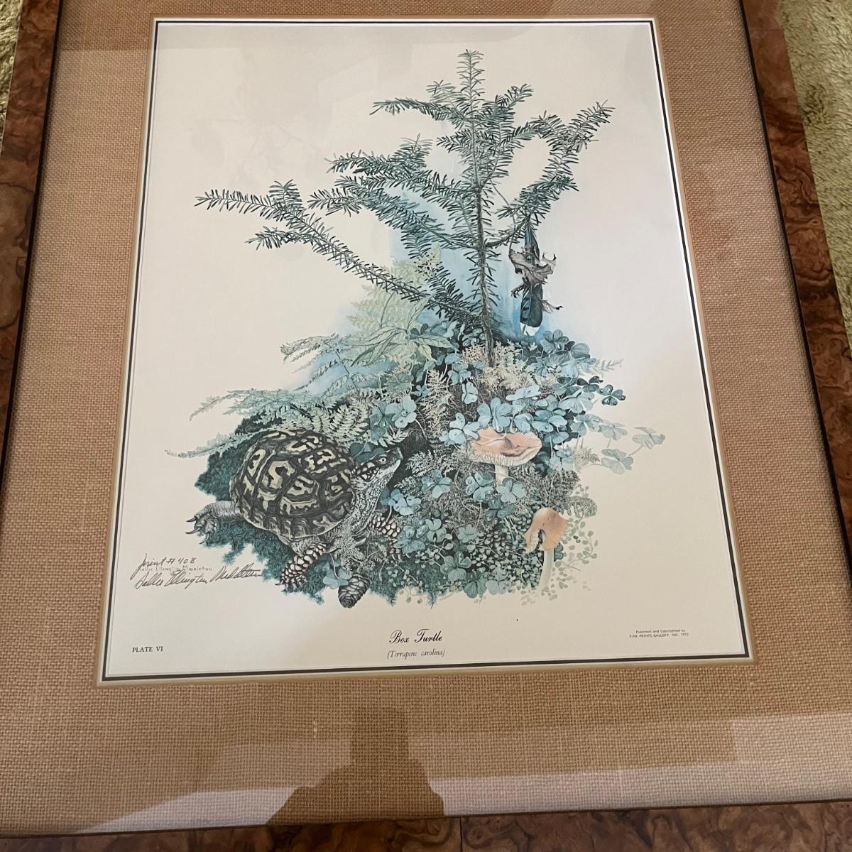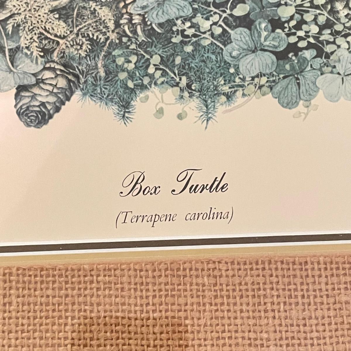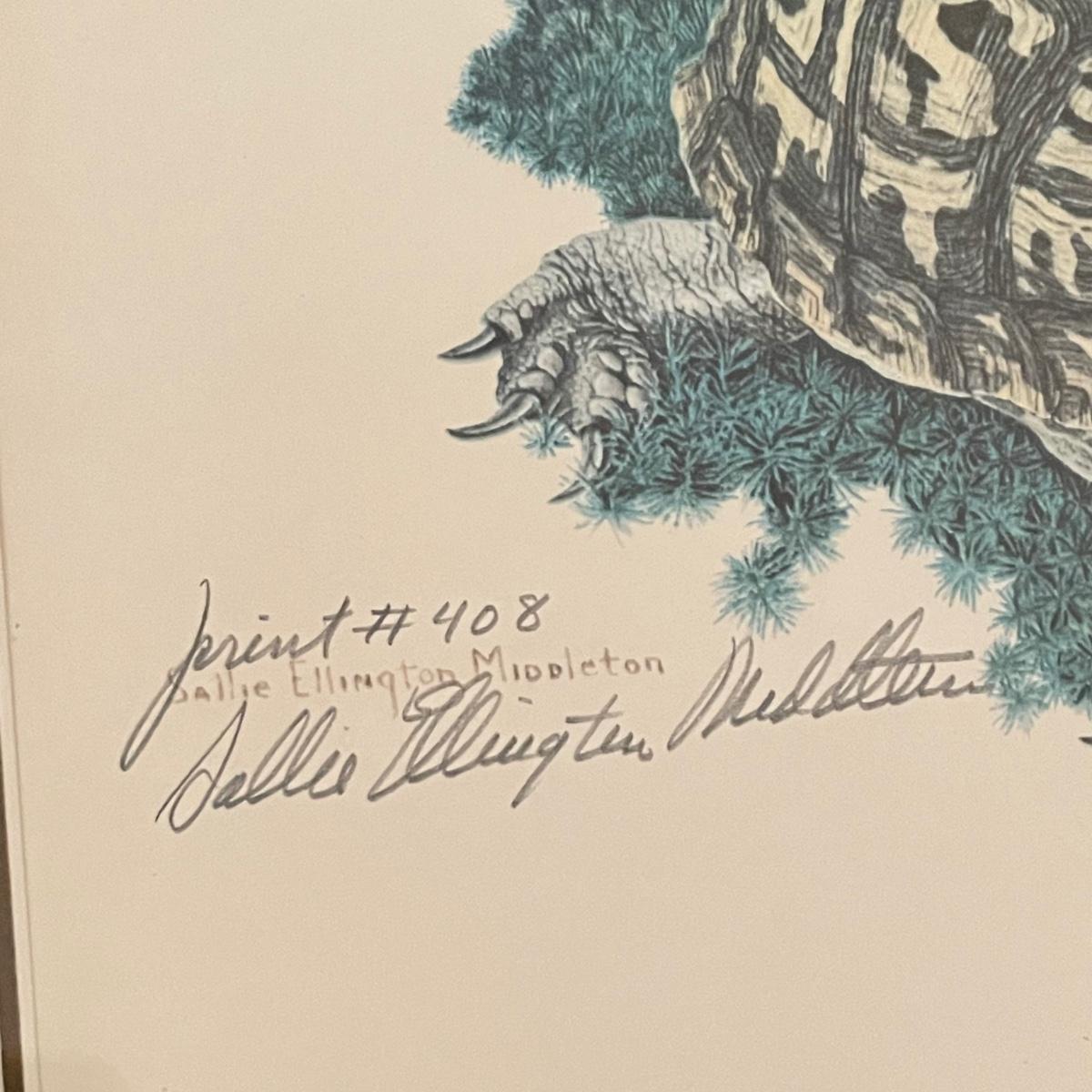 Large framed, pencil signed and numbered Box Turtle plate VI print by local artist Sallie Ellington Middleton. Art sits under a burlap style mat, behind glass in a wooden frame measuring 26” x 31”. See images. Shipping available. Please call our local UPS with dimensions at 828-252-6930 for a shipping quote prior to bidding.