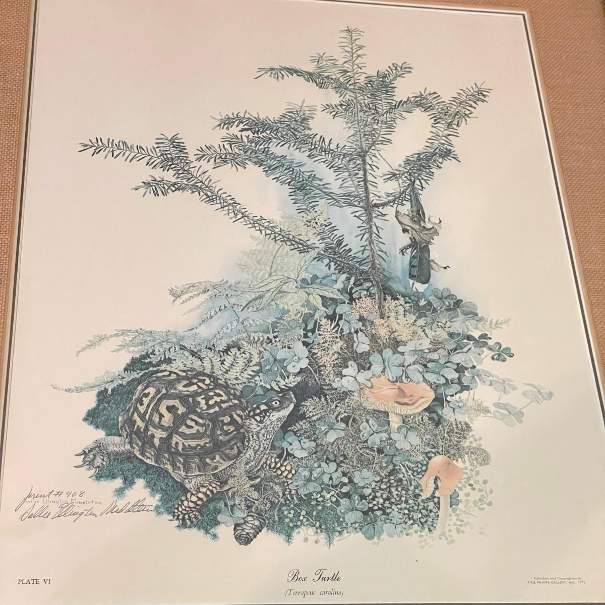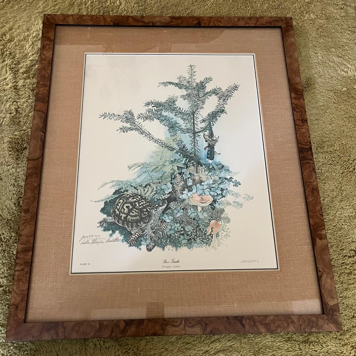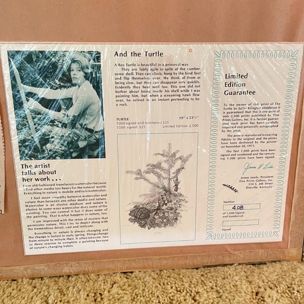 Large framed, pencil signed and numbered Box Turtle plate VI print by local artist Sallie Ellington Middleton. Art sits under a burlap style mat, behind glass in a wooden frame measuring 26” x 31”. See images. Shipping available. Please call our local UPS with dimensions at 828-252-6930 for a shipping quote prior to bidding.