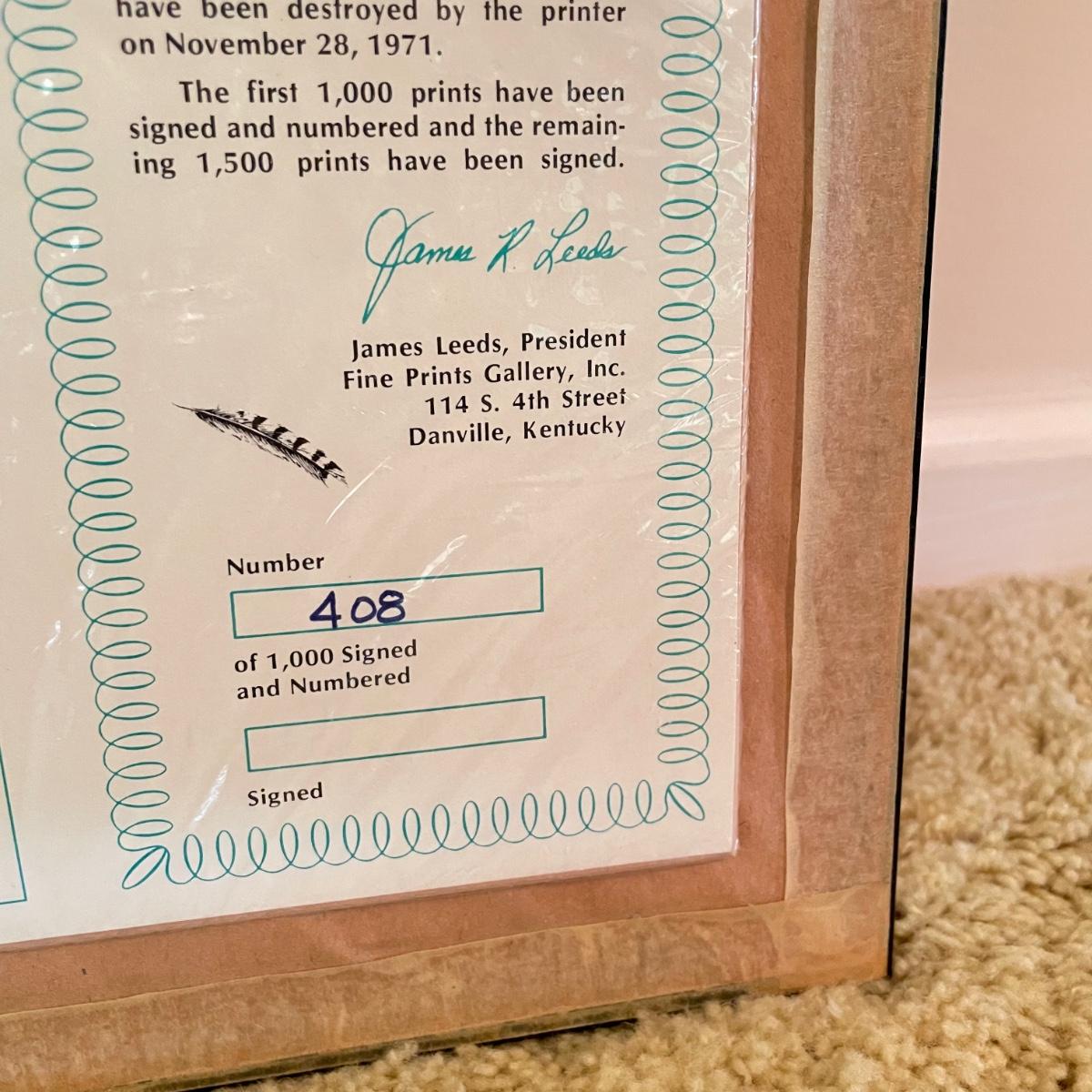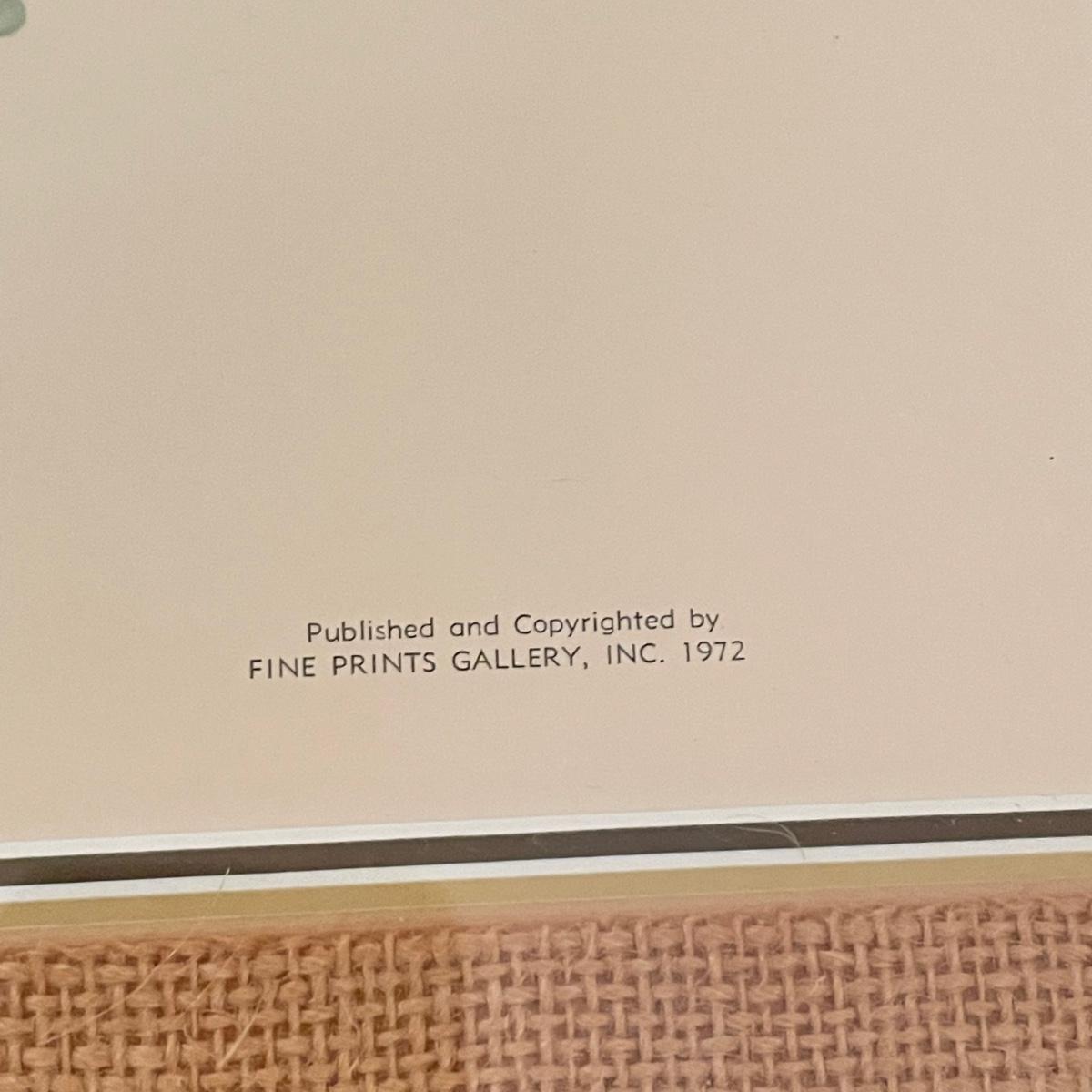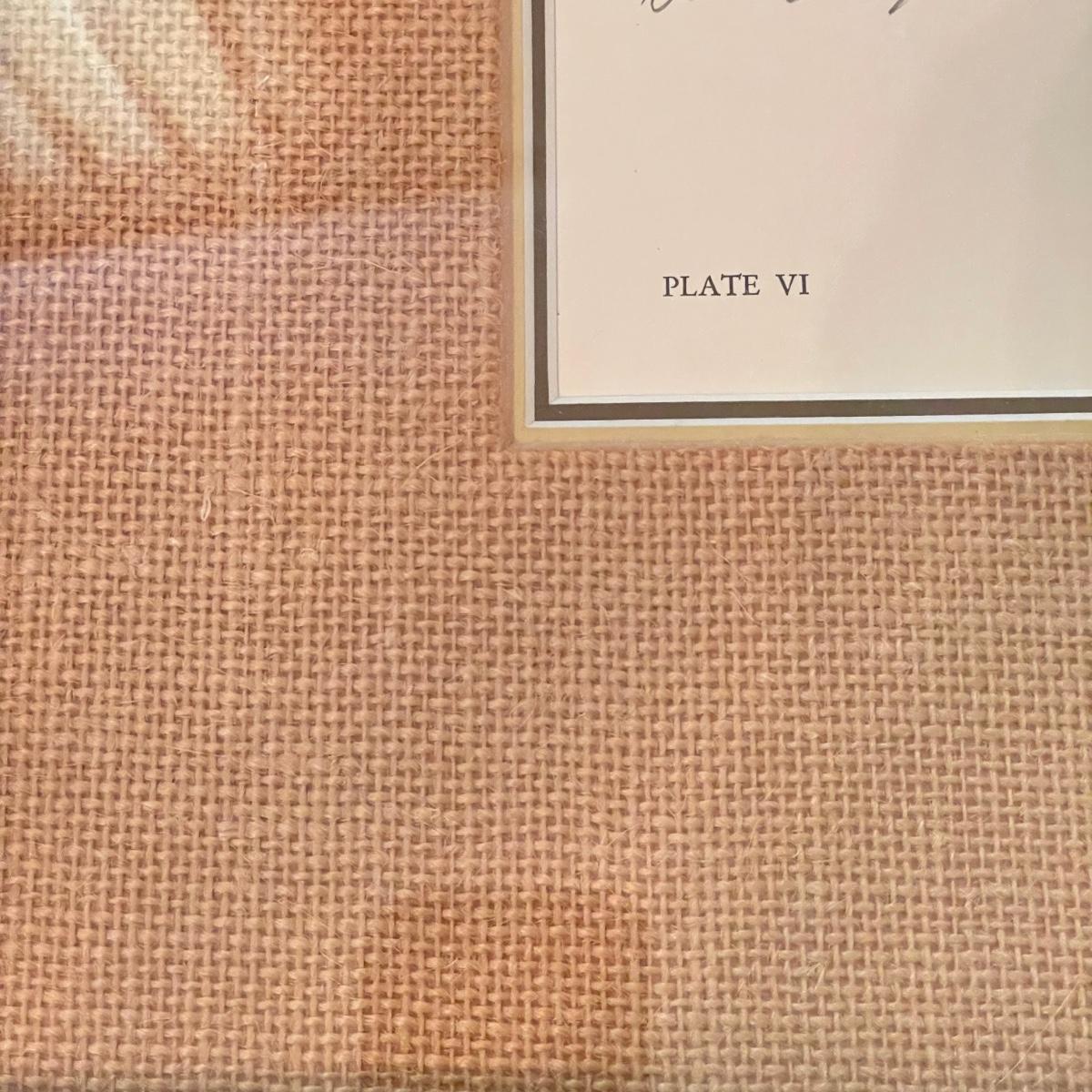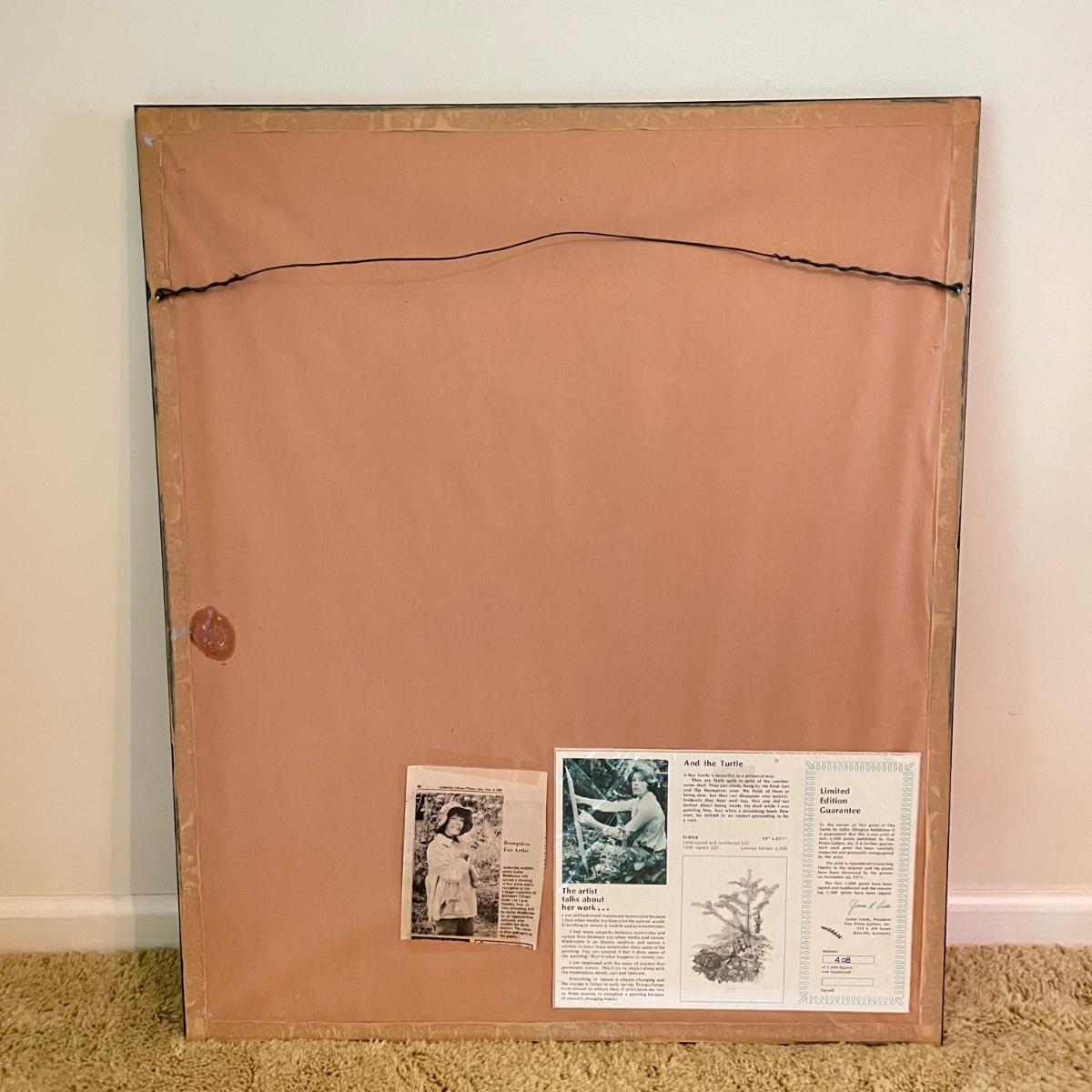 Large framed, pencil signed and numbered Box Turtle plate VI print by local artist Sallie Ellington Middleton. Art sits under a burlap style mat, behind glass in a wooden frame measuring 26” x 31”. See images. Shipping available. Please call our local UPS with dimensions at 828-252-6930 for a shipping quote prior to bidding.