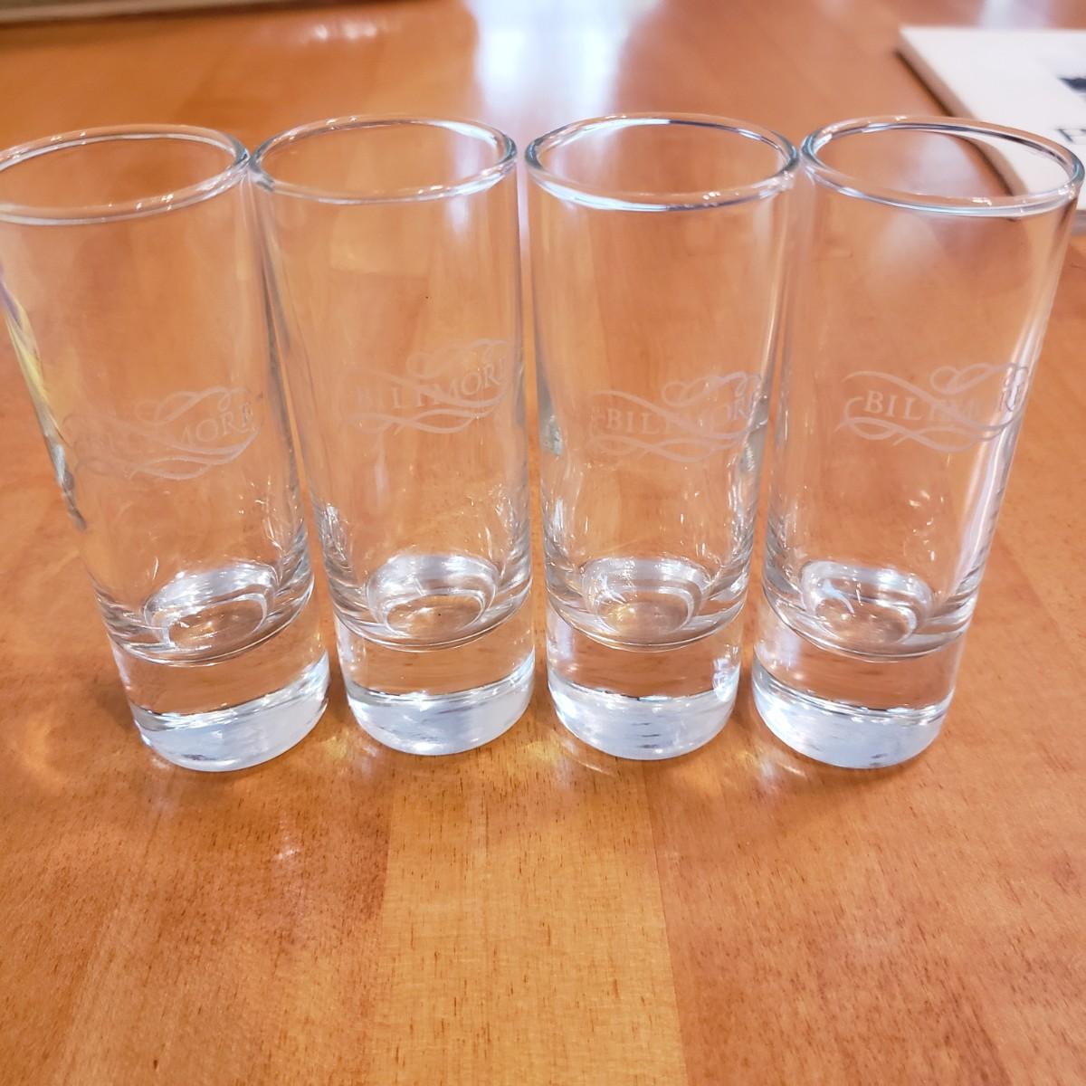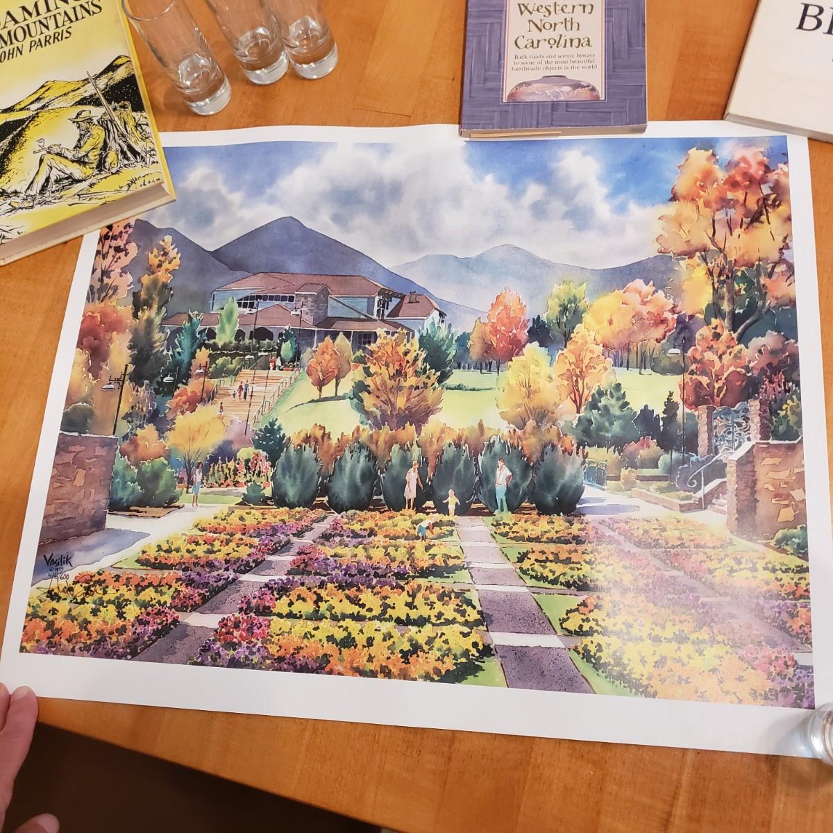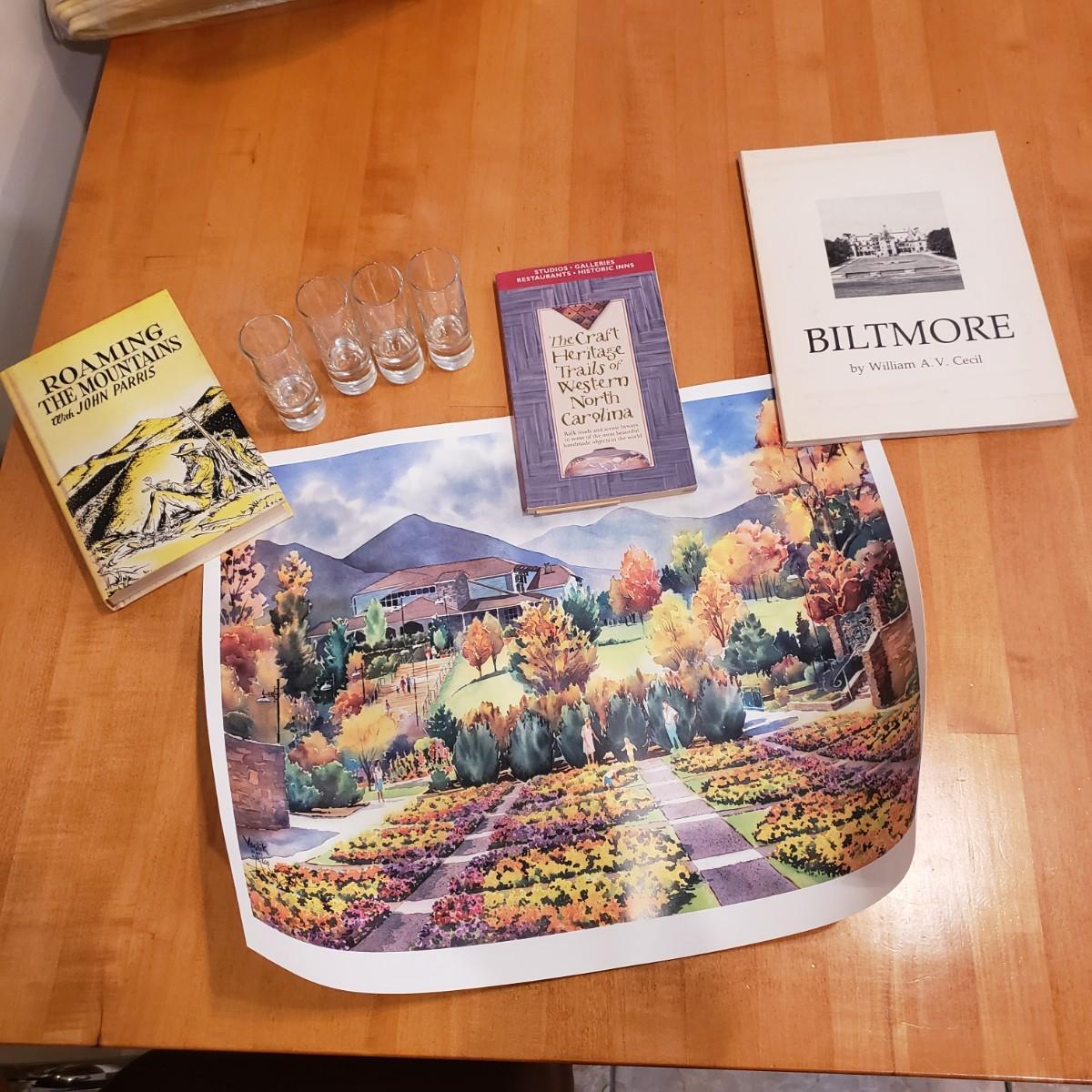 This local Asheville lot contains three books, four Biltmore shot glasses and a signed print from Vasilik 416/600. The print measures 16" x 20"H.