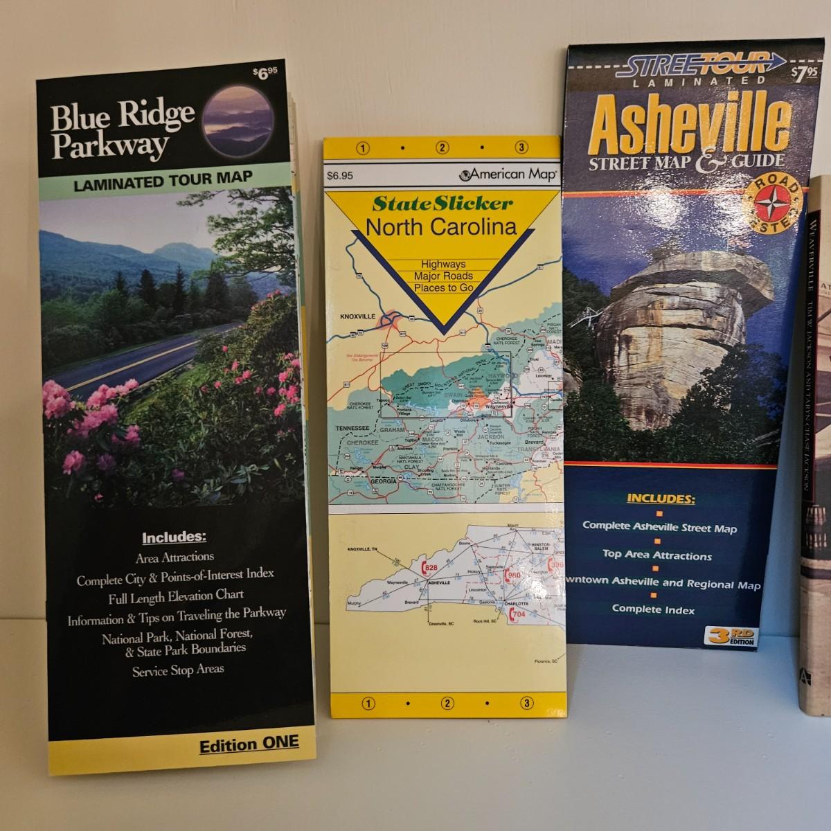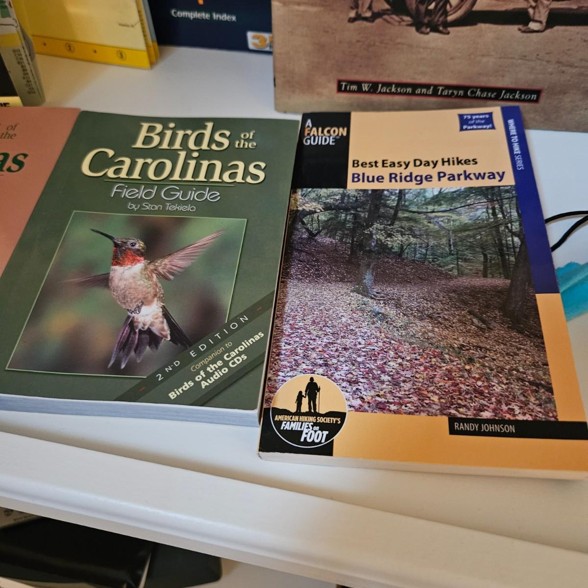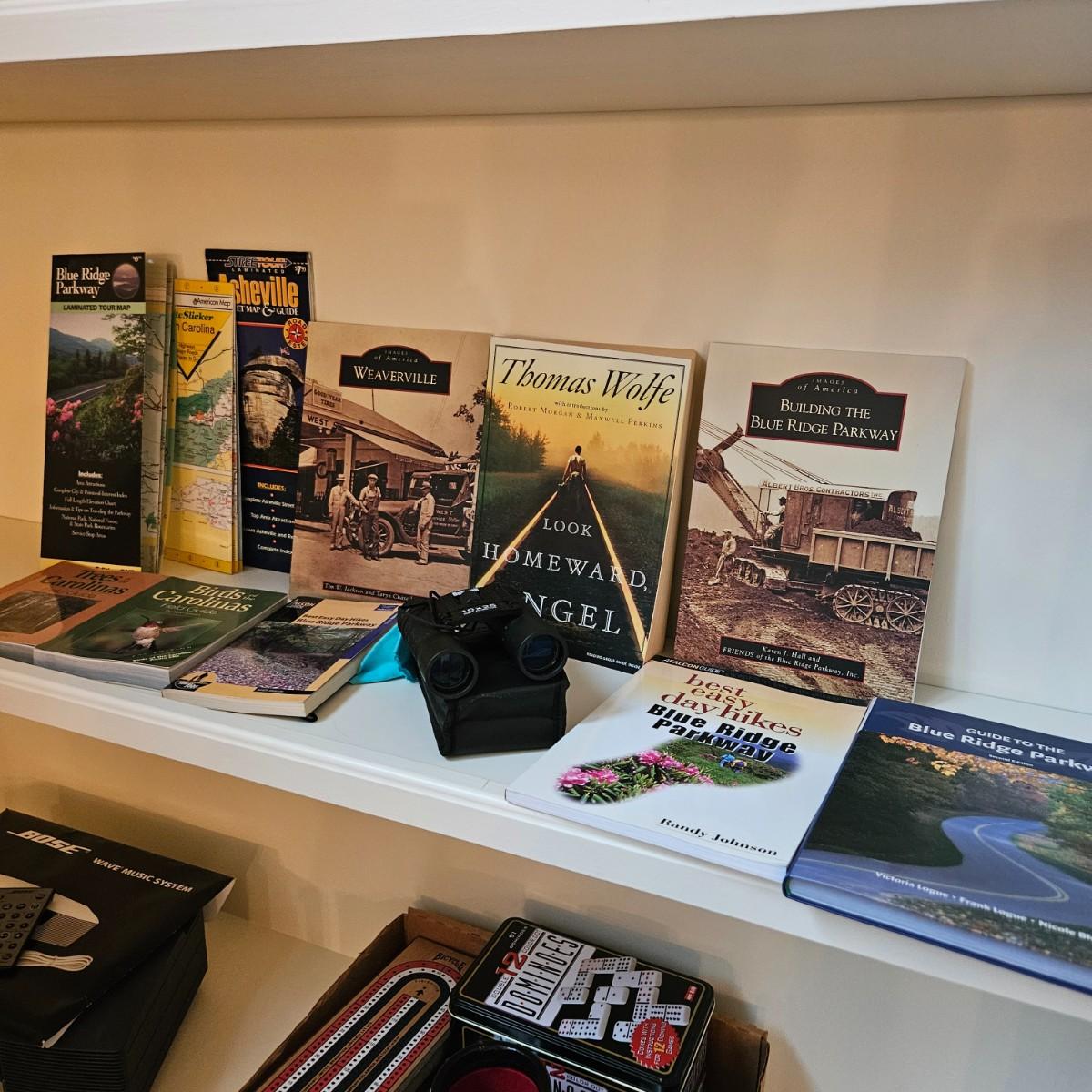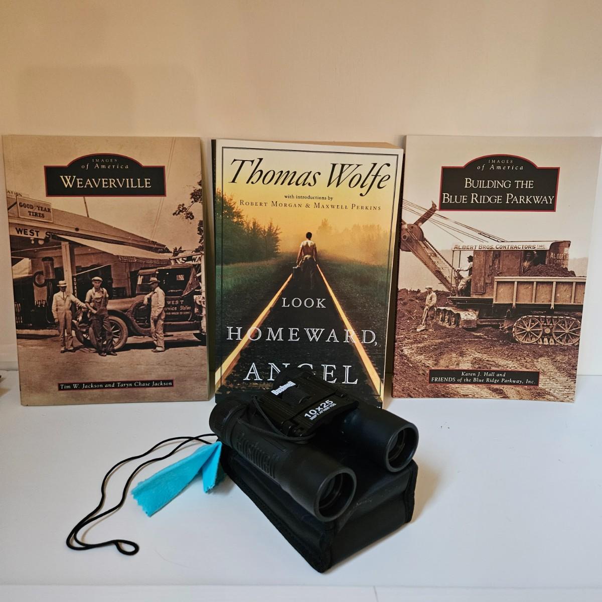 An assortment of local books, maps, field guides and a pair of binoculars. The Bushnell binoculars are 10 x 25 and includes a storage bag. The books are an assortment of local field guides and regional history that also includes a copy of Look Homeward, Angel by Thomas Wolfe. Shipping available