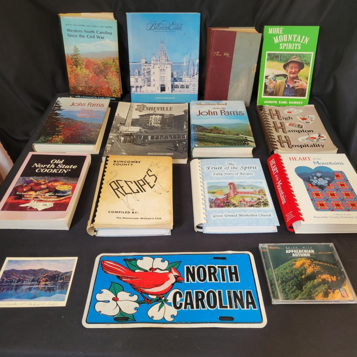 An assortment of Asheville cookbooks, books and more in good condition. Included is a collection of local cookbooks, multiple books by local authors including a signed copy of John Parris Mountain Bred. Coffee table books of Biltmore Estate and Asheville history, a NC license plate and post card of Lake Junaluska. Shipping available. Shipping can be costly. We suggest calling our local UPS with dimensions and getting an estimate 828-252-6930