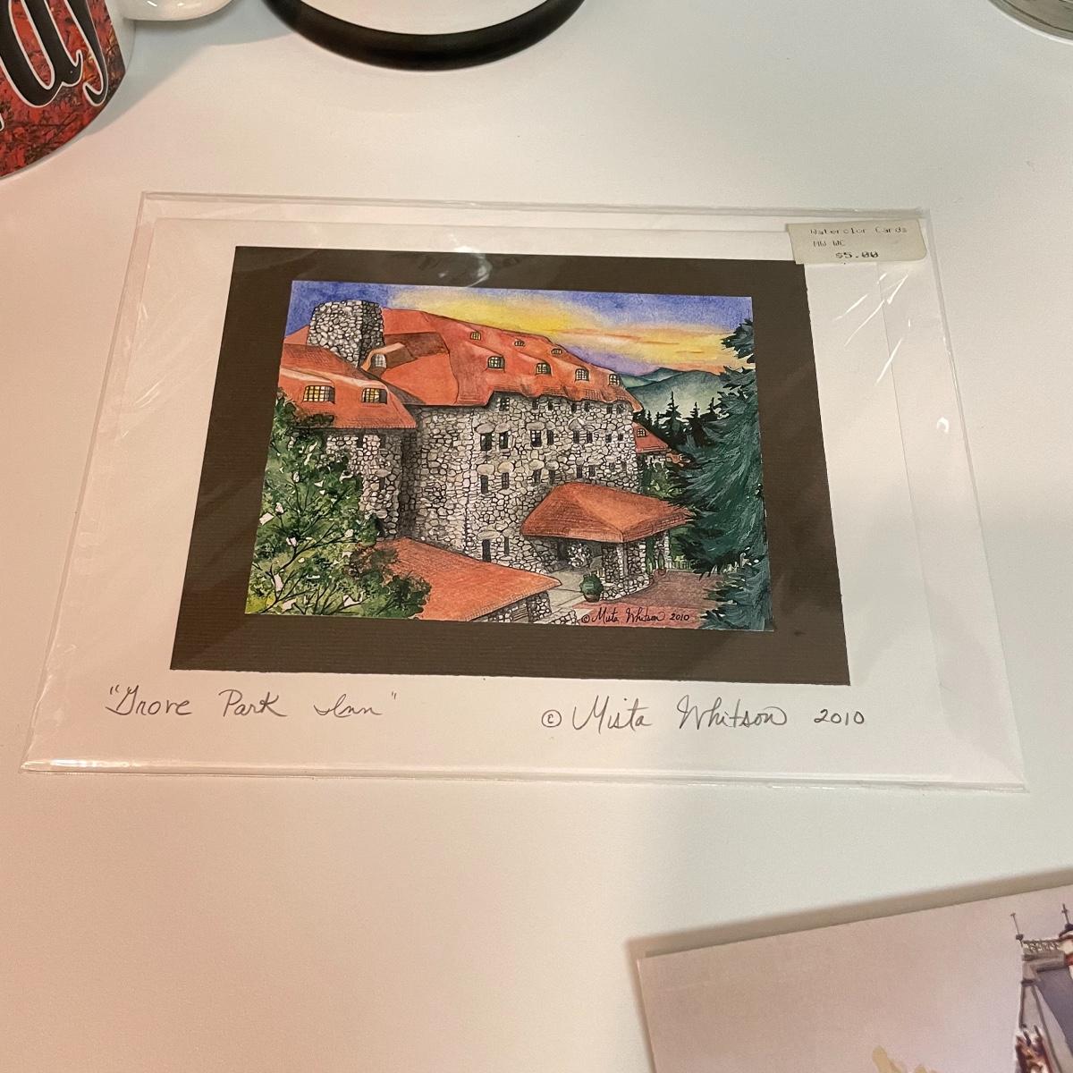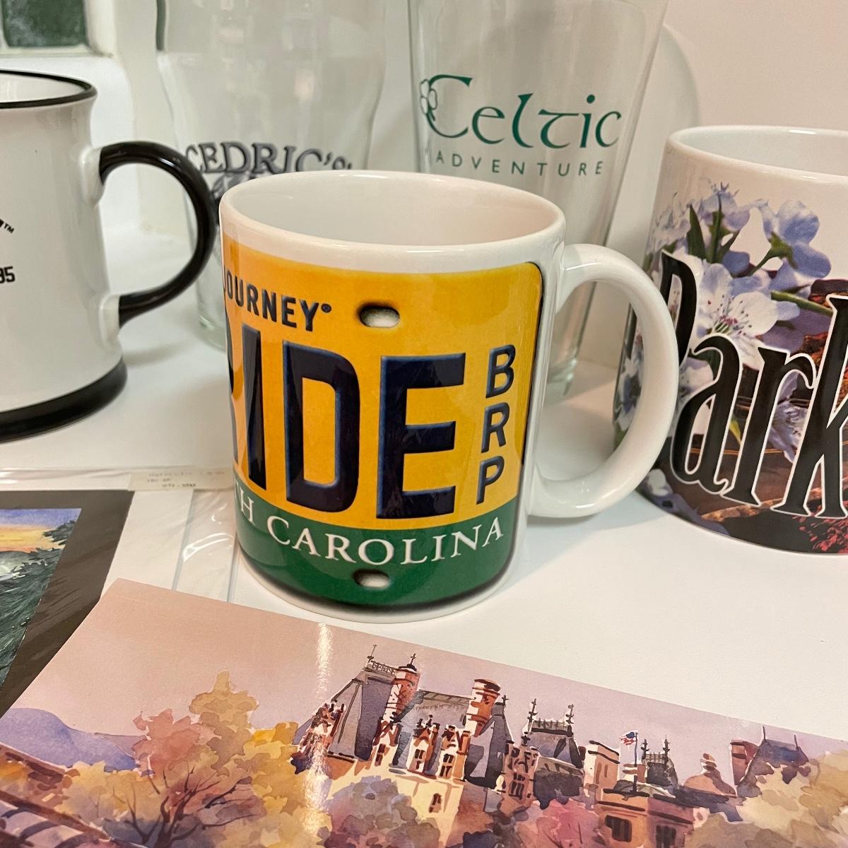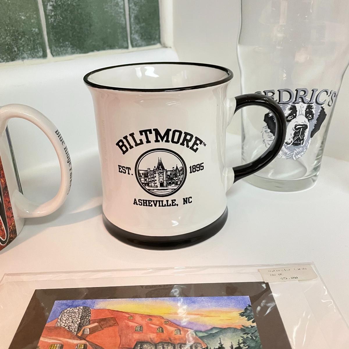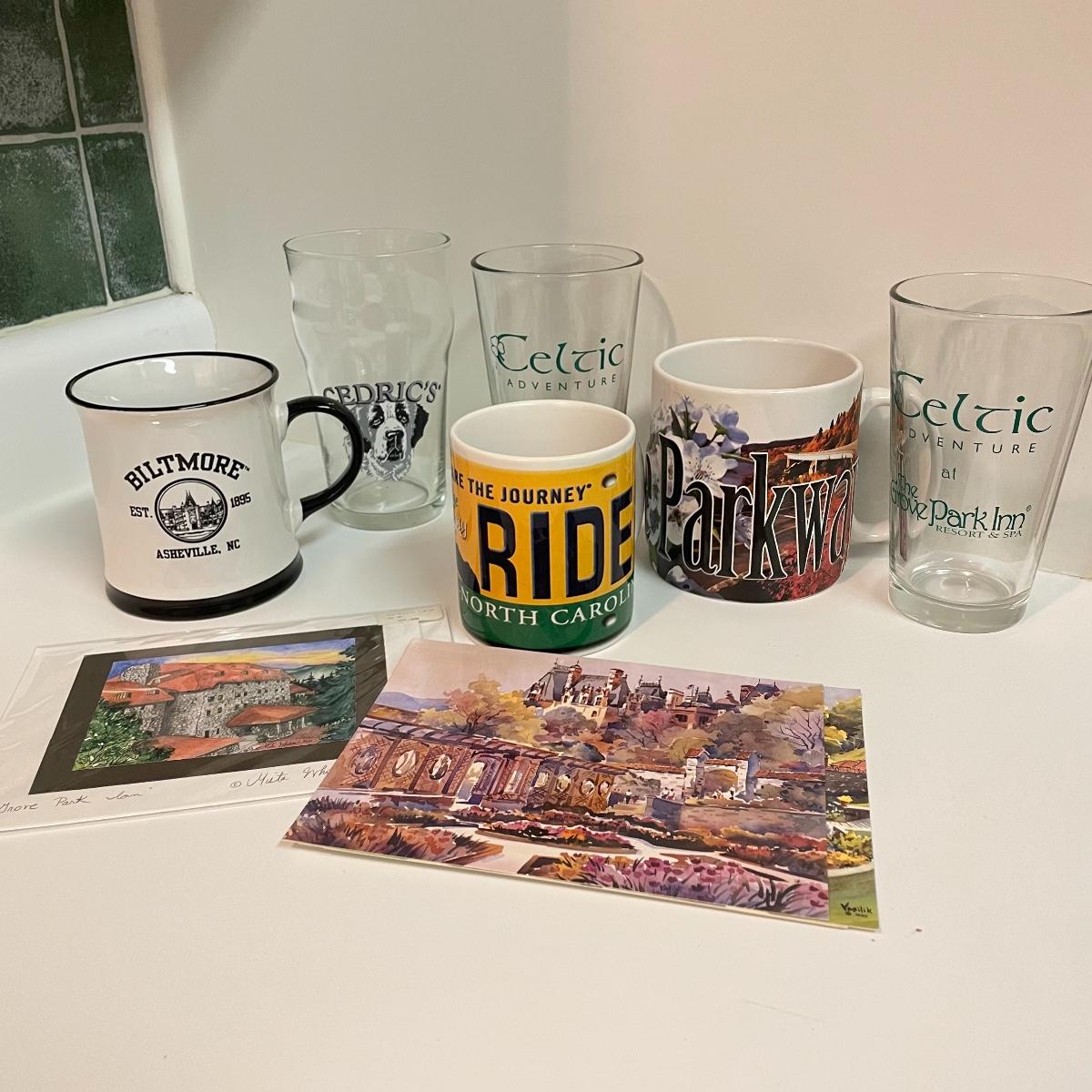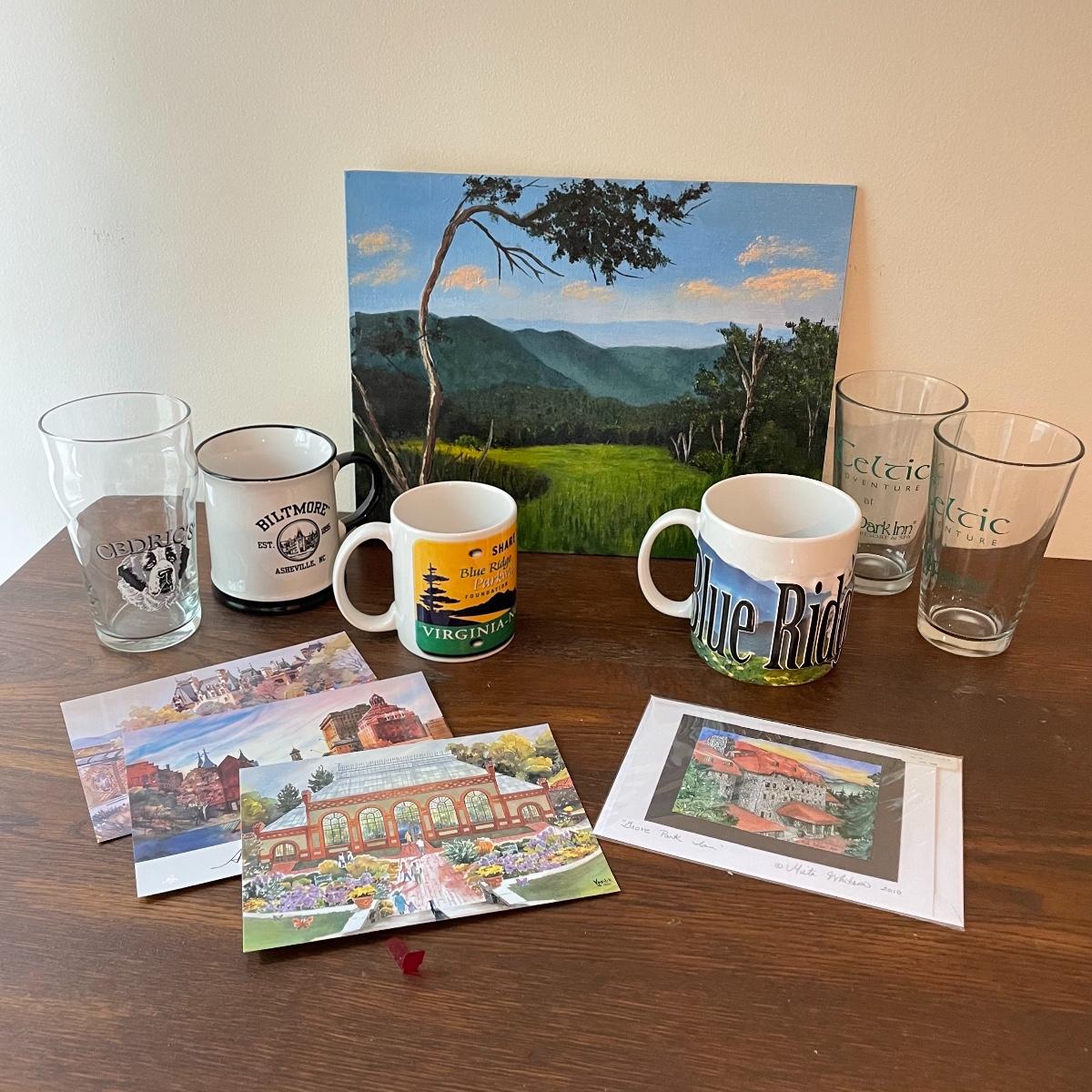 Lot features a signed 14” x 11” unframed oil painting. Two Blue Ridge Parkway Mugs plus one from Biltmore. The large mug is 4”d x 4.25”. Three pint glasses, one from Biltmore and the other from the Grove Park Inn. Lastly, three postcards with art by local artist Ann Vasilik and a card featuring the Grove Park Inn by Mista Whitson. Local pick up only.