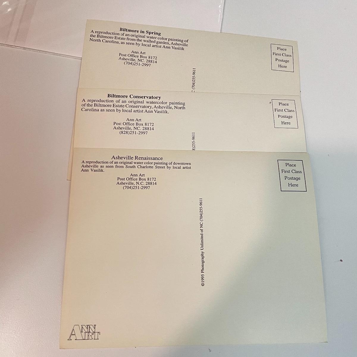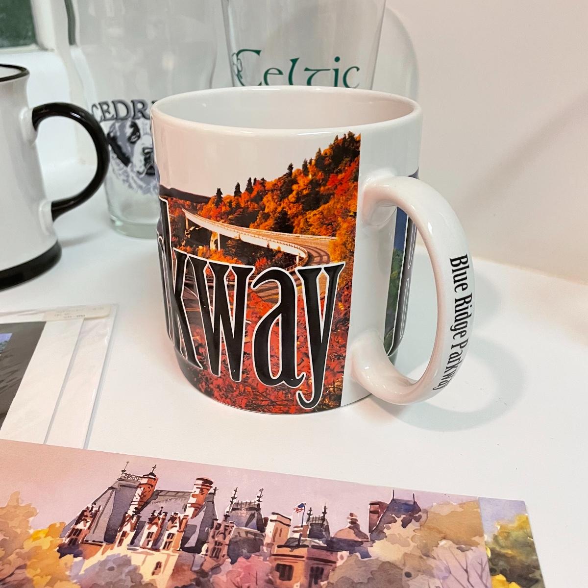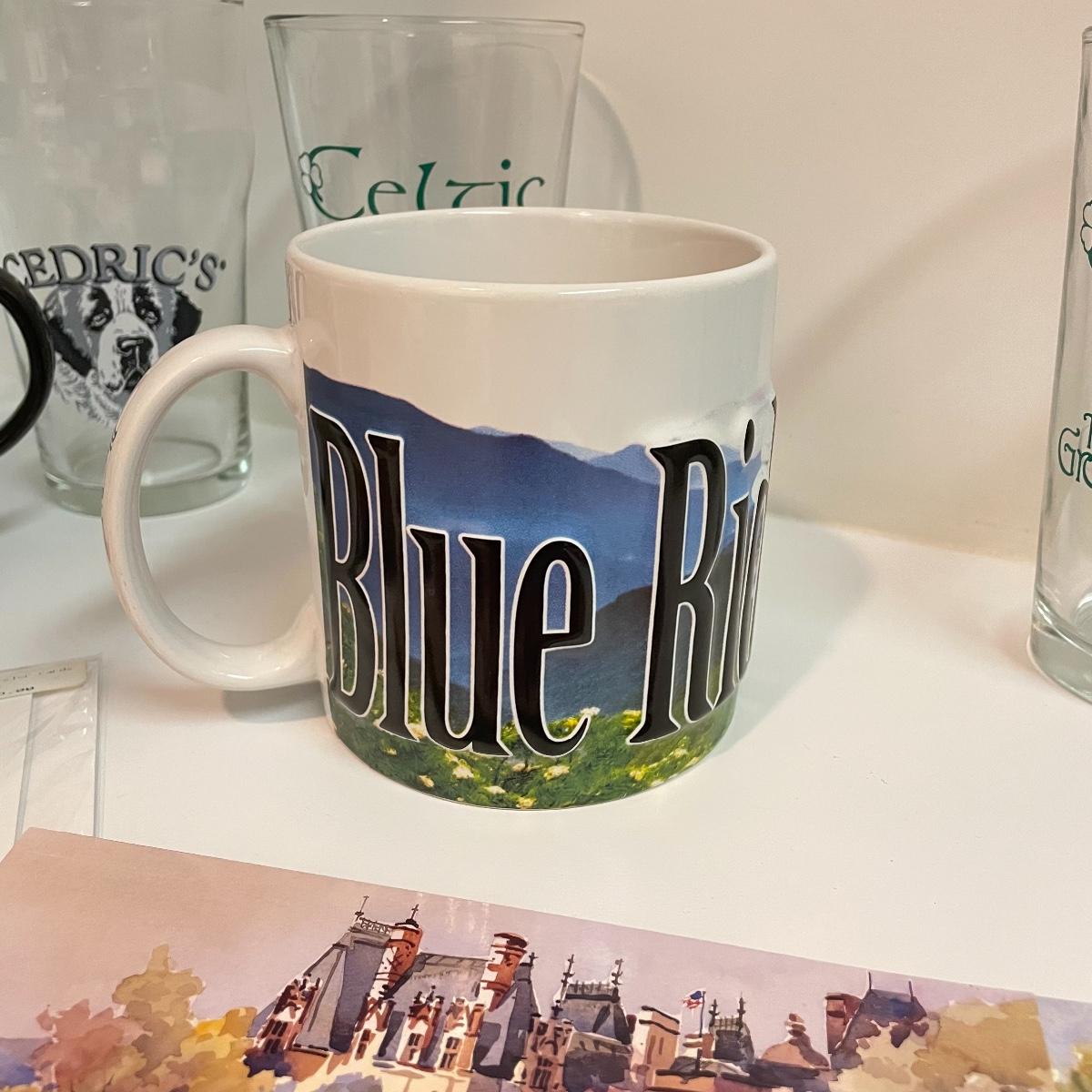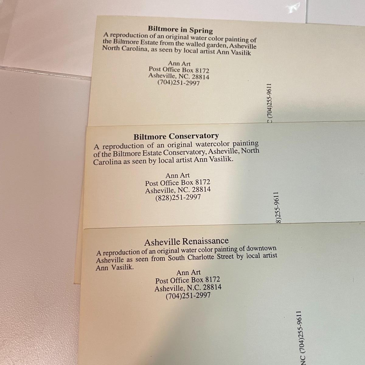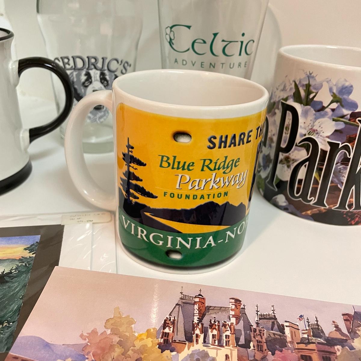 Lot features a signed 14” x 11” unframed oil painting. Two Blue Ridge Parkway Mugs plus one from Biltmore. The large mug is 4”d x 4.25”. Three pint glasses, one from Biltmore and the other from the Grove Park Inn. Lastly, three postcards with art by local artist Ann Vasilik and a card featuring the Grove Park Inn by Mista Whitson. Local pick up only.