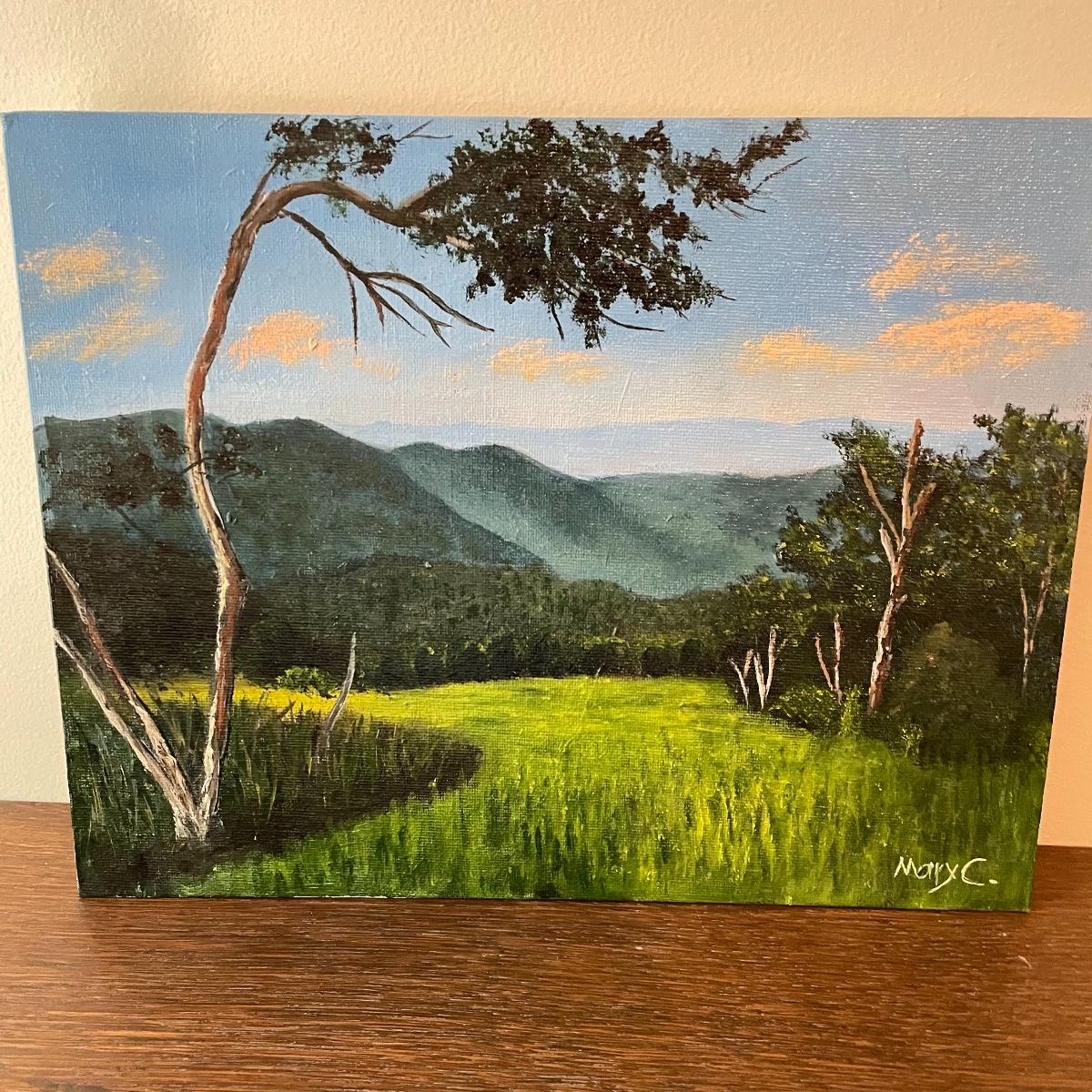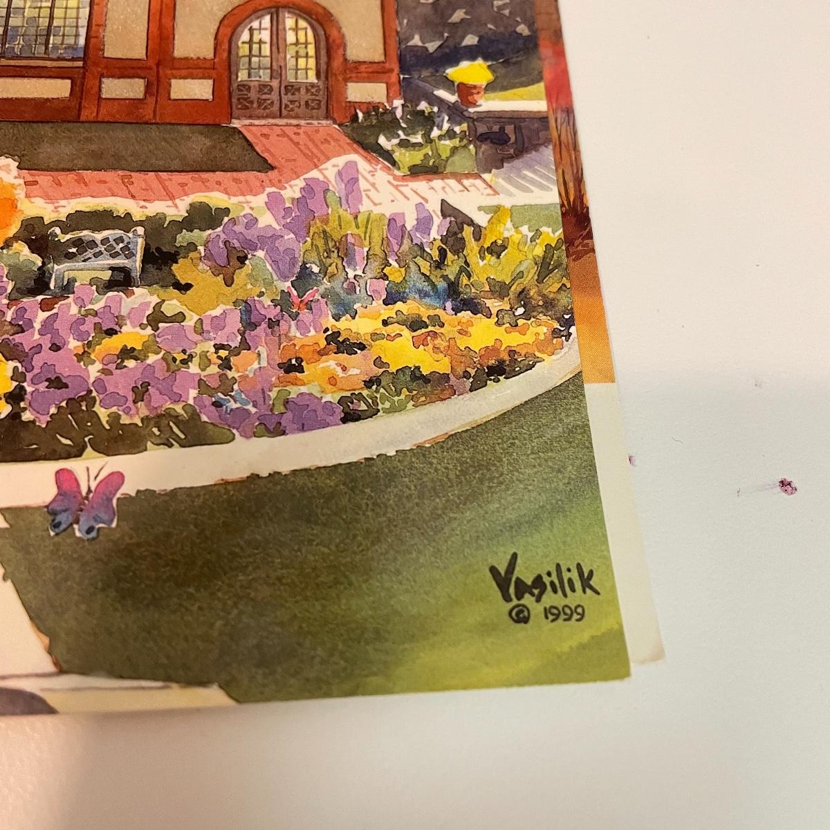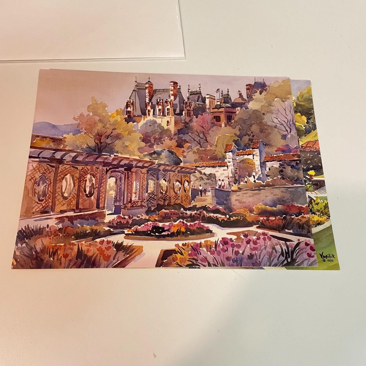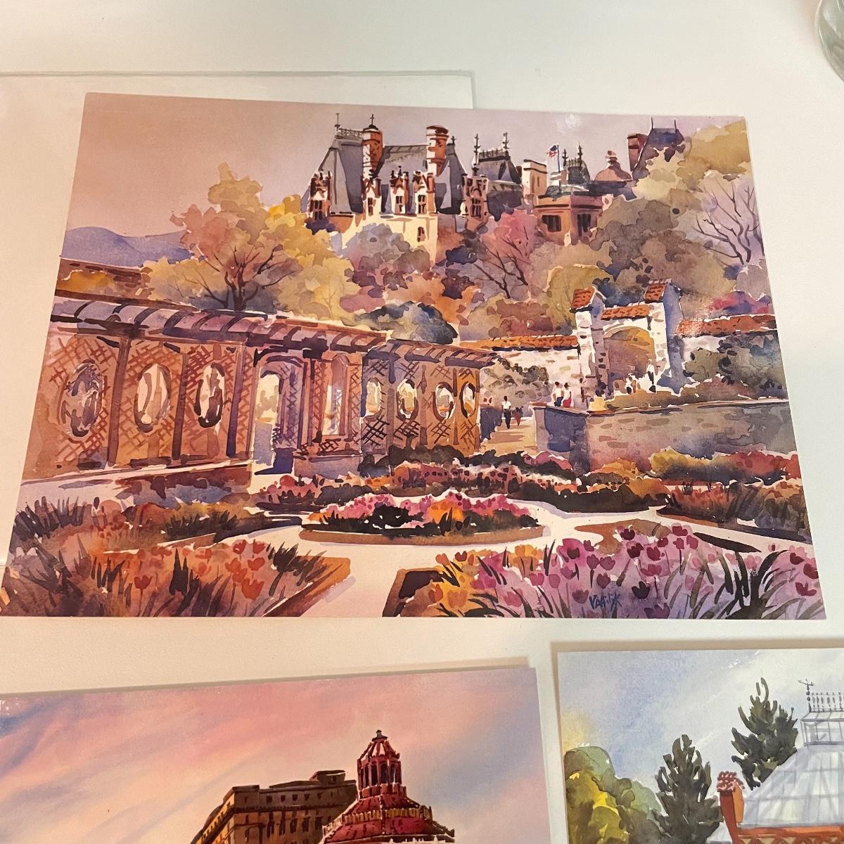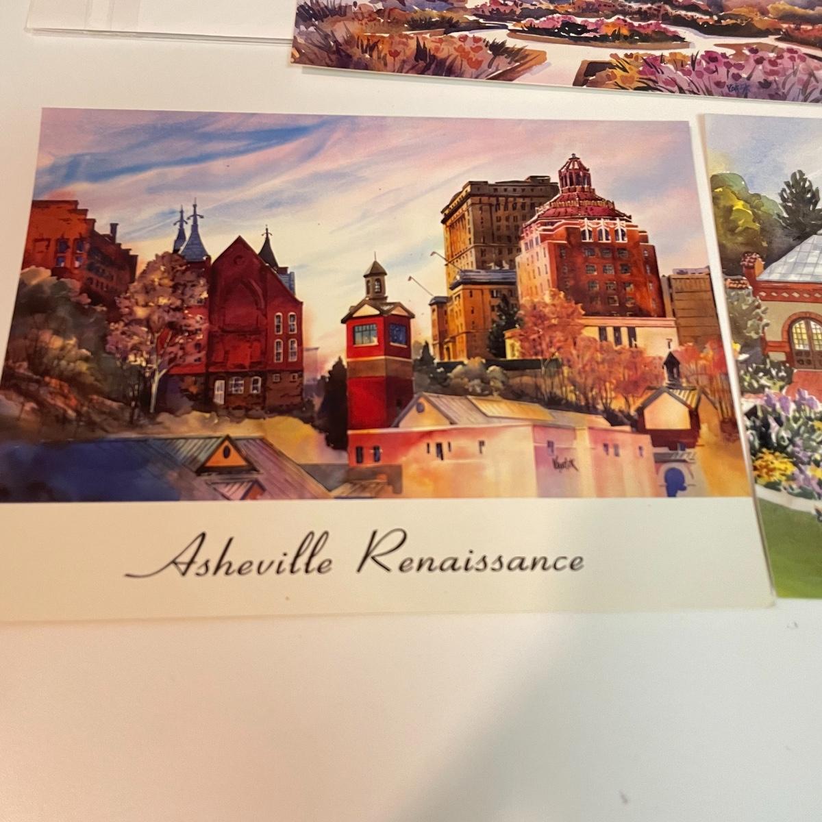 Lot features a signed 14” x 11” unframed oil painting. Two Blue Ridge Parkway Mugs plus one from Biltmore. The large mug is 4”d x 4.25”. Three pint glasses, one from Biltmore and the other from the Grove Park Inn. Lastly, three postcards with art by local artist Ann Vasilik and a card featuring the Grove Park Inn by Mista Whitson. Local pick up only.