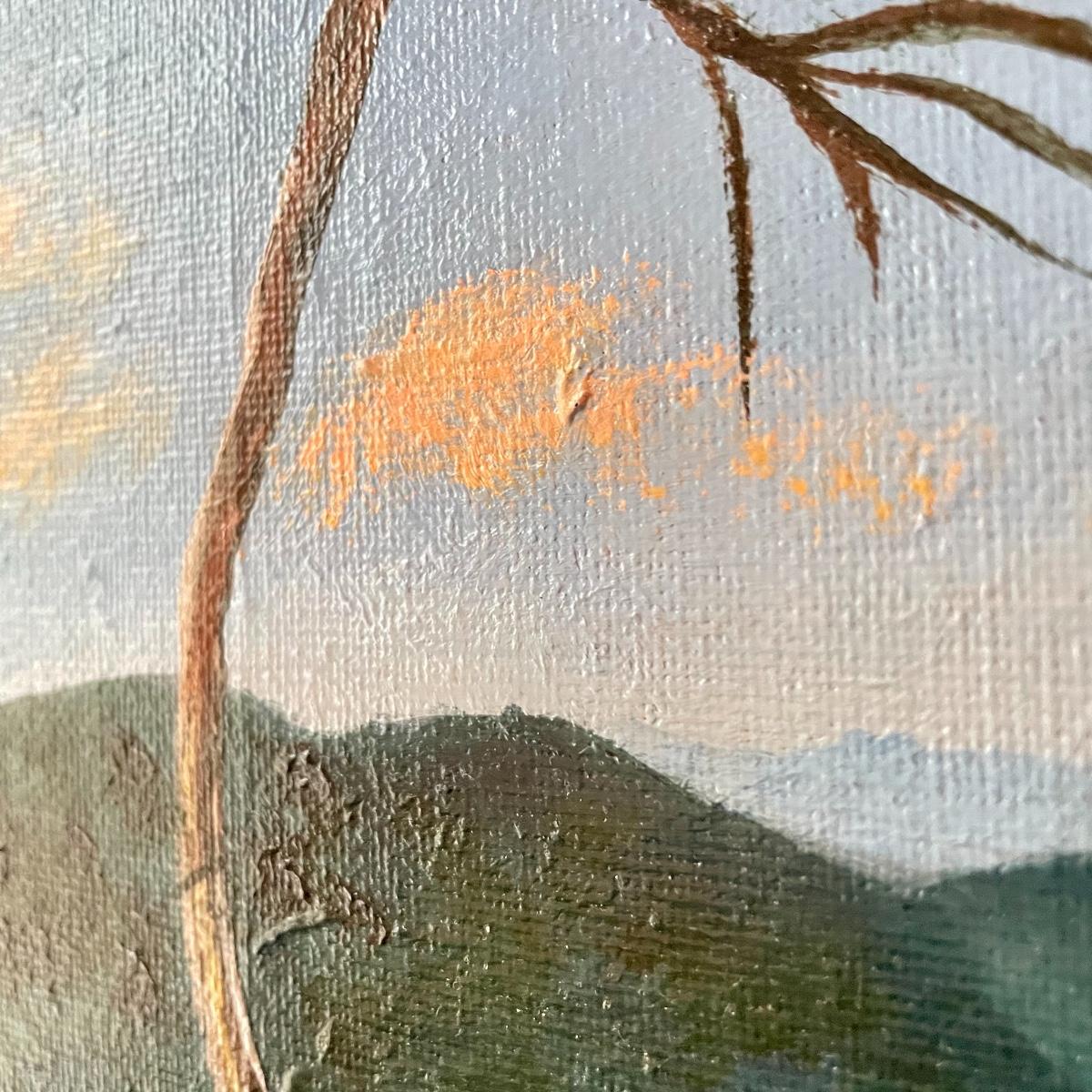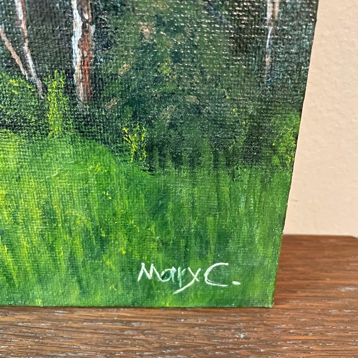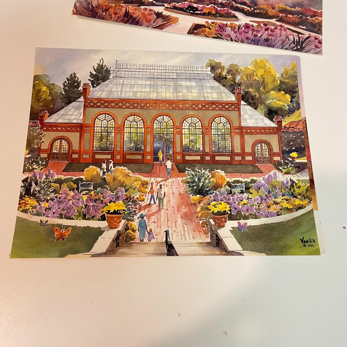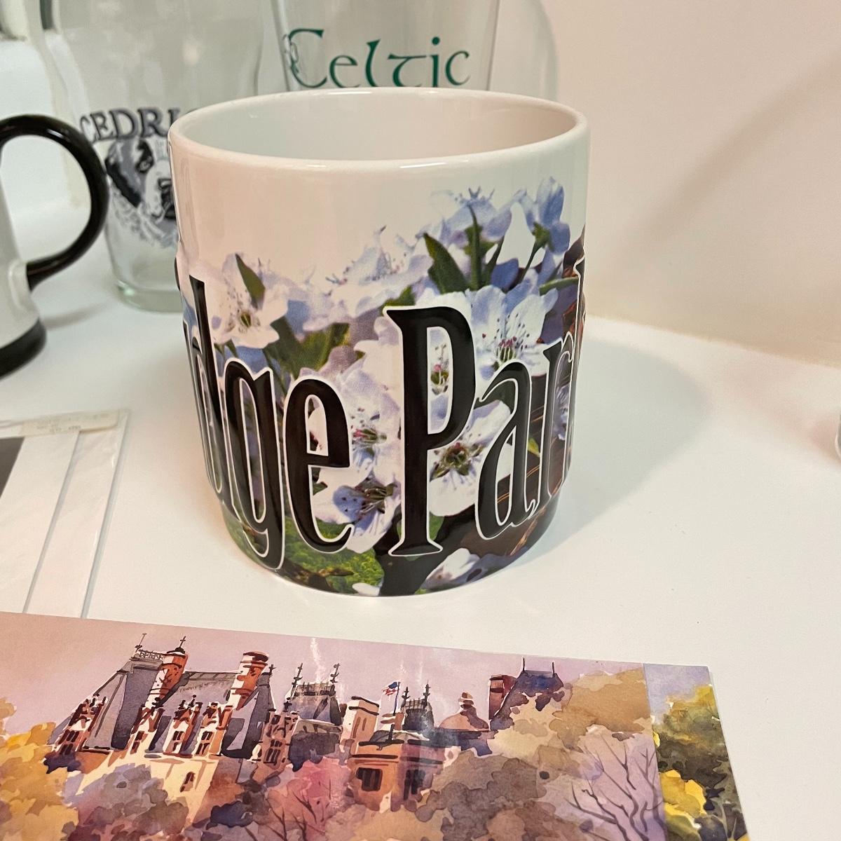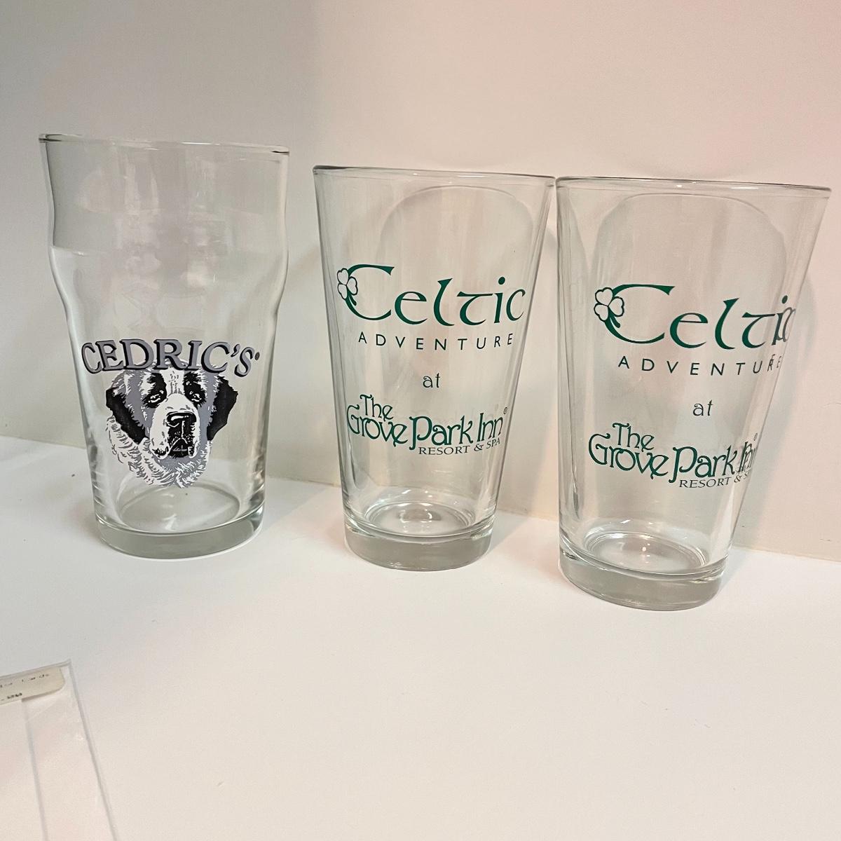 Lot features a signed 14” x 11” unframed oil painting. Two Blue Ridge Parkway Mugs plus one from Biltmore. The large mug is 4”d x 4.25”. Three pint glasses, one from Biltmore and the other from the Grove Park Inn. Lastly, three postcards with art by local artist Ann Vasilik and a card featuring the Grove Park Inn by Mista Whitson. Local pick up only.