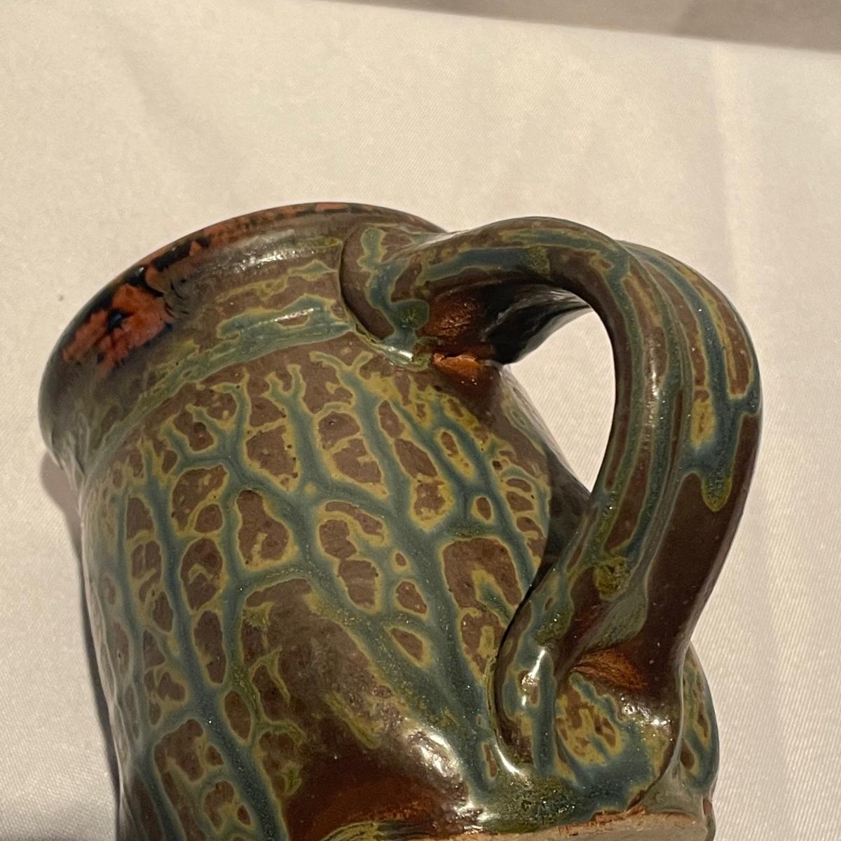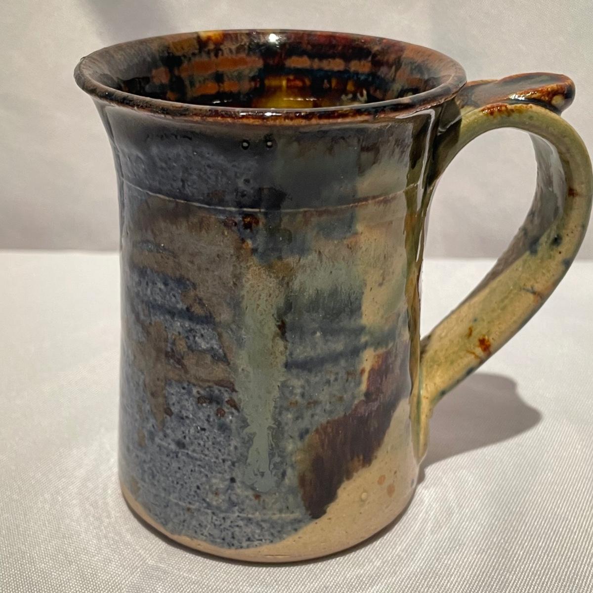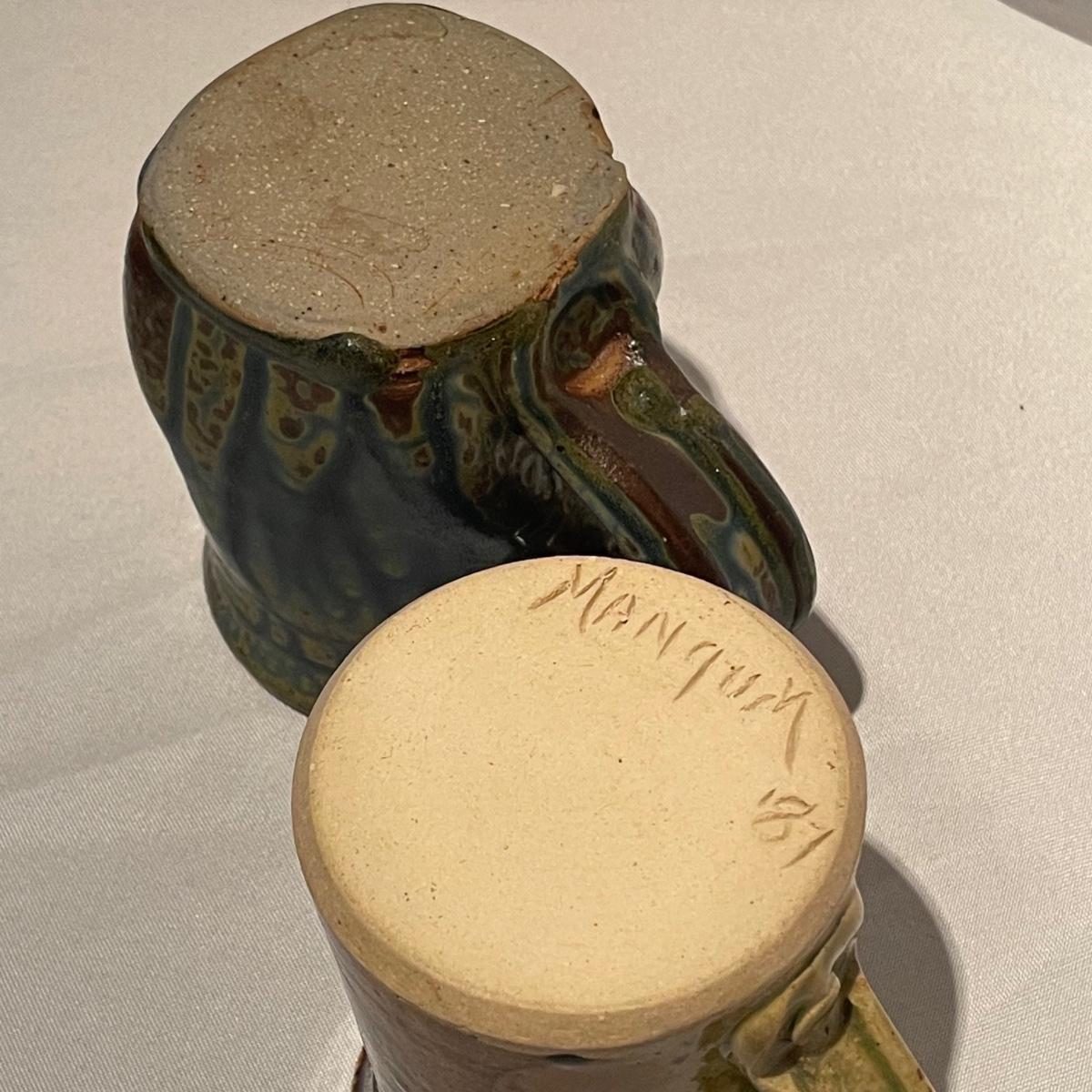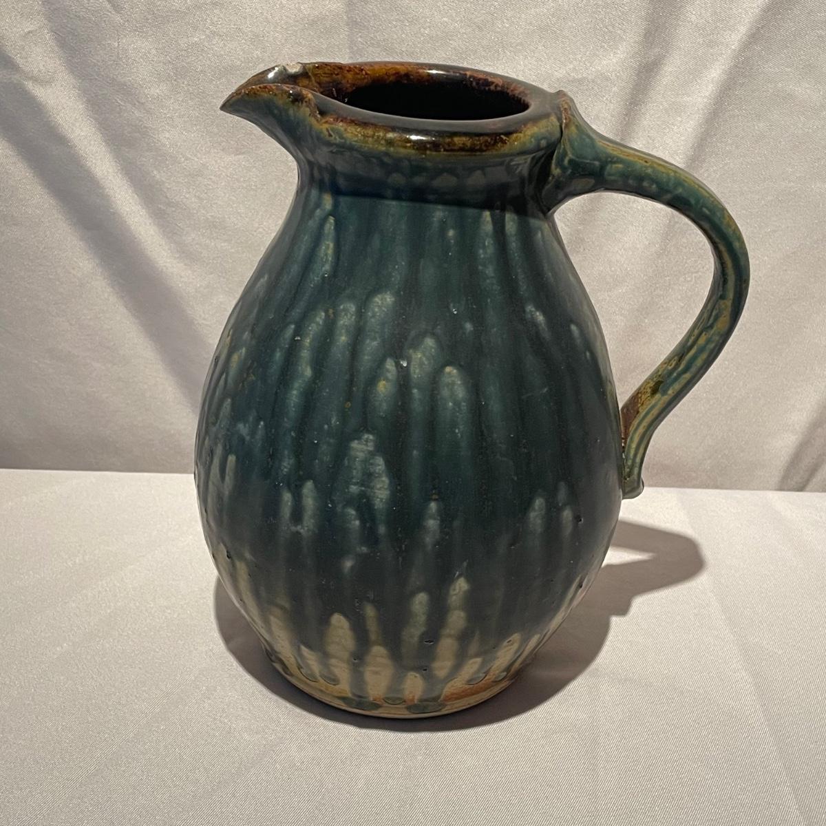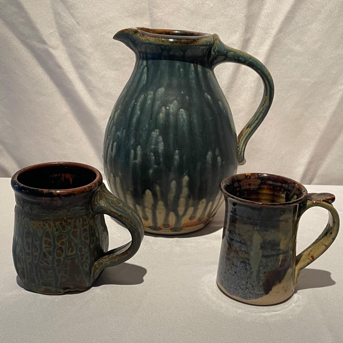 Three hand built pieces of pottery in this lot; a coffee cup from Mangum Pottery out of Weaverville plus another mug and an attractive pitcher that measures 4” diameter x 10” tall (note the small chip in the rim).