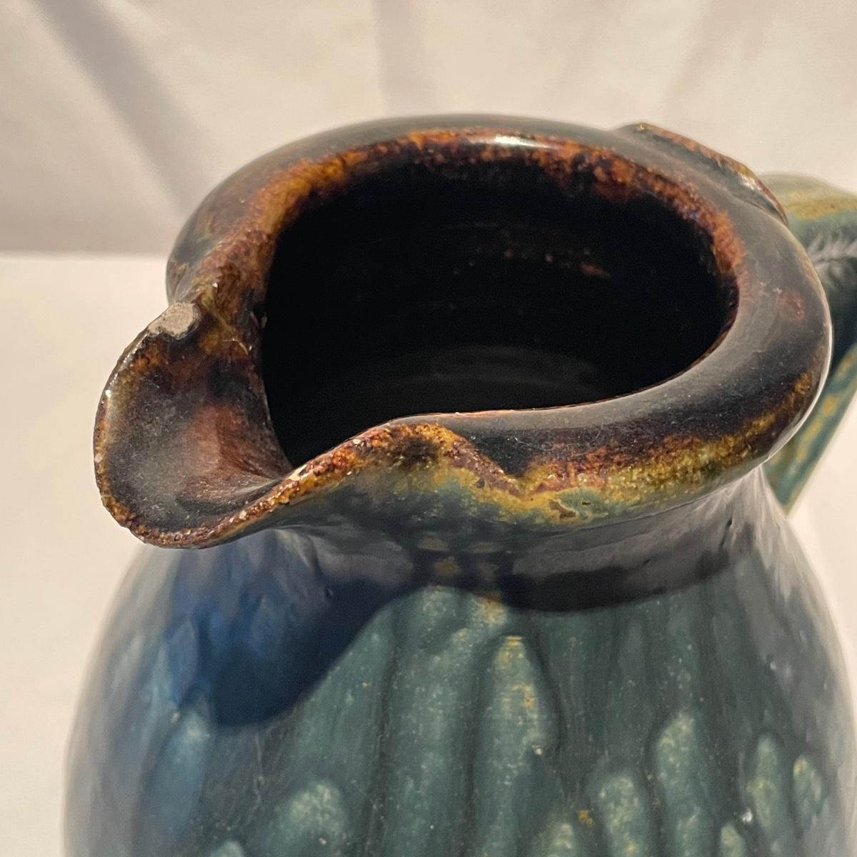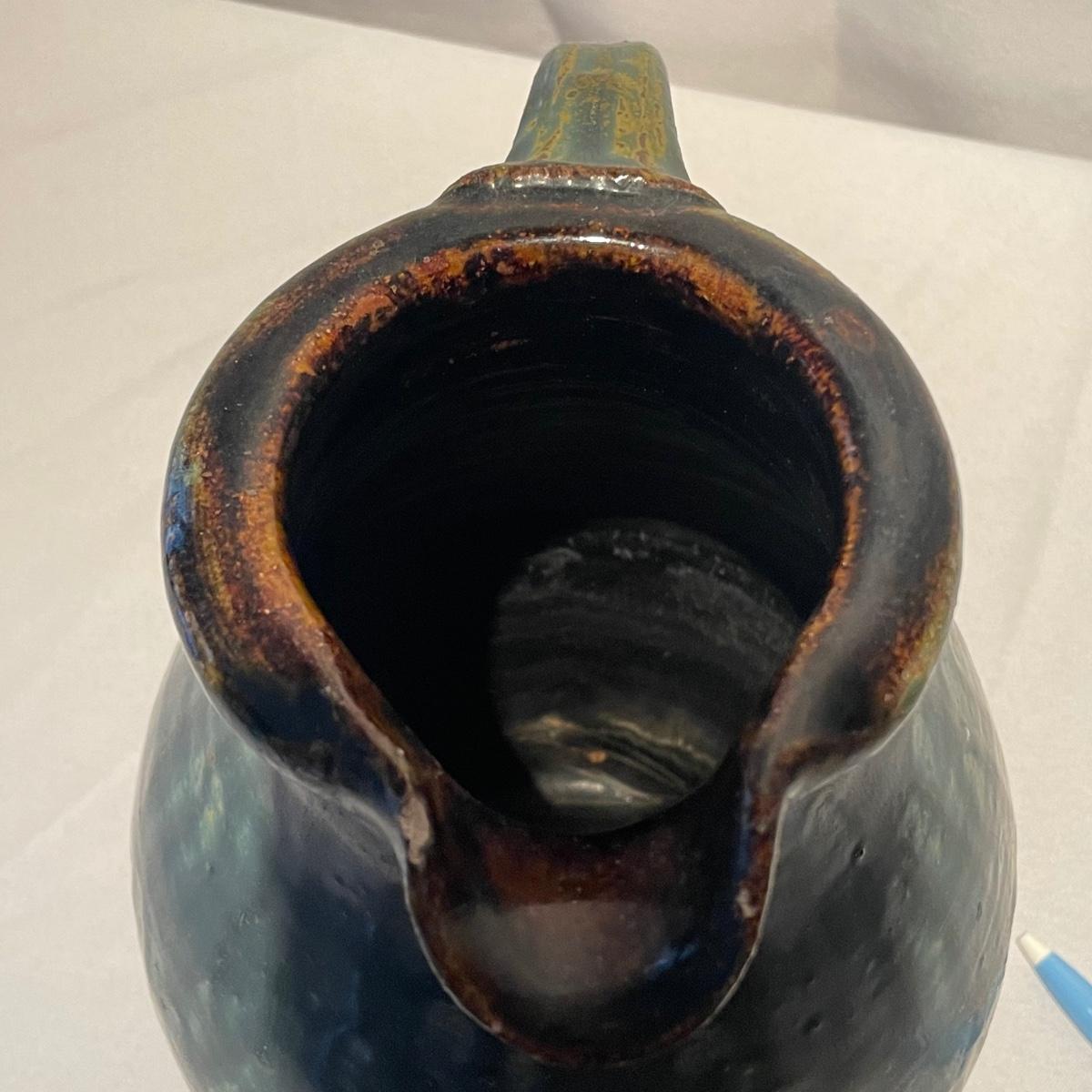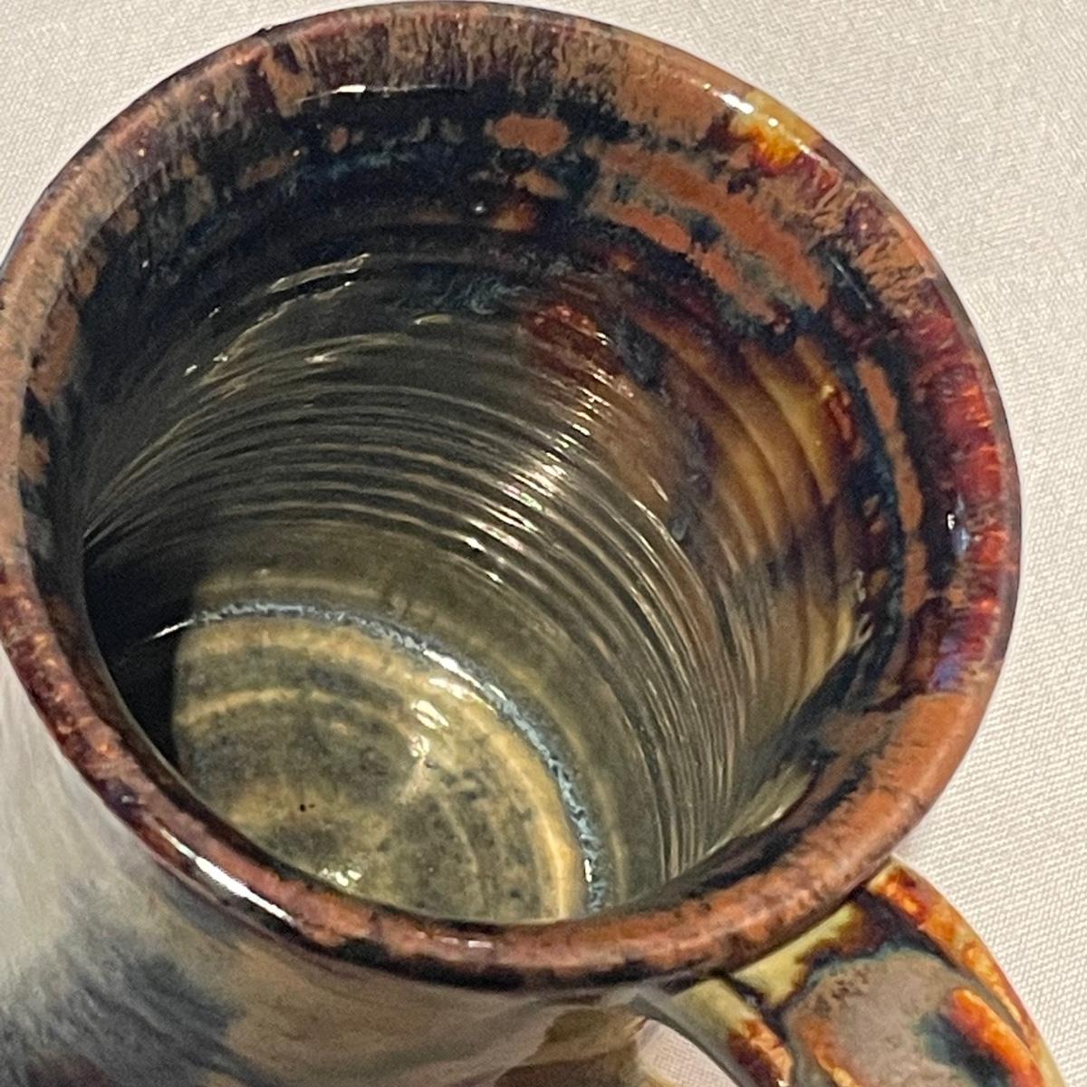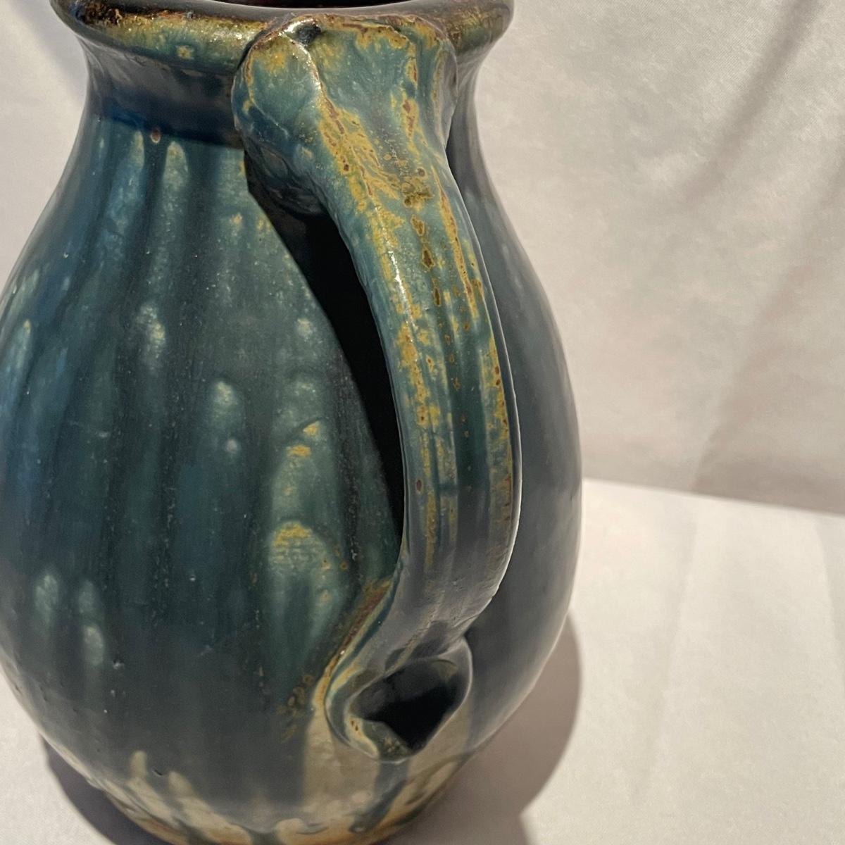 Three hand built pieces of pottery in this lot; a coffee cup from Mangum Pottery out of Weaverville plus another mug and an attractive pitcher that measures 4” diameter x 10” tall (note the small chip in the rim).
