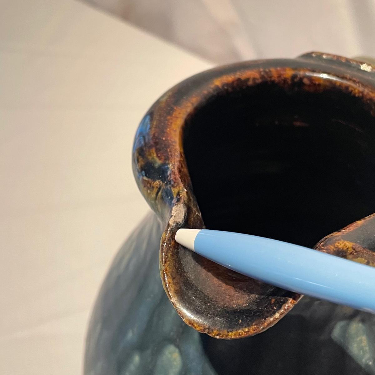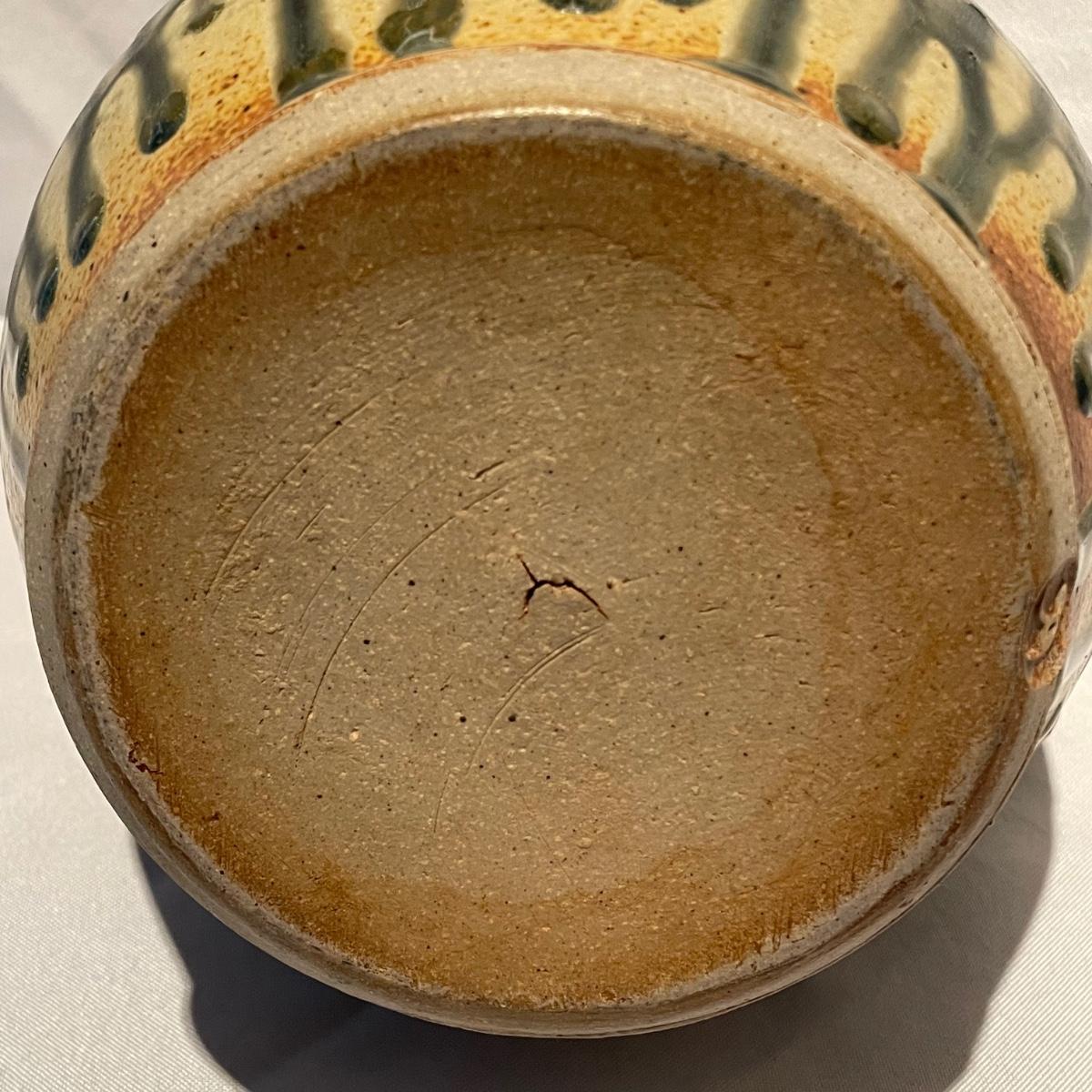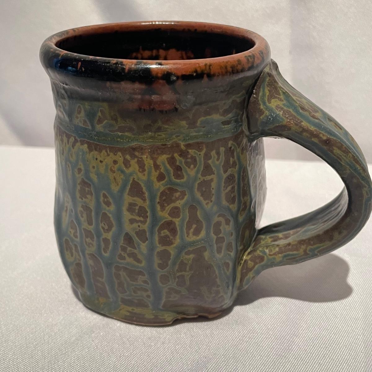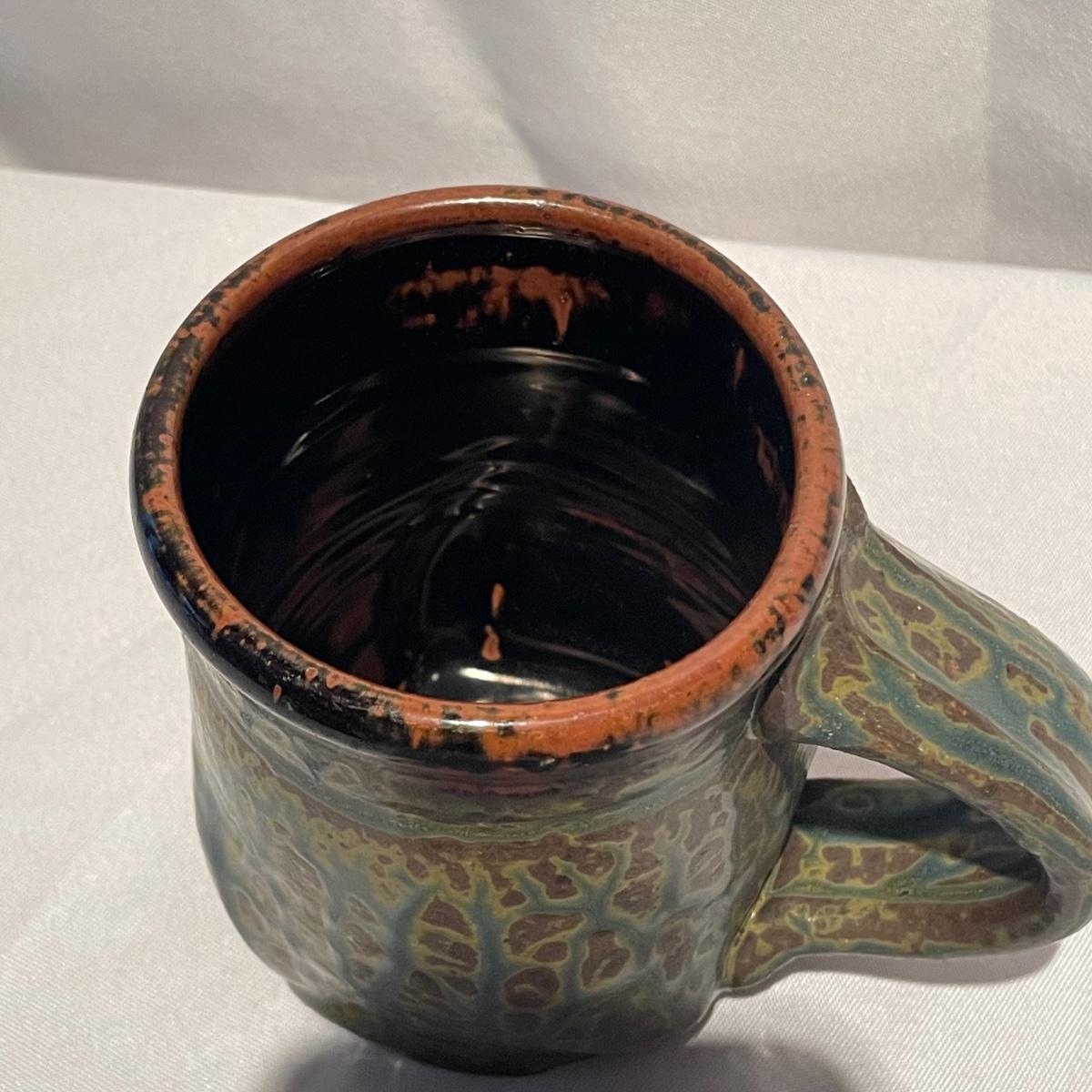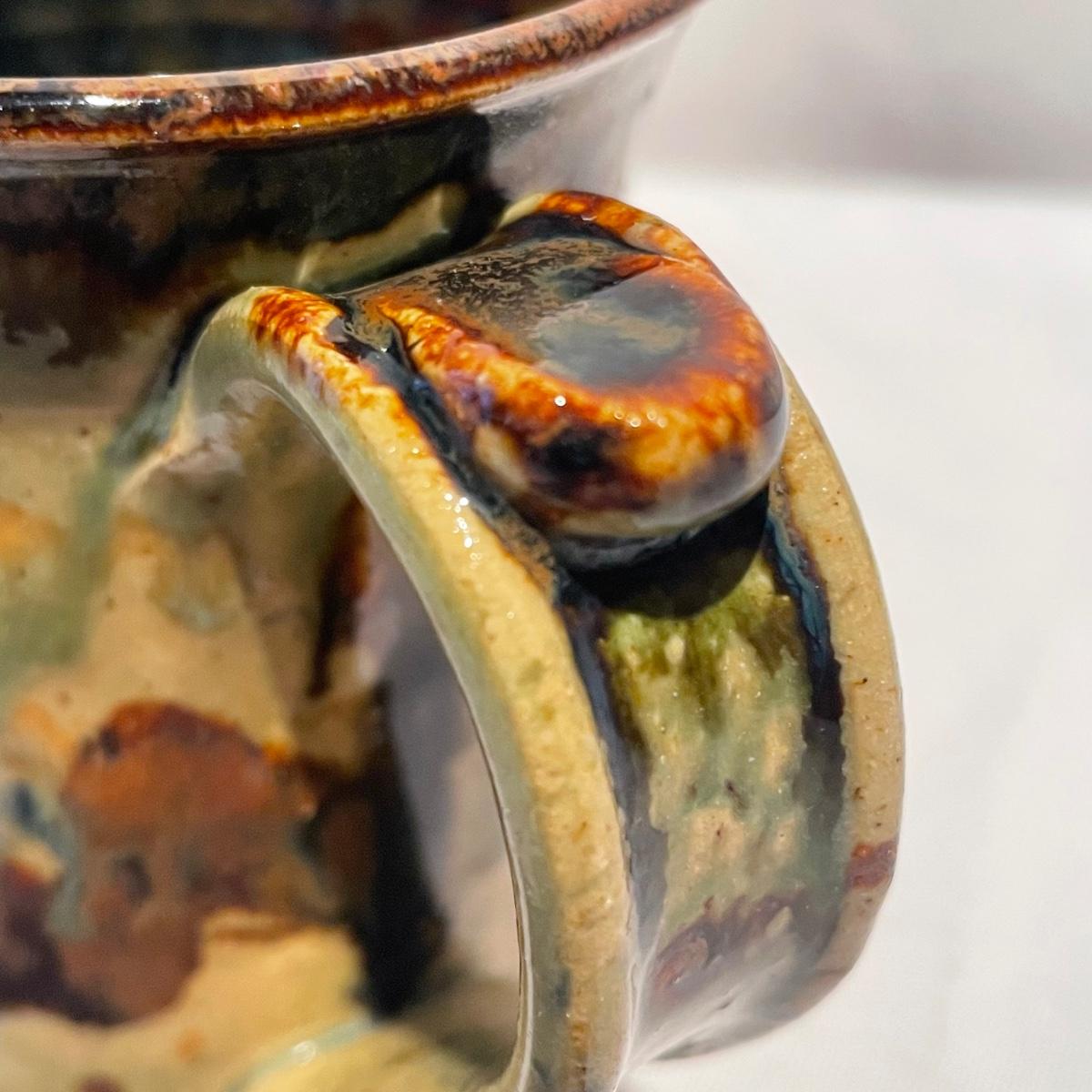Three hand built pieces of pottery in this lot; a coffee cup from Mangum Pottery out of Weaverville plus another mug and an attractive pitcher that measures 4” diameter x 10” tall (note the small chip in the rim).