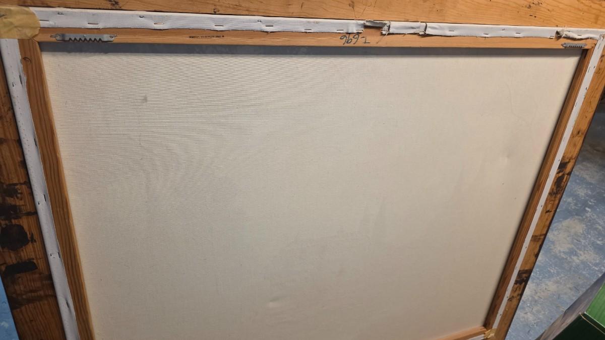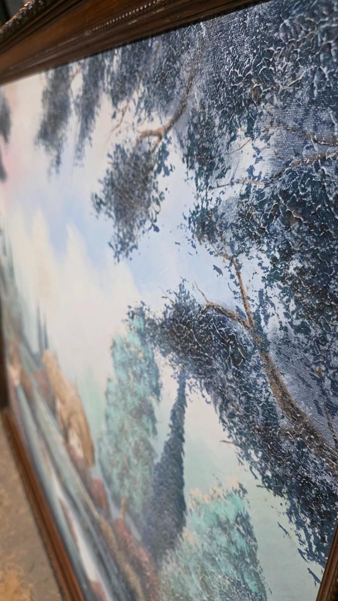 Presented in an ornate dark wood-tone frame with carved detailing, the painting measures approximately 51 inches wide by 42 inches tall including the frame and is ready to hang. It remains in good vintage condition overall, with minor signs of age and handling consistent with a previously owned decorative artwork. This is a substantial, visually calming piece well-suited for a living room, entryway, or office where size, tone, and atmosphere matter more than formality.