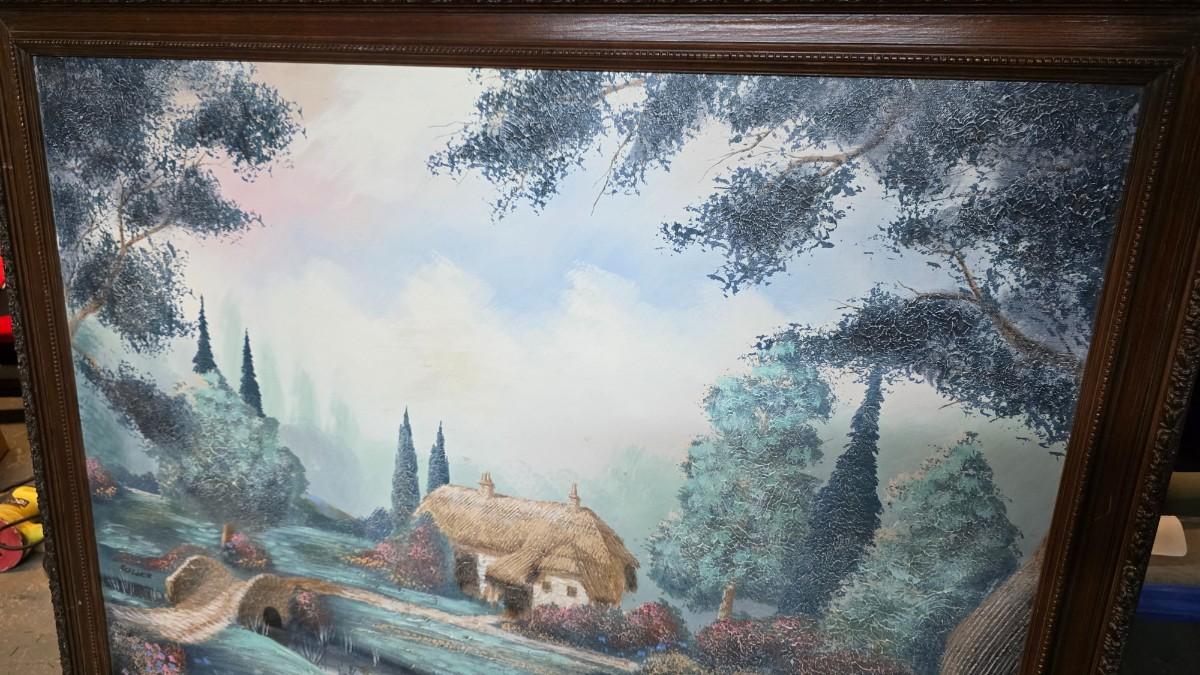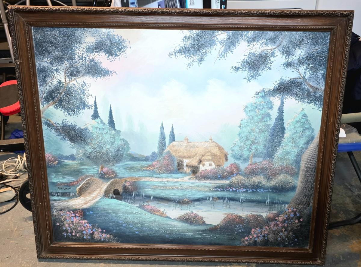 *LOCAL ONLY* - Vintage Ferrante Landscape Painting Framed Cottage Bridge 51x42 Wall Art