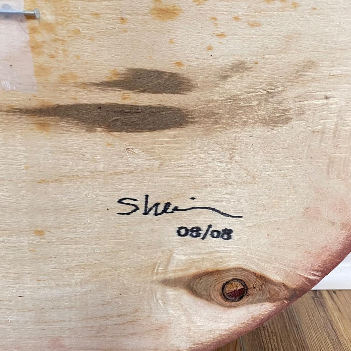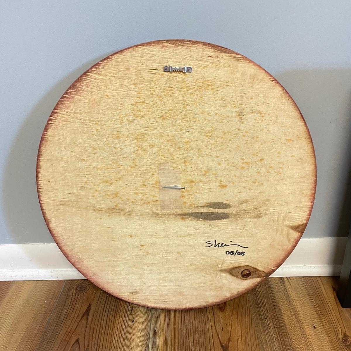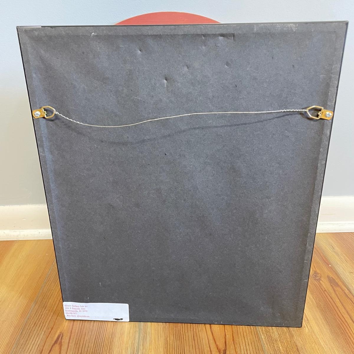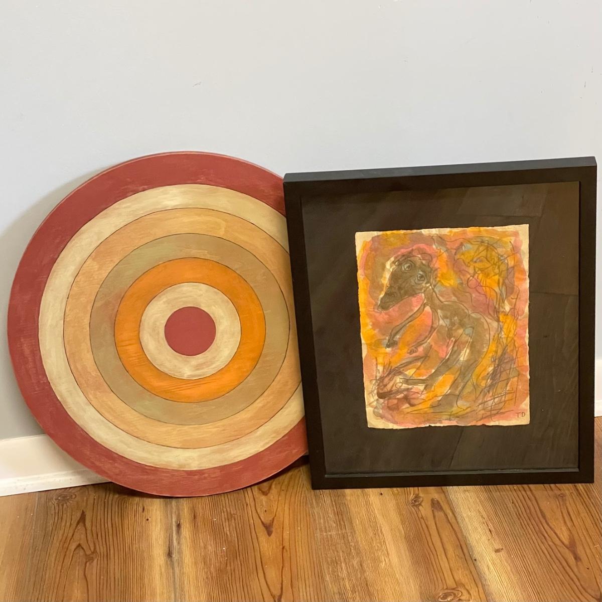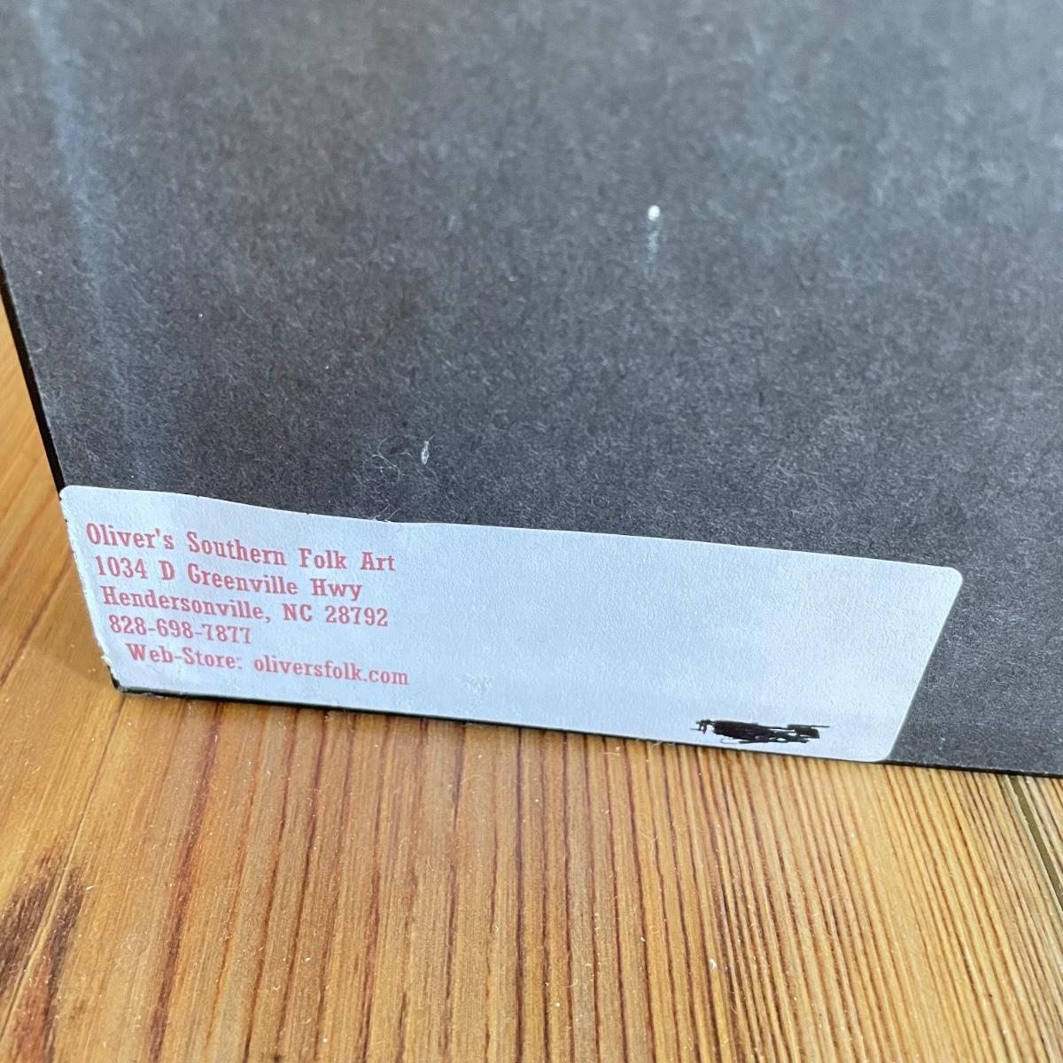 Framed art labeled Oliver"™s Southern Folk Art in Hendersonville. Art sits behind glass in a black shadow box wood frame. It appears to be watercolor on hand-made paper. Frame measures 14.5" x 17"H. Lot also features a round painted wood art, signed and numbered 08/08. This piece measures 18"D and includes wall mount hardware. See images. Shipping available. Shipping can be costly. We suggest contacting our preferred local shipping provider, Postage Express, with dimensions and getting an estimate before bidding: 828-255-9250 or shipping@postageexpressnc.com
