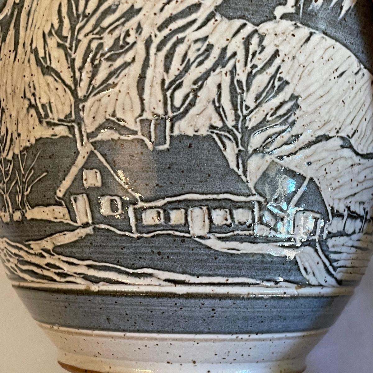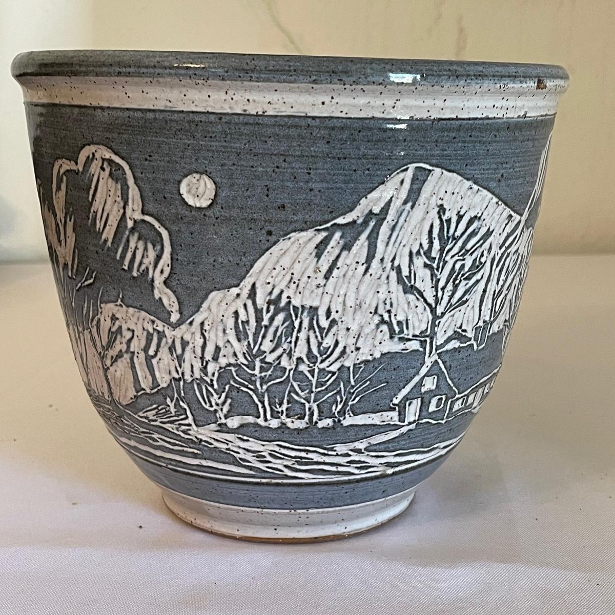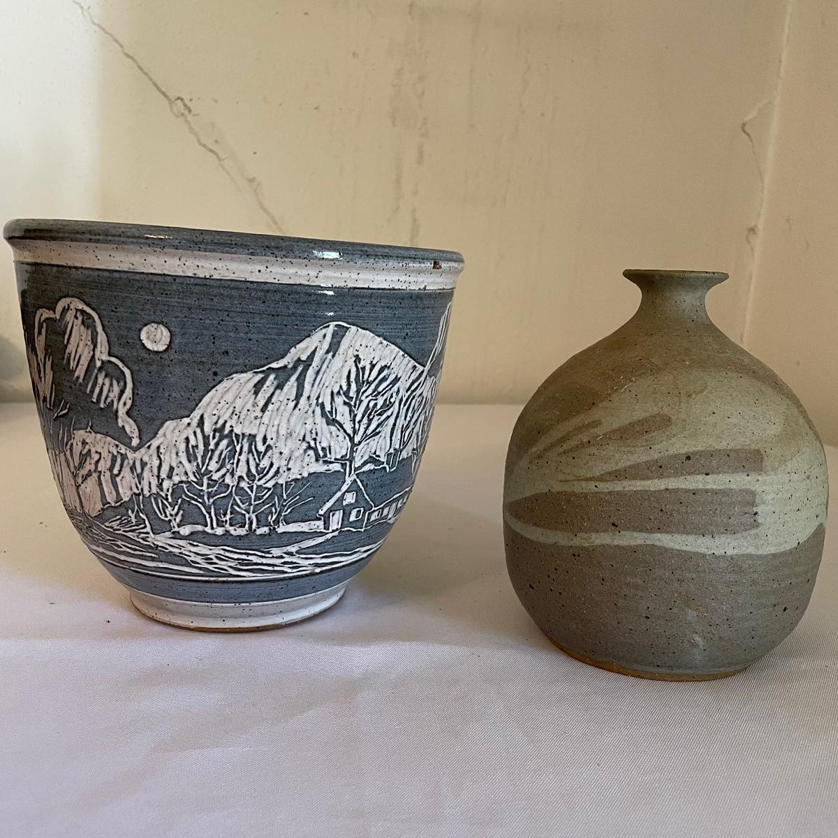 Two pieces of local pottery for you here. The speckled stoneware vase is signed by Jan Lee. The tall bowl is also speckled stoneware with a mountain/cabin scene that has been carved u to the piece. It does have a small chip near the rim and a hairline crack that is barely visible from the outside, see images.
